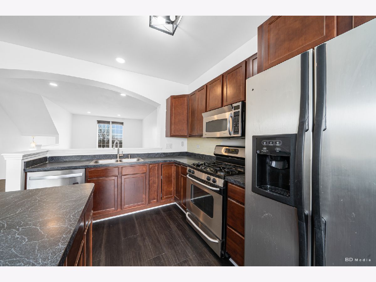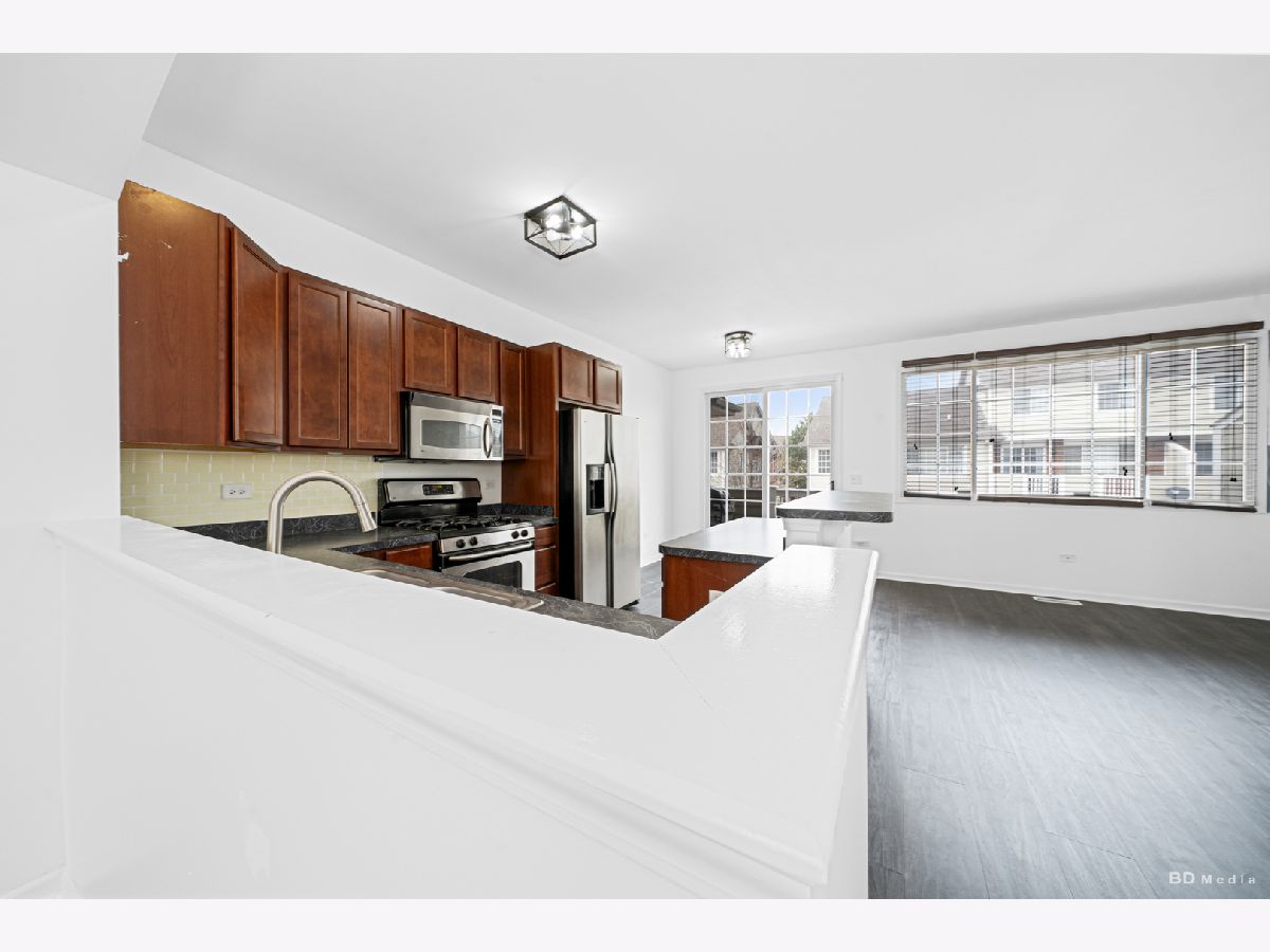 In the desirable Colette Highlands, this impeccably maintained three-story townhouse presents a sophisticated blend of classic and contemporary aesthetics, offering generous living areas distributed across three floors. The owner freshly painted the unit and installed new carpeting and flooring. The inviting living area is conducive to relaxation; meanwhile, the well-illuminated kitchen, appointed with stainless steel appliances and a sizable island incorporating a sink and dishwasher, is well-suited for culinary activities. The sizable dining area is well-suited for social functions. Access the balcony through the sliding glass doors to experience the refreshing outdoor air. This level includes a half-bath and pantry, three generously sized bedrooms, a master suite with a large walk-in closet, and an elegant ensuite bathroom. This floor has two bedrooms, one full bathroom, and a laundry closet. The property comprises an attached two-car garage. This townhome enjoys an exceptional location, proximate to shopping, dining, expressways, the Metra train station, Centennial Park, and a park, affording unparalleled convenience. See this beautiful home for yourself- you'll fall in love.