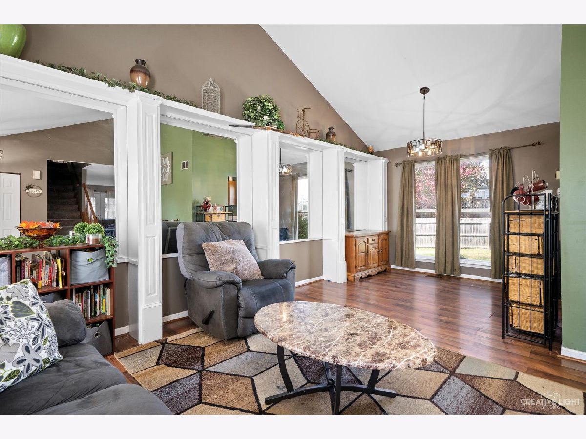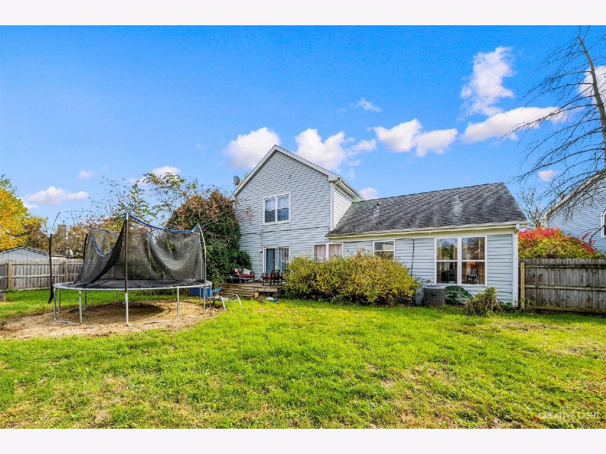 Hurry! Great cul-de-sac location! Large fenced lot! Covered front porch perfect for summer nights! Partial brick front! Some TLC needed (ie flooring) but priced accordingly! Tile entry! Open living/dining room combo with cathedral ceilings and entire built-in wall unit with mirrors and plenty of natural light! The kitchen features oak cabinetry, newer appliances and separate eating area! Cozy family room with unique double French door leading to the side deck with pergola and separate sliding door to the deck and large yard! Convenient 1st floor laundry! Spacious master bedroom with large walk-in closet and direct access to full bath! Gracious size secondary bedrooms! Finished basement with tons of flexibility for rec/play room with recessed lighting, full bath with shower and tons of storage in the crawl! Roof approx 6 years old! Quick access to I-90, train and shopping! Some work needed here but huge upside! Bring offer! Hard to get into Cobblers Crossing under $300k anymore!