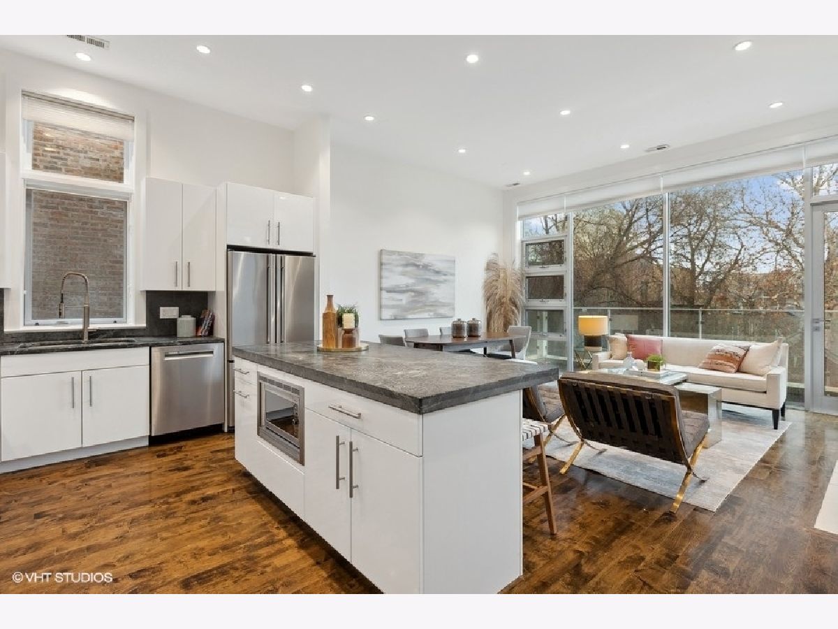 Ready to entertain in style? Look no further than this stunning 2 bed / 2 bath penthouse with full private roof deck (interior staircase + skyline views!) steps from Division Street in prime Ukrainian Village / Wicker Park. As you enter, you'll instantly fall in love with the open-concept kitchen/living/dining room-plenty of room for a dining table-and the large, floor-to-ceiling windows leading to a front balcony for grilling. Stunning, modern kitchen features newer Kitchenaid appliances + brand new Bosch dishwasher. Right off the living space, an interior staircase leads to your fully built-out private roof deck complete with fire table (it stays!) and spanning the entire length of the unit with natural gas hookups throughout the roof deck. The spacious primary suite comfortably accommodates a king-size bed, nightstands + desk or Peloton and includes a walk-in closet, primary bath with dual sinks, steam shower and separate whirlpool tub. Second bedroom is perfect for guests or a home office/exercise area. Additional highlights include: hardwood floors throughout, 11' ceilings, new HVAC and Navien tankless water heater (both newly installed December 2022), additional storage in basement and one assigned garage spot. Move in and experience everything Wicker Park has to offer!