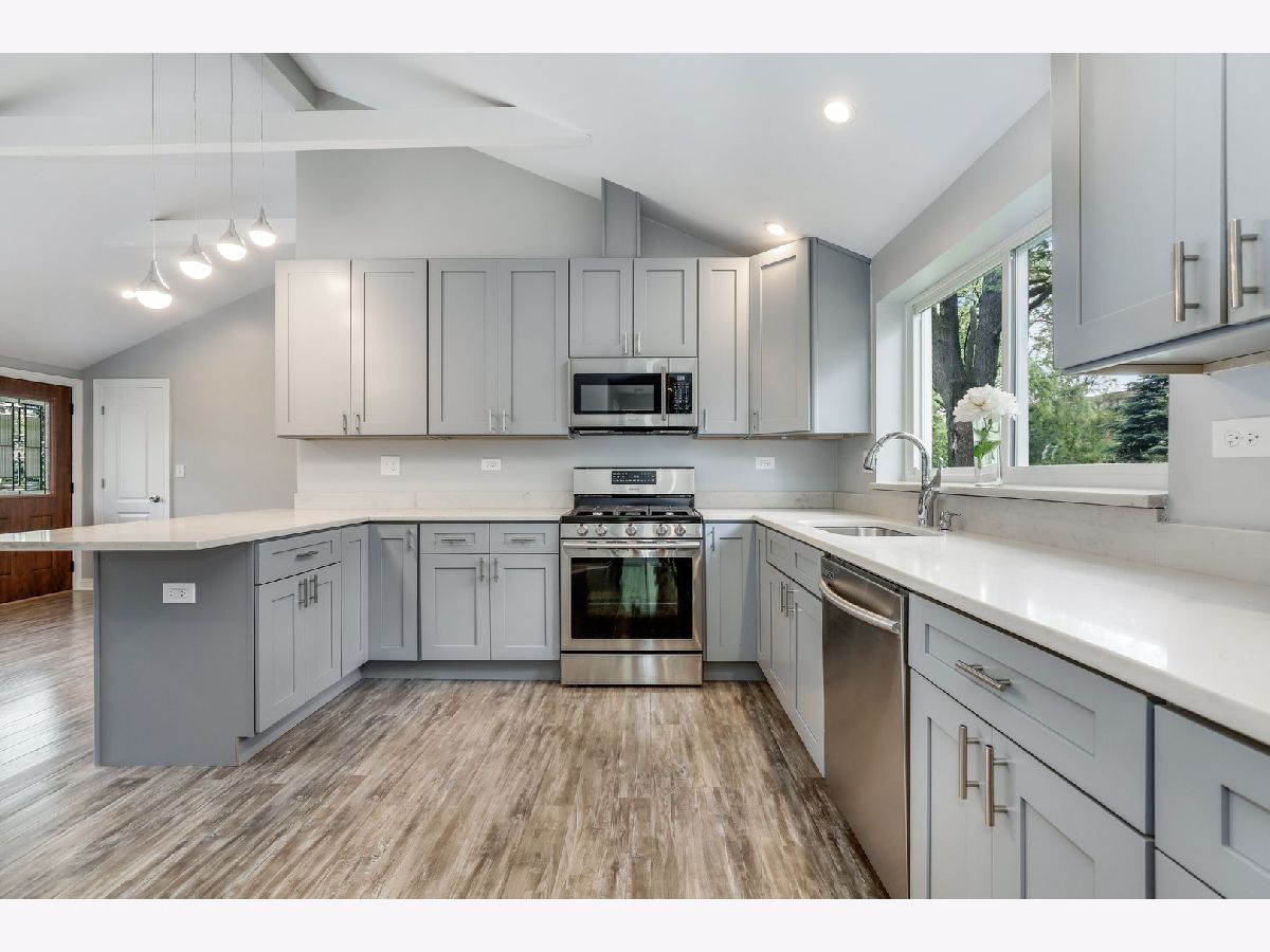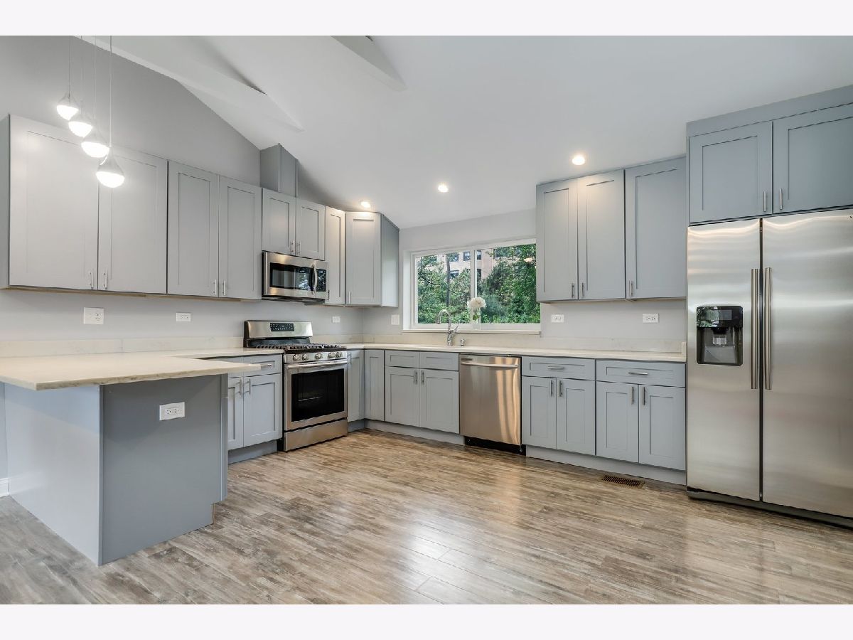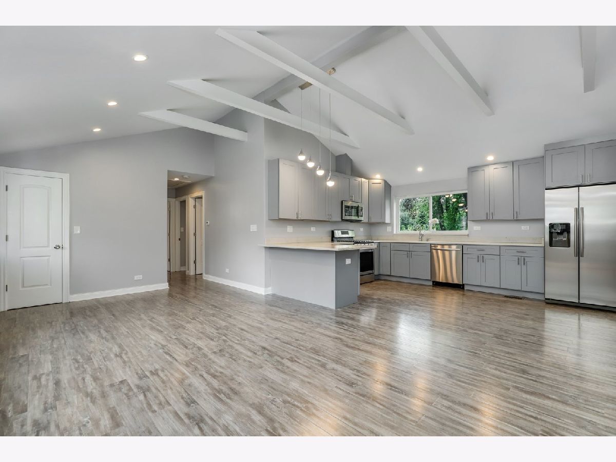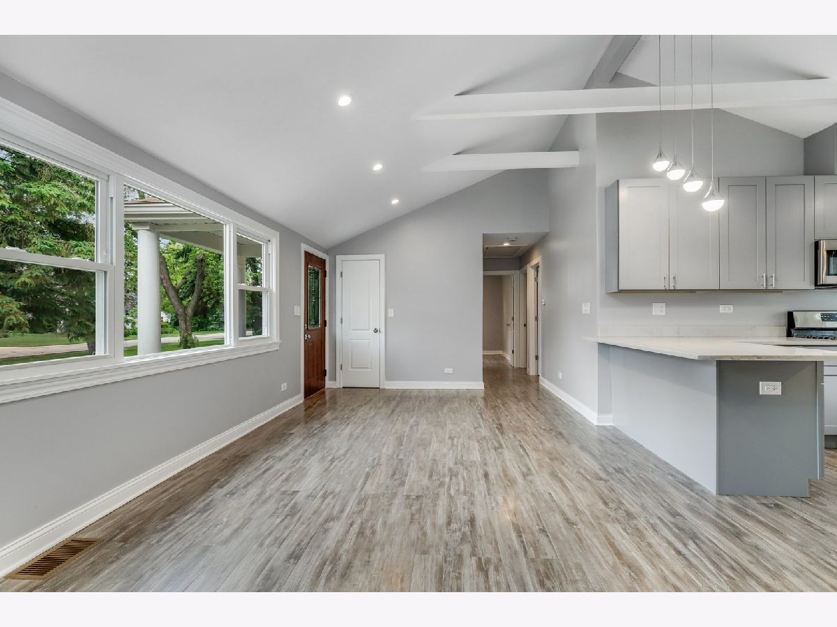 Bright, airy , beautifully renovated 3 bedroom 2 bathroom ranch on over 1/2 acre in super convenient Des Plaines location just 5 minutes from the Metra station! Totally redesigned floorplan features a gorgeous open kitchen with quartz countertops, 42" custom gray shaker cabs, all new stainless steel appliances and all new modern light fixtures. Vaulted ceilings with exposed beams and recessed lighting creates a dramatic living space. 3 ample sized bedrooms plus a bonus office space/mudroom off the garage. Both bathrooms are all-new with tub, shower, top-scale shower doors, vanities, modern lighting and stainless steel fixtures. All LED lighting throughout the property. The list goes on: all new plumbing, electric, circuit panel, brand new windows, doors, hardware, furnace, A/C, hot water heater, garage doors. Nothing to do but move-in! Huge 240ft. deep lot offers limitless potential and a gardender's dream. Long driveway straight to the 2 car garage. 5min drive to Lake Opeka, marina, sailing, boating; 3min to gourmet coffee shop, seafood restaurant, international grocery stores; Check out 3D Virtual Tour! Easy to show.