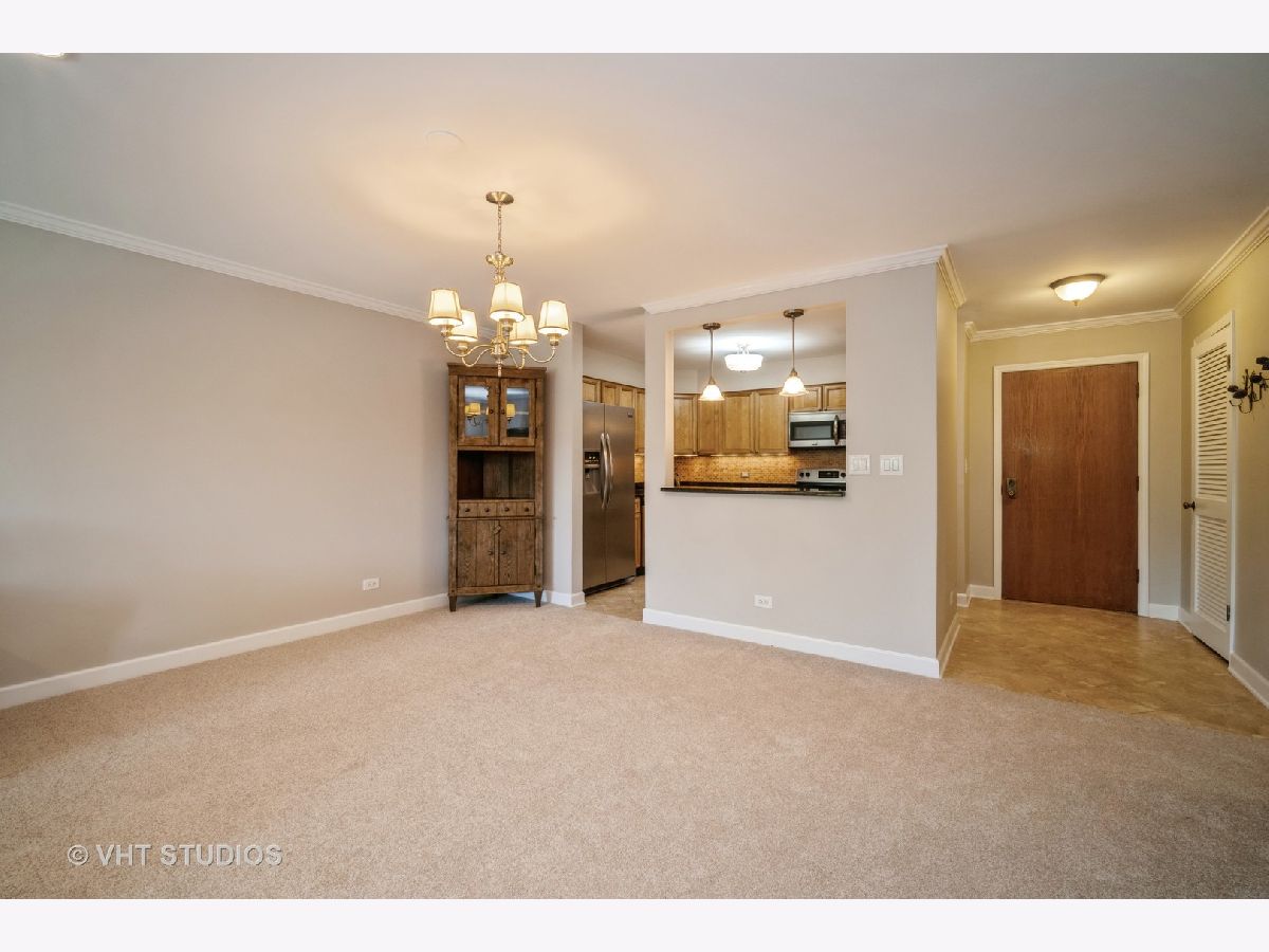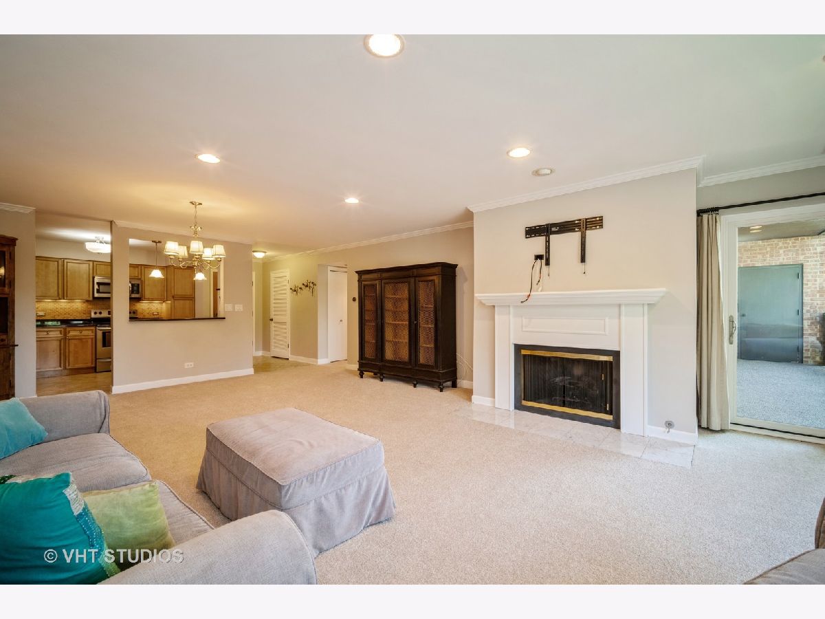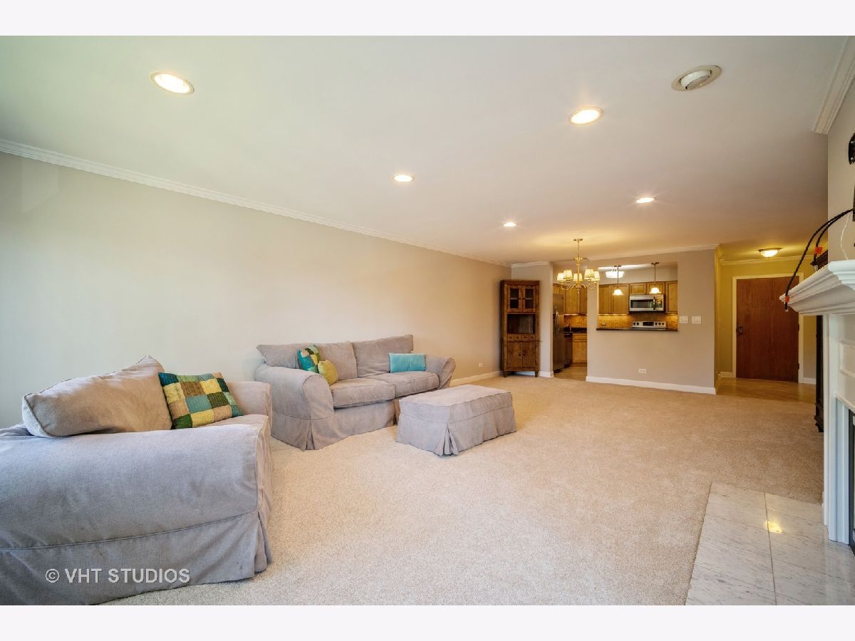Delightful completely updated unit in Shermer Square! Stunning Kitchen opens to living area & features breakfast bar, maple cabinets, granite tops, stainless appliances, ceramic floor, tile backsplash & under cabinet lighting. Living Rm & Dining Rm have recessed lighting, crown moldings & gas fireplace with classic white wood surround and mantle. Freshly painted and New Carpet throughout! Huge picture window affords lovely tree top views. Spacious covered balcony can be accessed by sliding doors in Living rm & all bedrooms. Completely updated baths with new vanities, granite tops & tile floors. Large master bedroom can easily accommodate any furniture and has a great walk in closet. In unit Laundry room has full sized washer and dryer and built in shelving for great storage. Underground parking space and additional storage area. Beautifully maintained and self-managed building. Great location- walk to shopping, train & restaurants.