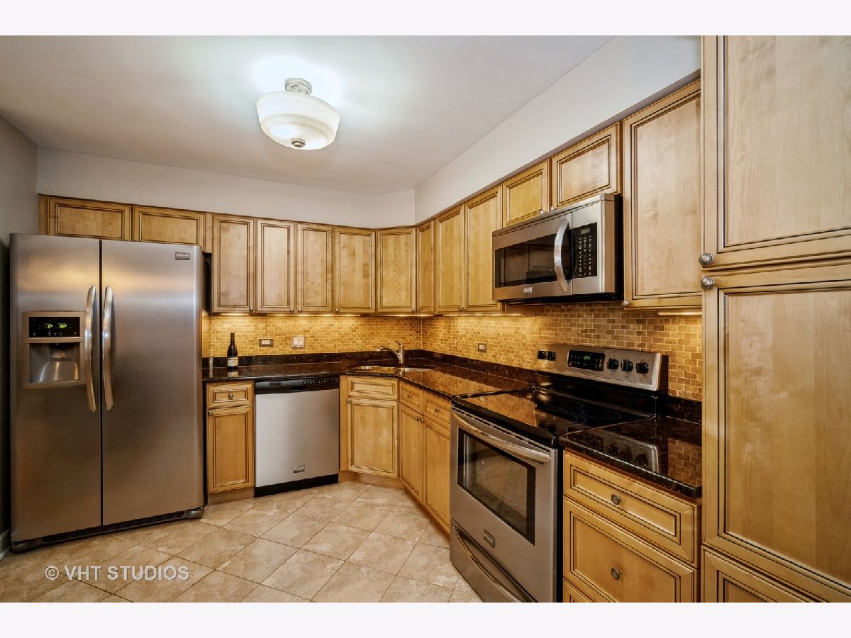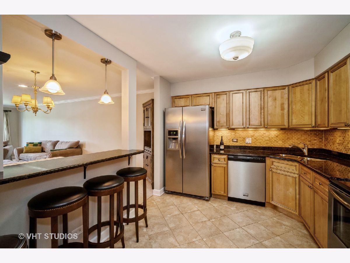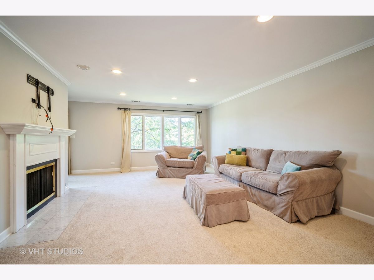 Delightful completely updated unit in Shermer Square! Stunning Kitchen opens to living area & features breakfast bar, maple cabinets, granite tops, stainless appliances, ceramic floor, tile backsplash & under cabinet lighting. Living Rm & Dining Rm have recessed lighting, crown moldings & gas fireplace with classic white wood surround and mantle. Freshly painted and New Carpet throughout! Huge picture window affords lovely tree top views. Spacious covered balcony can be accessed by sliding doors in Living rm & all bedrooms. Completely updated baths with new vanities, granite tops & tile floors. Large master bedroom can easily accommodate any furniture and has a great walk in closet. In unit Laundry room has full sized washer and dryer and built in shelving for great storage. Underground parking space and additional storage area. Beautifully maintained and self-managed building. Great location- walk to shopping, train & restaurants.