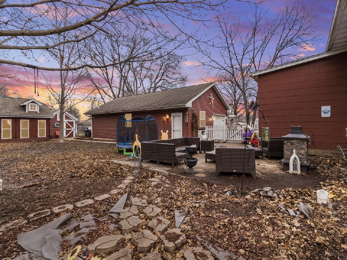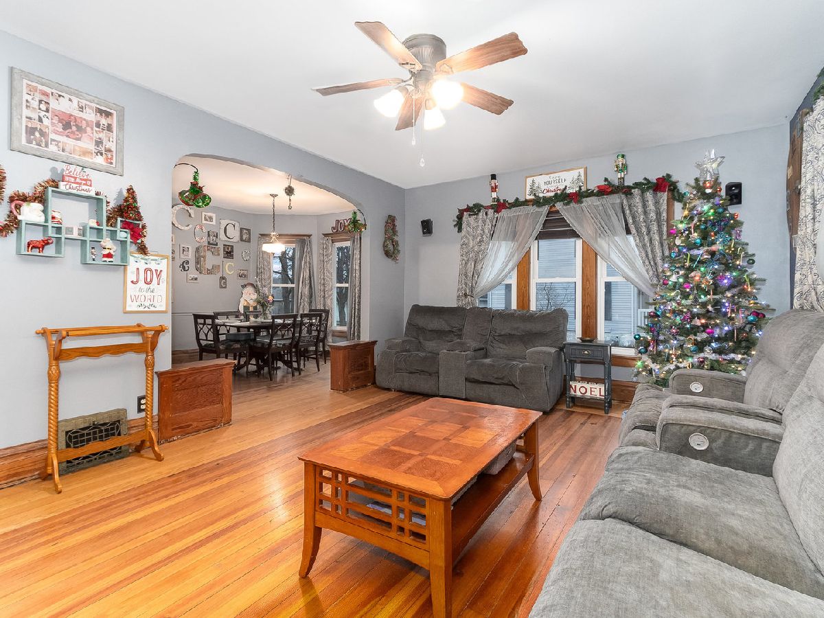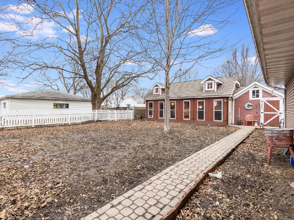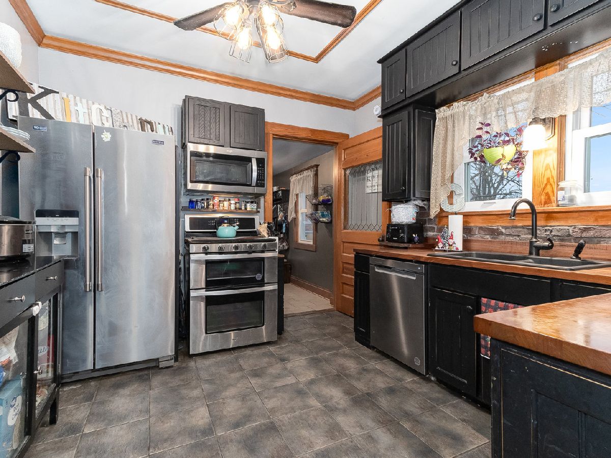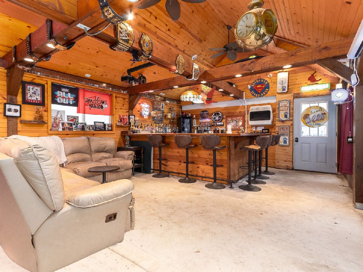 Country Living at its finest! Find yourself welcomed into this move-in ready extravagant brick bungalow accentuated by stunning ornate wooden trim, original hardwood floors, and 9' ceilings throughout the home. Feel immediately greeted by the warm gas fireplace in the 4 season room as soon as you walk inside. Continue in to find a lovely foyer and enter this spacious home discovering a large living room and separate dining room paired with a set of lovely bay windows and built in buffet. Step into the updated kitchen that features stainless steel appliances and butcher block countertops with a stylish brick backsplash and decorative ceiling. While this unique home holds two master bedrooms (one upstairs and one downstairs) each with their own full bathroom, the second-floor hosts one giant 12x30 bedroom. Head into the fully finished basement to enjoy a family room with a wet bar, tons of storage, and the adjacent master bedroom and office connected by a vast bathroom with a 100-gallon soaking tub and his and her vanity. This home is complimented by a HUGE 23x39 - 897 sq ft 4-car heated garage with a large attic for storage and a passthrough from the alley to the long driveway allowing up to 10 additional parking spots. The roomy outbuilding next to the garage provides the perfect spot for entertaining - featuring a full bar with a cozy wooden interior highlighted by the high vaulted ceilings, beautiful wooden beams, 3 ceiling fans, 2 high bar counters with taps, and matching bar stools. All of this, complimented by the perfect amount of lighting, built-in heating and AC, and a stylish detachable wall for the warmer seasons. This lavish space characterizes the welcoming social experience craved by you, your family, and your friends. (Roof 2023; Kitchen Appliances 2020+; Water Heater 2019)