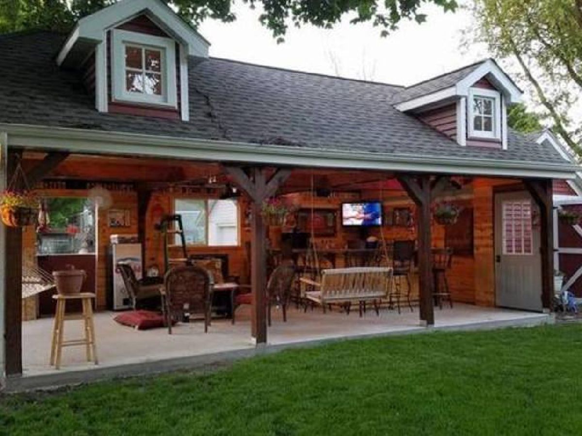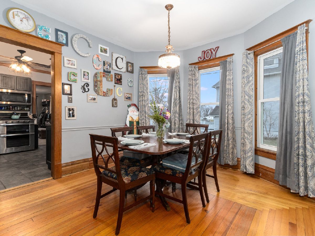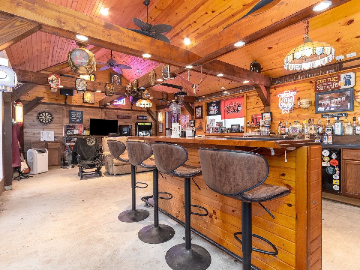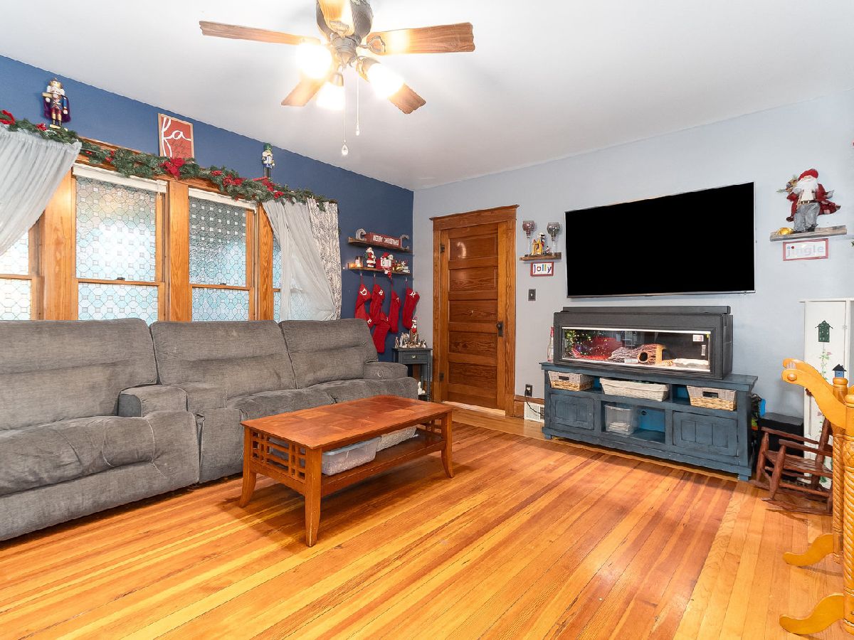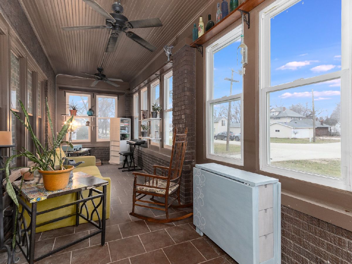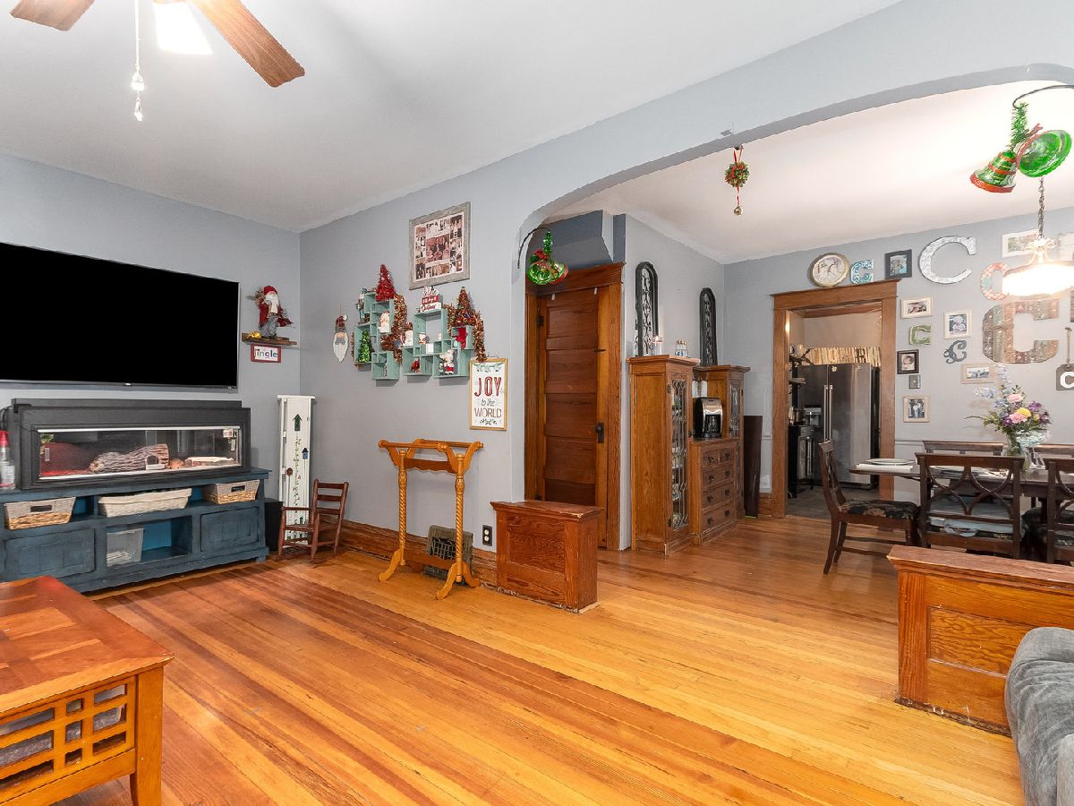 Country Living at its finest! Find yourself welcomed into this move-in ready extravagant brick bungalow accentuated by stunning ornate wooden trim, original hardwood floors, and 9' ceilings throughout the home. Feel immediately greeted by the warm gas fireplace in the 4 season room as soon as you walk inside. Continue in to find a lovely foyer and enter this spacious home discovering a large living room and separate dining room paired with a set of lovely bay windows and built in buffet. Step into the updated kitchen that features stainless steel appliances and butcher block countertops with a stylish brick backsplash and decorative ceiling. While this unique home holds two master bedrooms (one upstairs and one downstairs) each with their own full bathroom, the second-floor hosts one giant 12x30 bedroom. Head into the fully finished basement to enjoy a family room with a wet bar, tons of storage, and the adjacent master bedroom and office connected by a vast bathroom with a 100-gallon soaking tub and his and her vanity. This home is complimented by a HUGE 23x39 - 897 sq ft 4-car heated garage with a large attic for storage and a passthrough from the alley to the long driveway allowing up to 10 additional parking spots. The roomy outbuilding next to the garage provides the perfect spot for entertaining - featuring a full bar with a cozy wooden interior highlighted by the high vaulted ceilings, beautiful wooden beams, 3 ceiling fans, 2 high bar counters with taps, and matching bar stools. All of this, complimented by the perfect amount of lighting, built-in heating and AC, and a stylish detachable wall for the warmer seasons. This lavish space characterizes the welcoming social experience craved by you, your family, and your friends. (Roof 2023; Kitchen Appliances 2020+; Water Heater 2019)