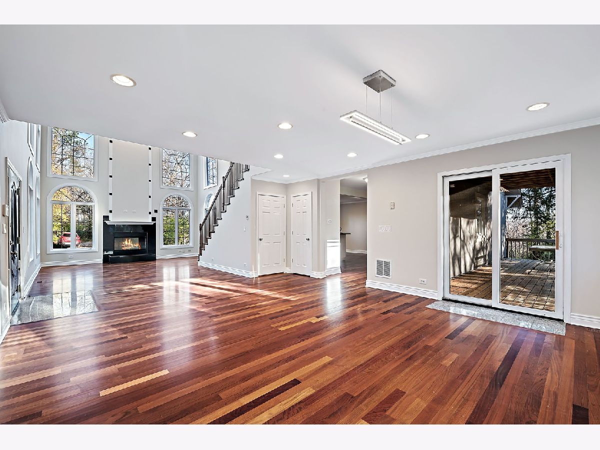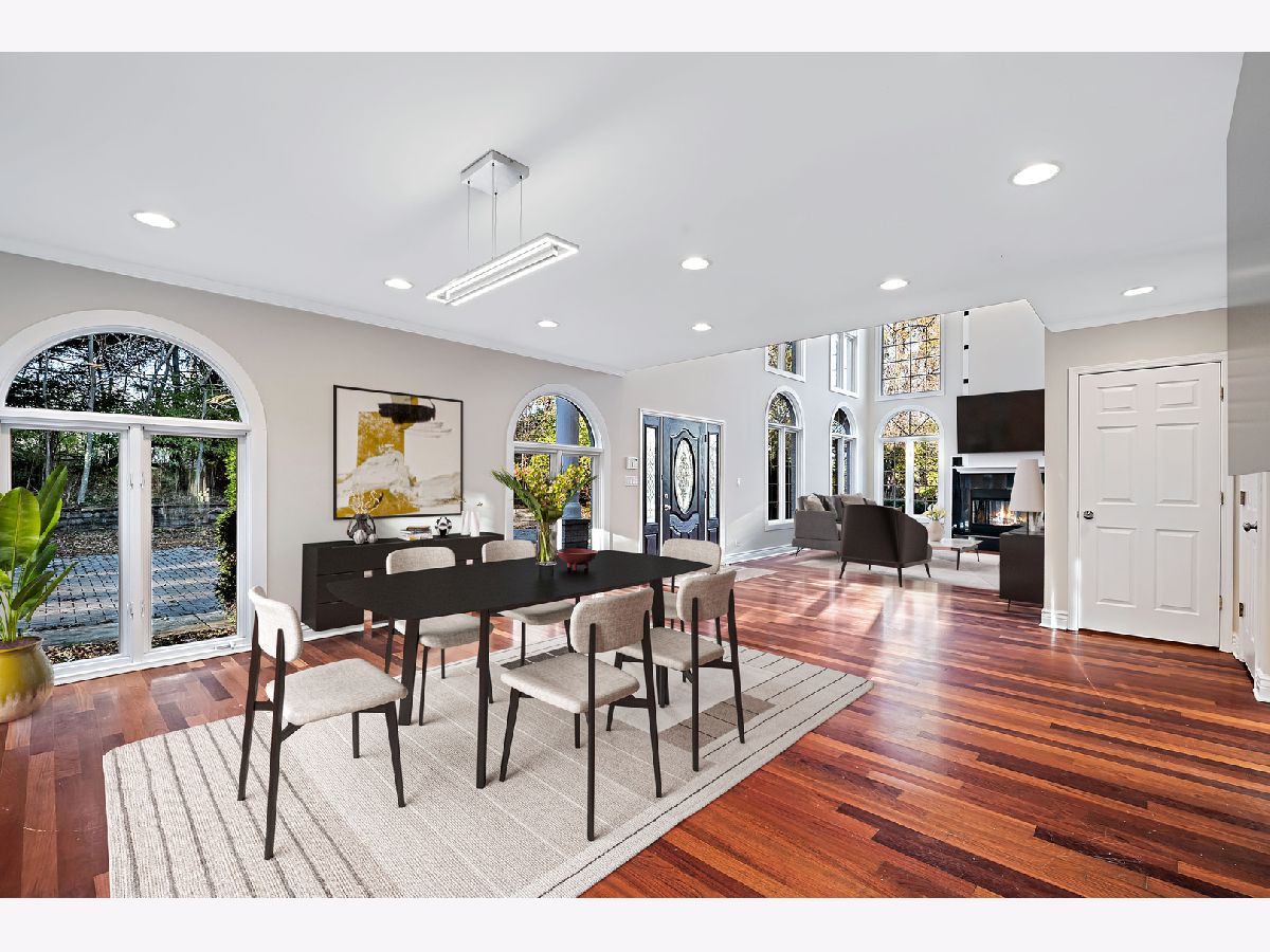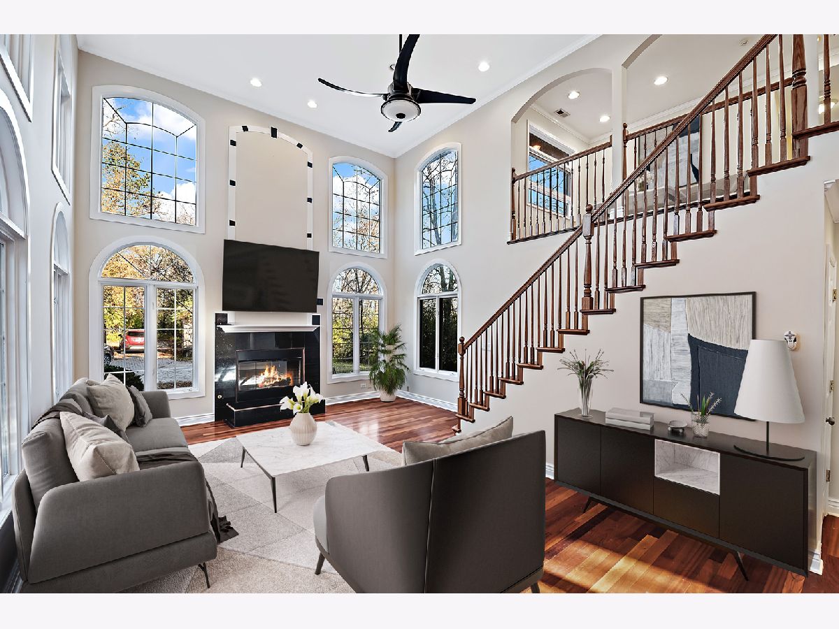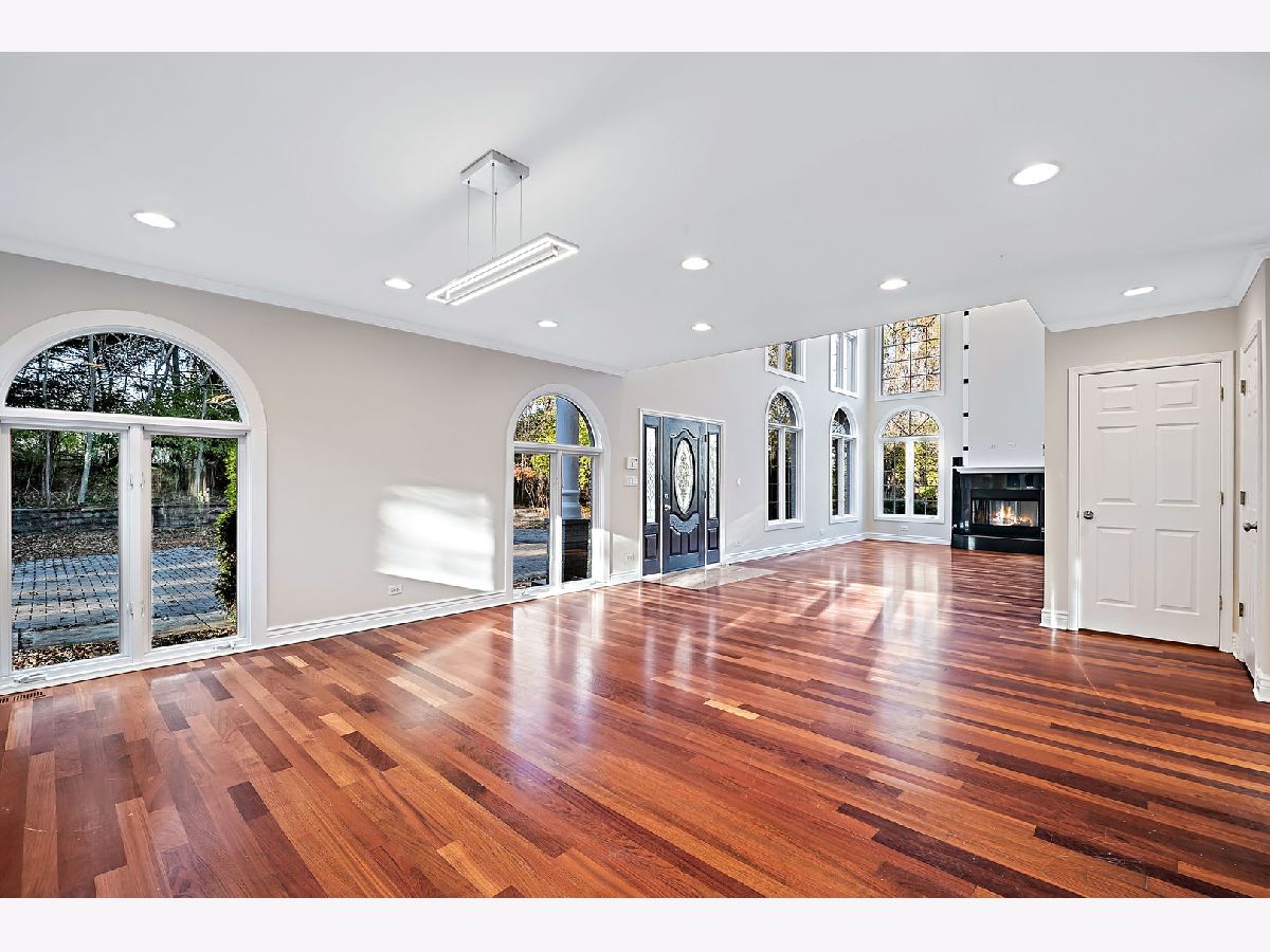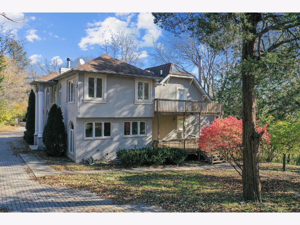 Great opportunity to own a beautifully appointed home on a wooded 4.67 acre lot. A private retreat with gated entry. Country living at its best. 5 bedrooms, 4 full and 2 half bathrooms, 3 car garage. Open floor plan and sunlit with large windows. Hardwood flooring. 2 story entry and great room with a beautiful fireplace open to the dining room.The dining room open to large deck overlooking the yard. The kitchen is open to breakfast area, has an island, stainless steel appliances, maple cabinetry and granite countertops. First floor bedroom with first floor en-suite bathroom. The luxurious primary bedroom has access to terrace overlooking the beautiful greenery and yard and ensuite primary bathroom with separate shower and tub. The second bedroom has entry to large terrace/balcony and has a fireplace. One more bedroom and a loft overlooking the 2 story great room and grand staircase. The finished lower level has a recreation room, full kitchen, plus a separate living space with bedroom, sitting room and separate walk-out entrance. Nature abounds! Great location with easy access to major roads and highways, Burr Ridge Village Center, shopping and restaurants, Lifetime Fitness and Kathy Legge Park.
