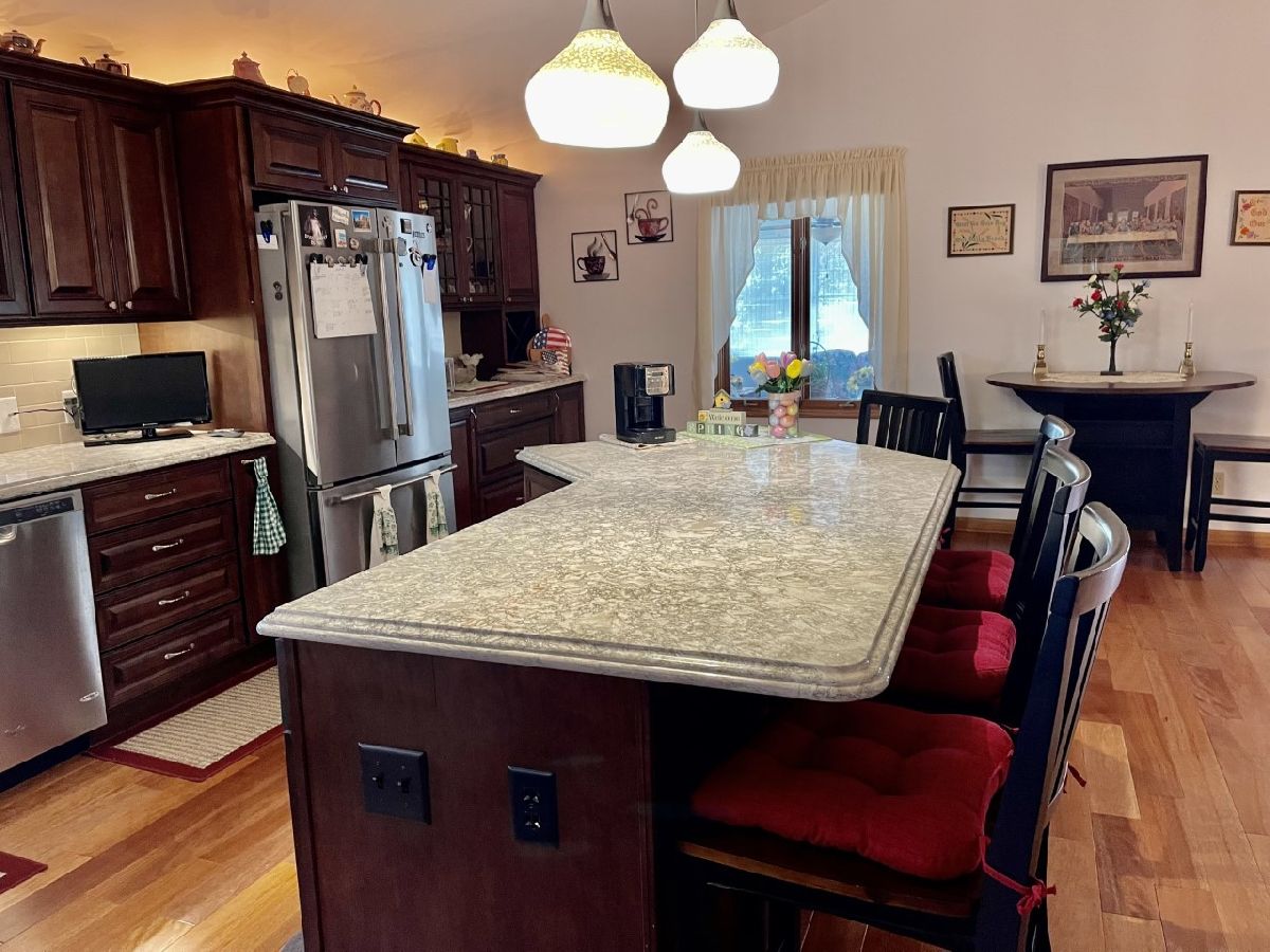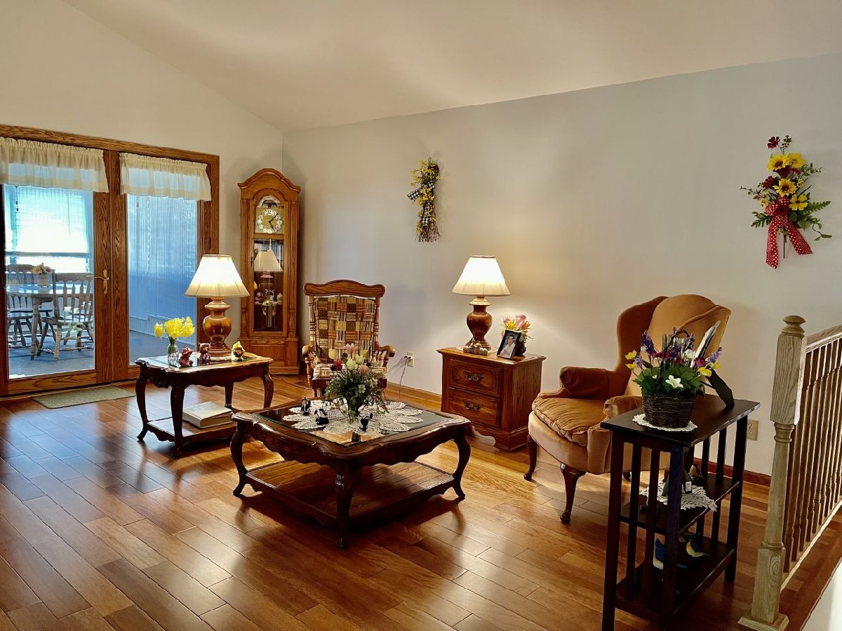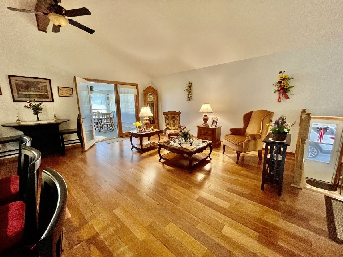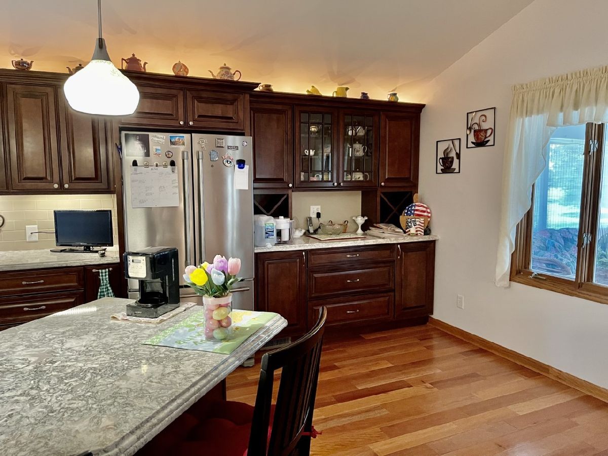 Very well maintained 3-bedroom, 2.5-bathroom, 2-car attached garage home on quiet cul-de-sac. Features include nice entry foyer with closet. Open floor plan. Spacious living room, cathedral beamed ceilings. Huge remodeled kitchen has plenty of custom cabinets with granite countertops, large center island with granite top, seating & cabinets. Glass subway tile backsplash, built in custom buffet for wine, coffee bar, etc. Appliances negotiable. Kitchen dining area. Kitchen/living room to lovely enclosed porch/3 season room. Main bedroom with 3/4 bath currently used as office, has built-in shelves and desk. 2 other very nice sized bedrooms. New hardwood floors, trim & solid 6 panel doors on main level. Lower level finished with large family room, wood burning brick fireplace and wet bar area. Rec room with pool table that stays, 1/2 bath and laundry room. Plenty of storage. Maintenance free exterior with steel & vinyl siding. Patio with privacy fence, shade trees, beautiful lawn & 2 car attached garage. Furnace & a/c 2018.