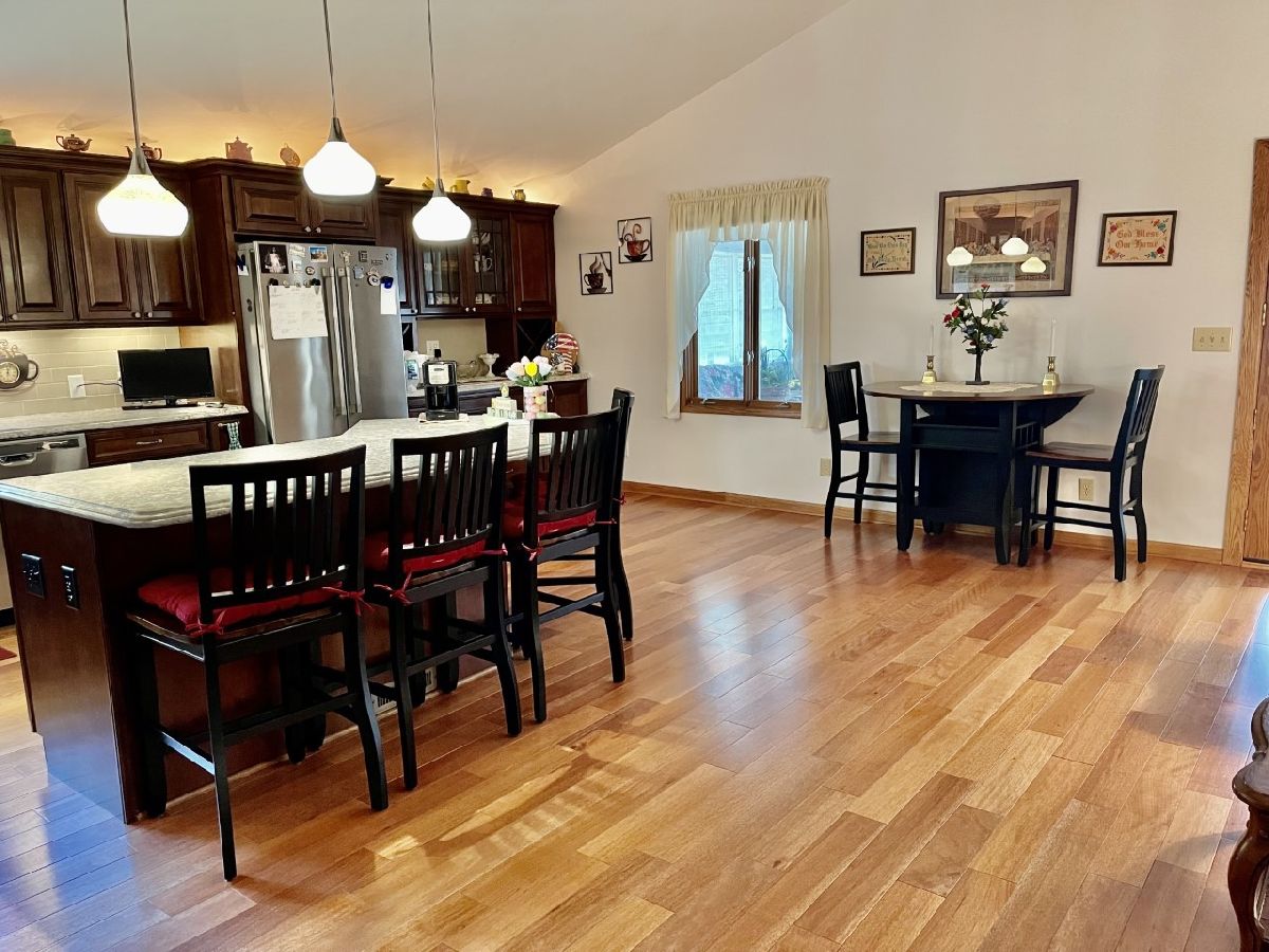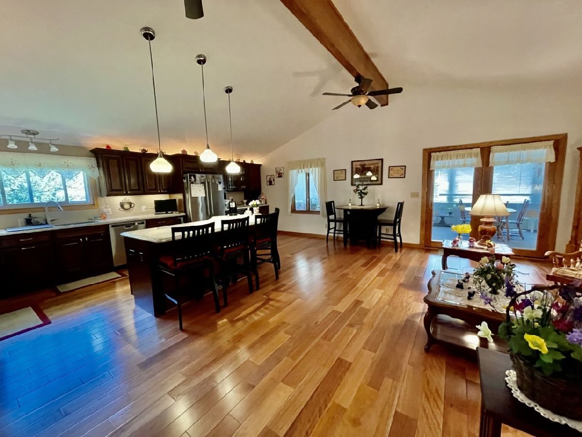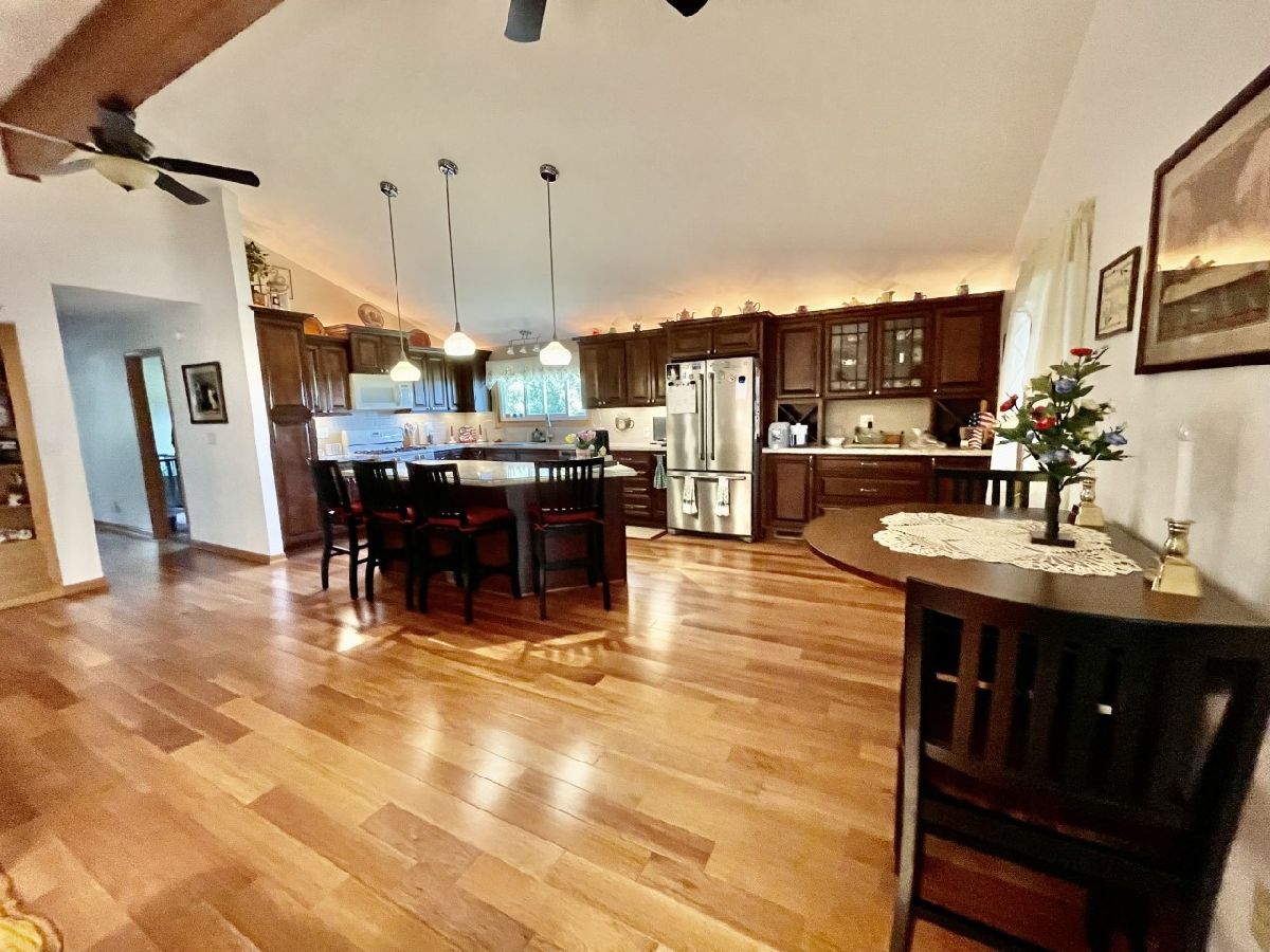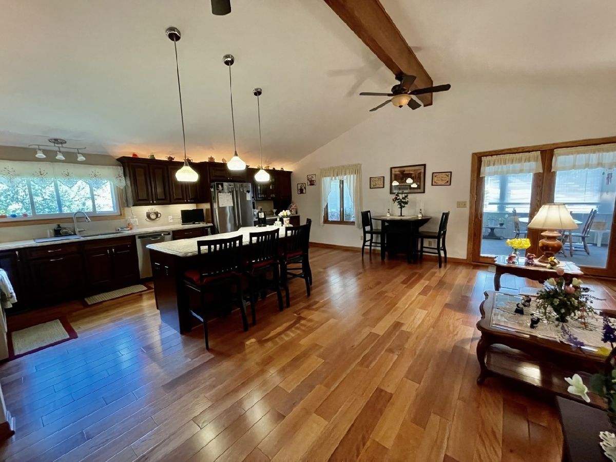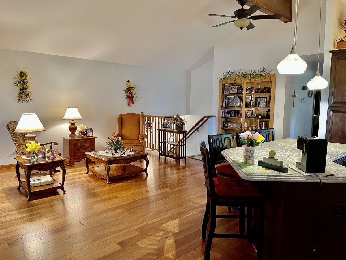 Very well maintained 3-bedroom, 2.5-bathroom, 2-car attached garage home on quiet cul-de-sac. Features include nice entry foyer with closet. Open floor plan. Spacious living room, cathedral beamed ceilings. Huge remodeled kitchen has plenty of custom cabinets with granite countertops, large center island with granite top, seating & cabinets. Glass subway tile backsplash, built in custom buffet for wine, coffee bar, etc. Appliances negotiable. Kitchen dining area. Kitchen/living room to lovely enclosed porch/3 season room. Main bedroom with 3/4 bath currently used as office, has built-in shelves and desk. 2 other very nice sized bedrooms. New hardwood floors, trim & solid 6 panel doors on main level. Lower level finished with large family room, wood burning brick fireplace and wet bar area. Rec room with pool table that stays, 1/2 bath and laundry room. Plenty of storage. Maintenance free exterior with steel & vinyl siding. Patio with privacy fence, shade trees, beautiful lawn & 2 car attached garage. Furnace & a/c 2018.