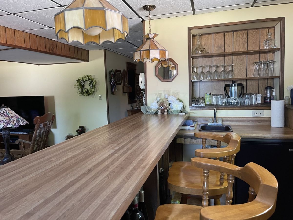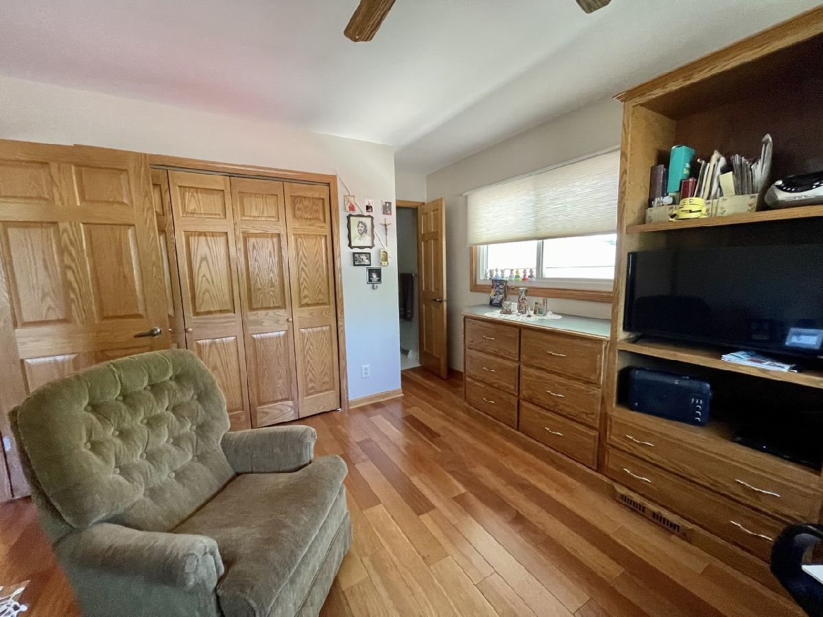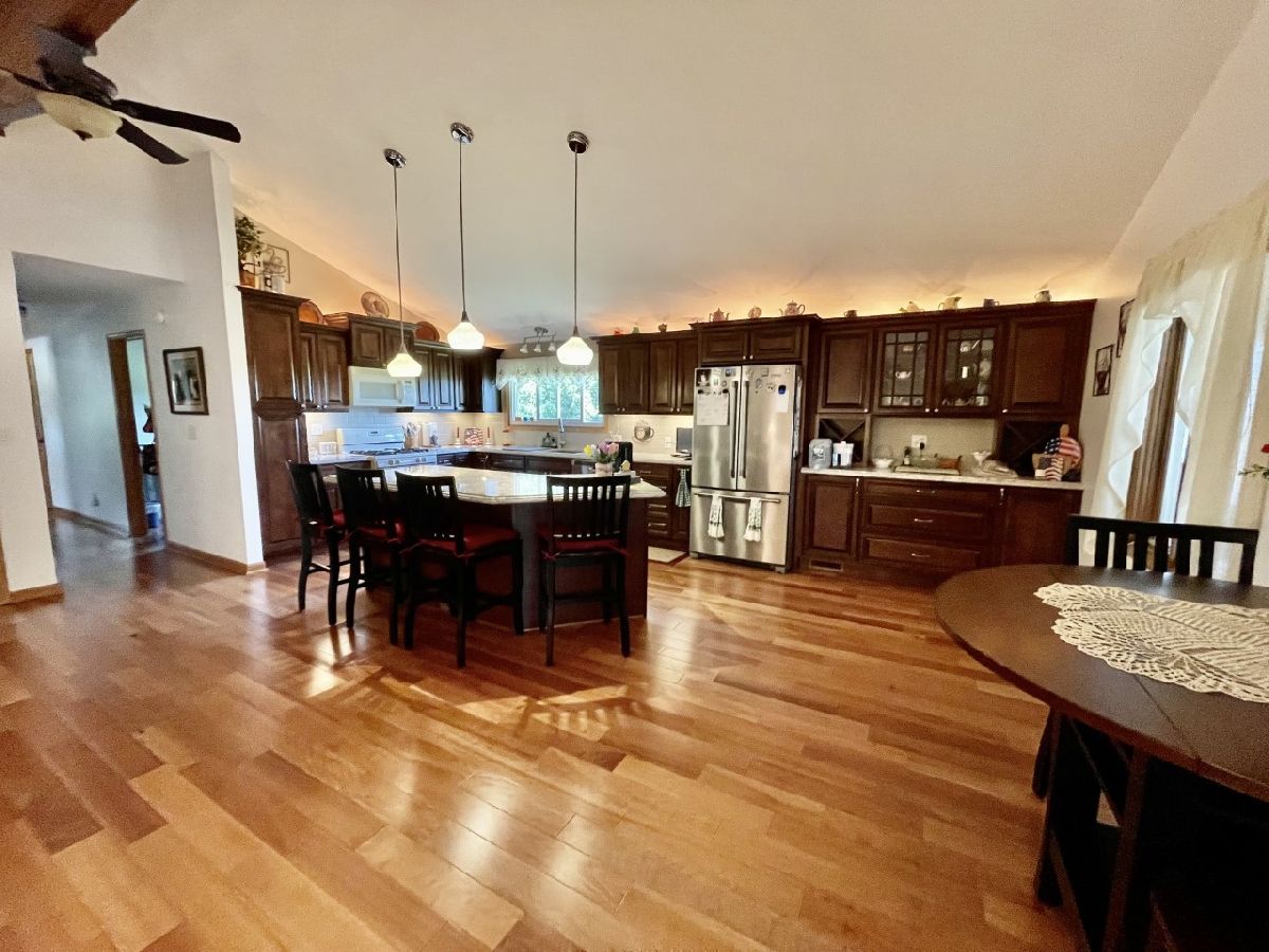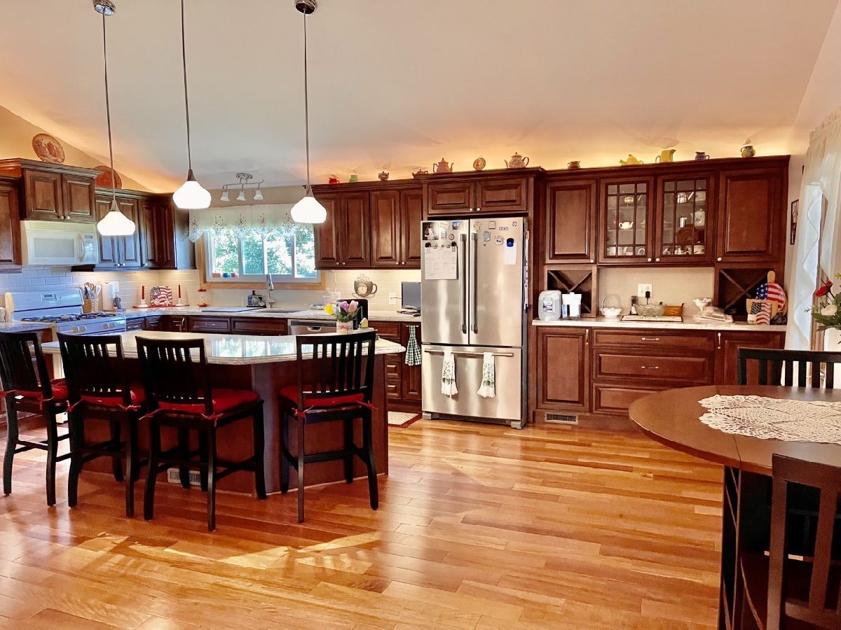 Very well maintained 3-bedroom, 2.5-bathroom, 2-car attached garage home on quiet cul-de-sac. Features include nice entry foyer with closet. Open floor plan. Spacious living room, cathedral beamed ceilings. Huge remodeled kitchen has plenty of custom cabinets with granite countertops, large center island with granite top, seating & cabinets. Glass subway tile backsplash, built in custom buffet for wine, coffee bar, etc. Appliances negotiable. Kitchen dining area. Kitchen/living room to lovely enclosed porch/3 season room. Main bedroom with 3/4 bath currently used as office, has built-in shelves and desk. 2 other very nice sized bedrooms. New hardwood floors, trim & solid 6 panel doors on main level. Lower level finished with large family room, wood burning brick fireplace and wet bar area. Rec room with pool table that stays, 1/2 bath and laundry room. Plenty of storage. Maintenance free exterior with steel & vinyl siding. Patio with privacy fence, shade trees, beautiful lawn & 2 car attached garage. Furnace & a/c 2018.