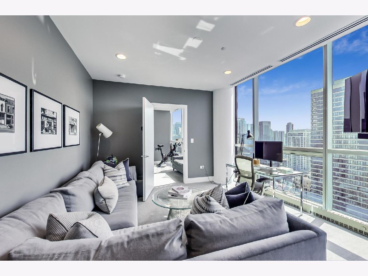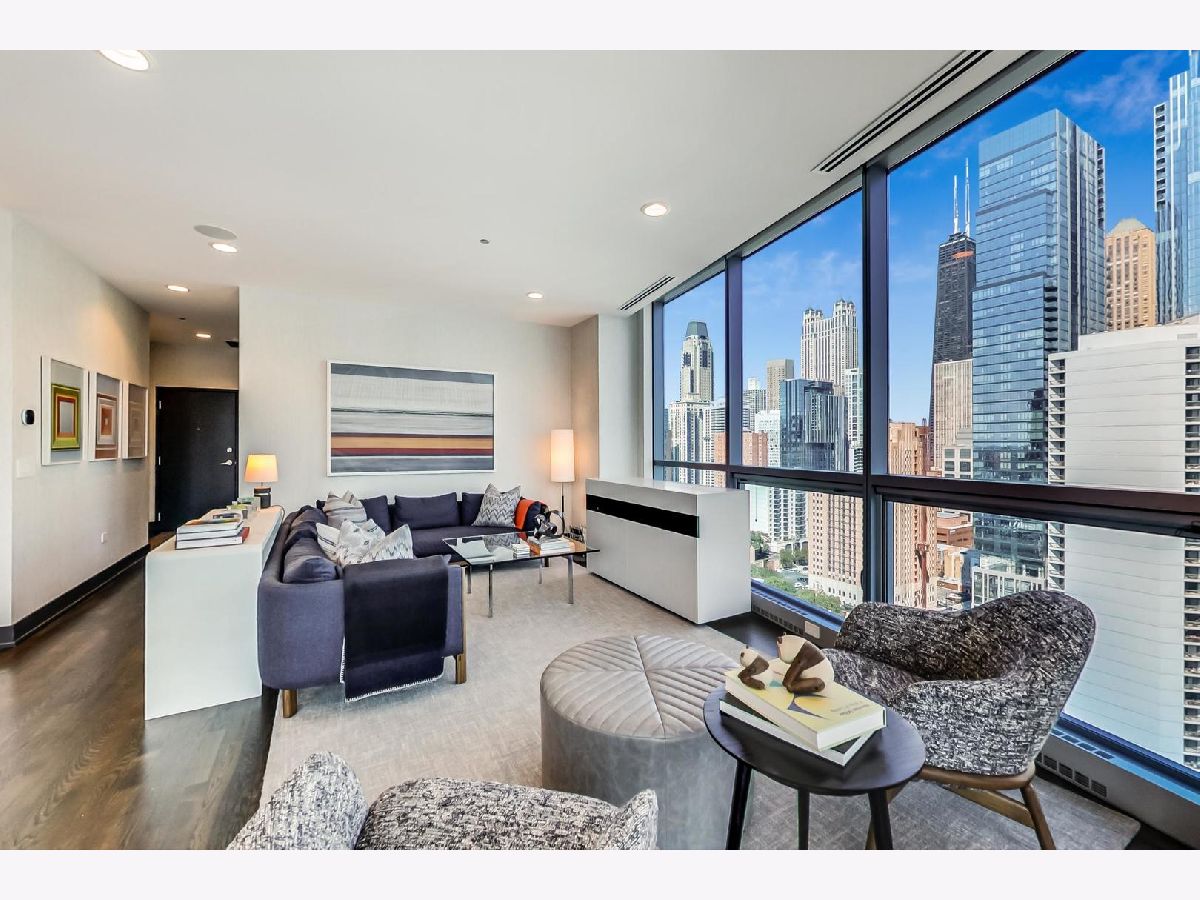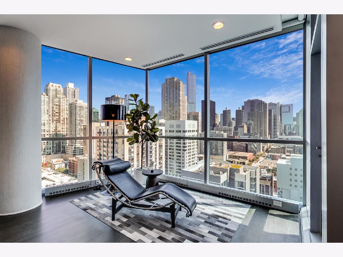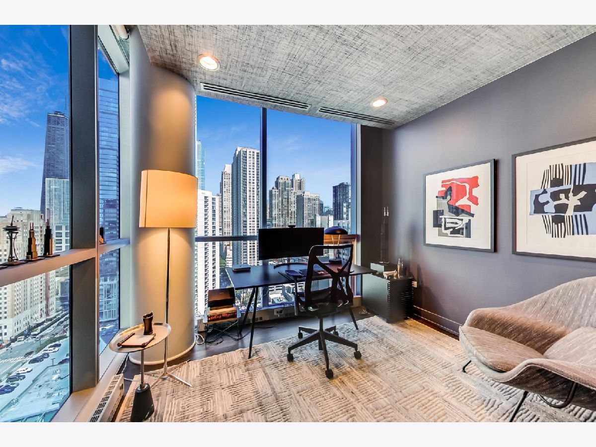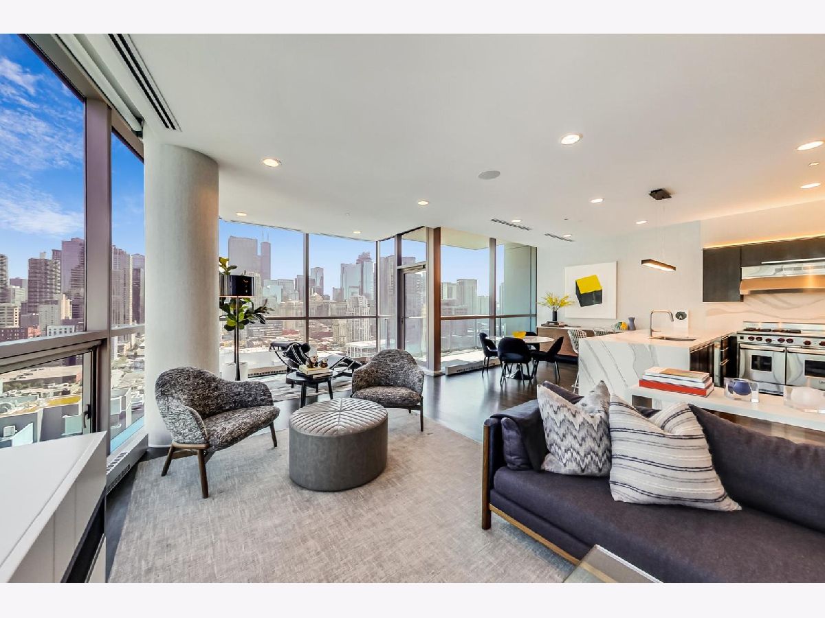 One of a kind, featured in Modern Luxury Magazine, reconfigured 3 bed plus office/den 3 bath 2020 renovated condo designed by Michael Abrams Interiors in River North boutique hi-rise! Highly sought after SE tier w/ breathtaking city views and two oversized terraces. Walk into an expansive living space with floor-to-ceiling windows and panoramic views. Newly improved throughout with Phillip Jeffries wall coverings, LED cans, motorized Hunter Douglas shades, Ecobee thermostats, & refinished hardwood floors. Updated Chef's kitchen w/ premium 48' Wolf range, Subzero refrigerator, Bosch dishwasher, Bosch microwave drawer, new Cambria Quartz waterfall counter tops & backsplash, upgraded LED ambient up-lighting and designer LED chandelier. Primary bedroom customized with Designer sconces, wool carpeting, and two LARGE walk-in newly customized closets. GUT RENOVATED Primary bathroom w/ natural stone throughout, matte black Kohler fixtures, custom double vanity w/ tower for added storage and Cambria Quartz tops, oversized rain shower w/ bench, Victoria + Albert matte black freestanding tub, heated floors, custom mirrors, and ambient lighting. Spacious 2nd bedroom was reconfigured to include a separate office/den/workout room. 2nd bath includes a walk-in shower, new sconce/mirror. All bedrooms have walk-in closets. 3rd bathroom off the entry designed with new Cambria banjo counter top and new mirror, new designer pendant lighting, Jacuzzi tub, & new custom shower curtain track with designer draperies. Full laundry room with side by side newer LG front loading washer & dryer & added storage. Other improvements include custom closets throughout, new efficient Panasonic bathroom vents, 4 HVAC systems, built-in ceiling sound system throughout. Extensive electrical upgrades include additional can lamps, adjustable art cans, all new outlets/switches/dimmers, and wiring to support multiple AV locations. Google WiFi included. 24-hr door staff, new exercise room & conference room, roof deck, WIFI/internet on first flr, storage. Excellently managed with strong reserves. Two heated garage spaces included within the sales price.