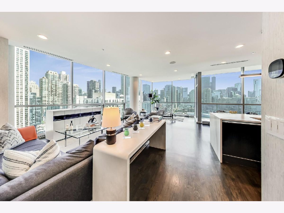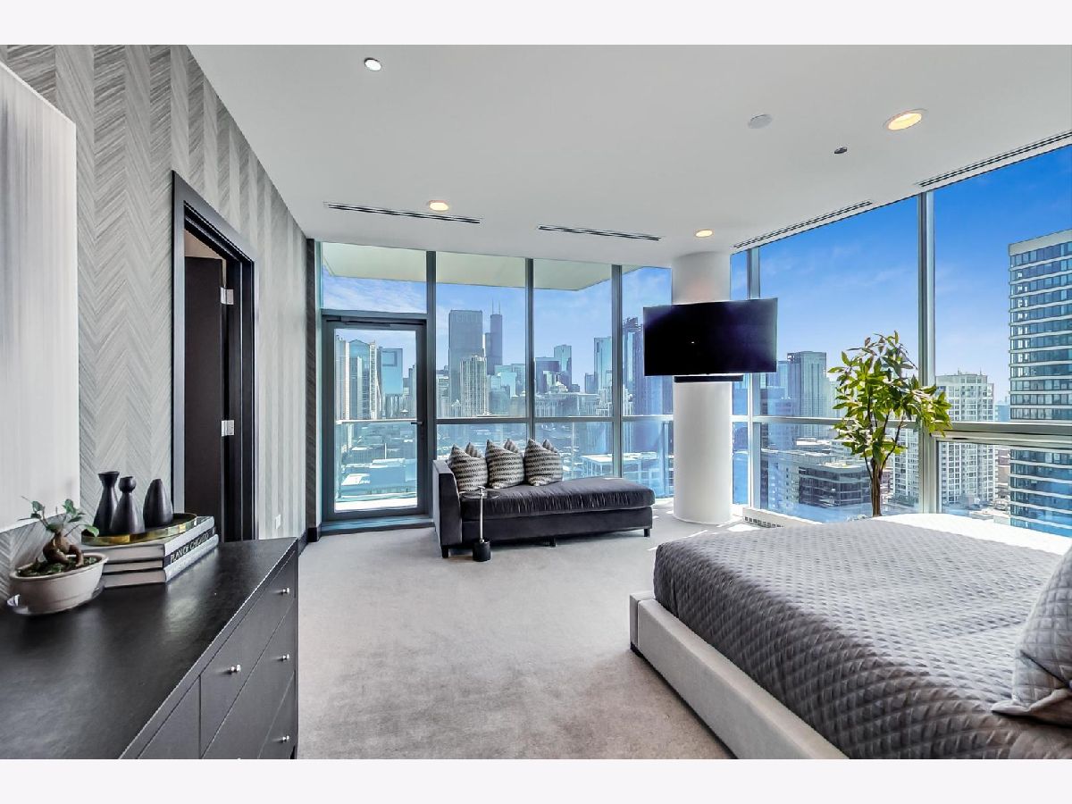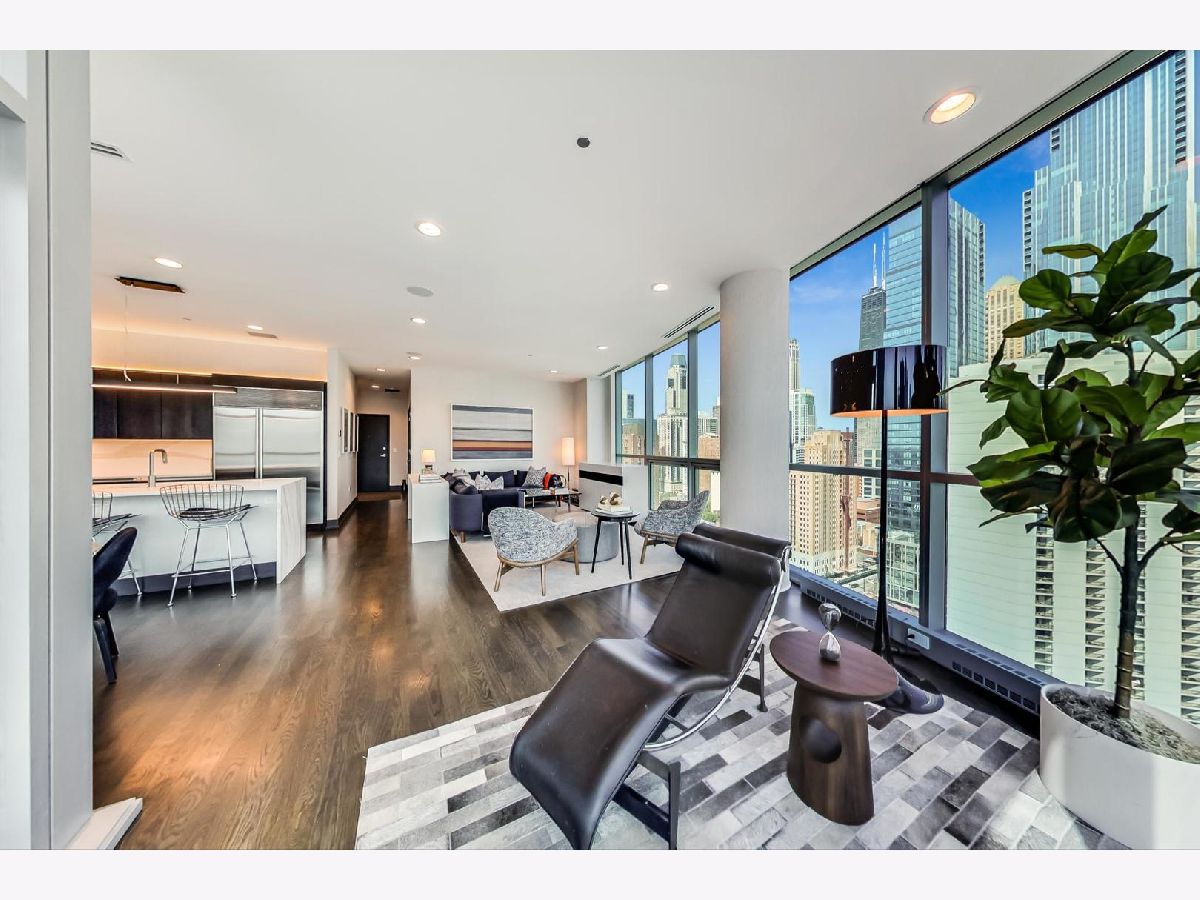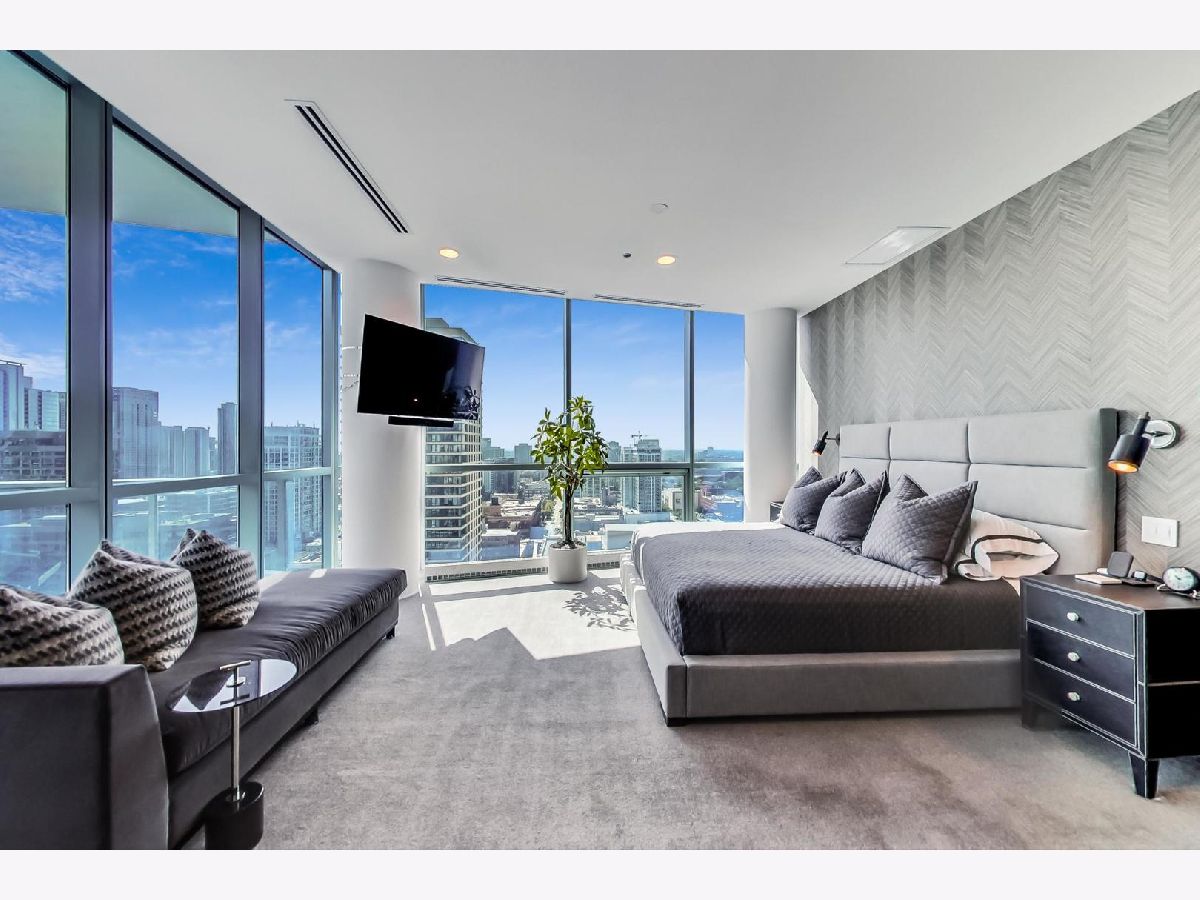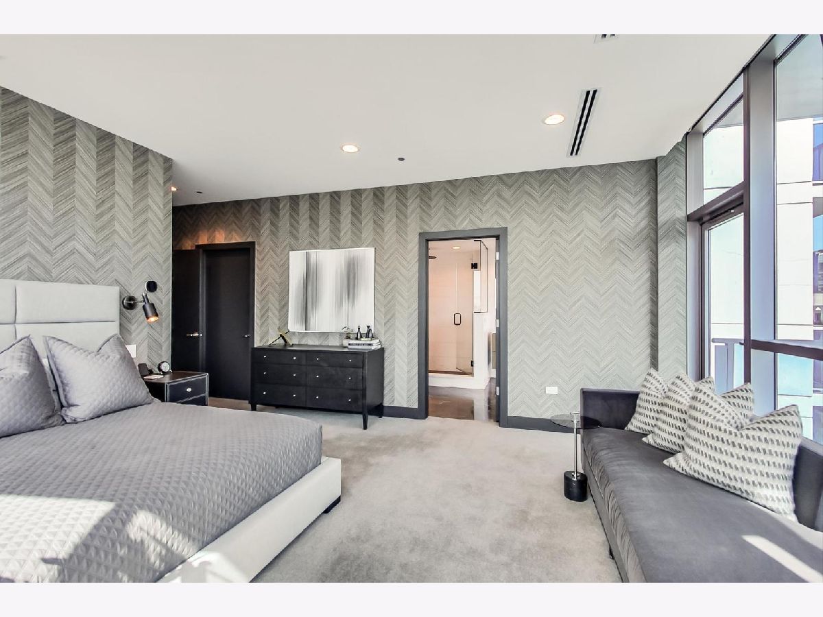 One of a kind, featured in Modern Luxury Magazine, reconfigured 3 bed plus office/den 3 bath 2020 renovated condo designed by Michael Abrams Interiors in River North boutique hi-rise! Highly sought after SE tier w/ breathtaking city views and two oversized terraces. Walk into an expansive living space with floor-to-ceiling windows and panoramic views. Newly improved throughout with Phillip Jeffries wall coverings, LED cans, motorized Hunter Douglas shades, Ecobee thermostats, & refinished hardwood floors. Updated Chef's kitchen w/ premium 48' Wolf range, Subzero refrigerator, Bosch dishwasher, Bosch microwave drawer, new Cambria Quartz waterfall counter tops & backsplash, upgraded LED ambient up-lighting and designer LED chandelier. Primary bedroom customized with Designer sconces, wool carpeting, and two LARGE walk-in newly customized closets. GUT RENOVATED Primary bathroom w/ natural stone throughout, matte black Kohler fixtures, custom double vanity w/ tower for added storage and Cambria Quartz tops, oversized rain shower w/ bench, Victoria + Albert matte black freestanding tub, heated floors, custom mirrors, and ambient lighting. Spacious 2nd bedroom was reconfigured to include a separate office/den/workout room. 2nd bath includes a walk-in shower, new sconce/mirror. All bedrooms have walk-in closets. 3rd bathroom off the entry designed with new Cambria banjo counter top and new mirror, new designer pendant lighting, Jacuzzi tub, & new custom shower curtain track with designer draperies. Full laundry room with side by side newer LG front loading washer & dryer & added storage. Other improvements include custom closets throughout, new efficient Panasonic bathroom vents, 4 HVAC systems, built-in ceiling sound system throughout. Extensive electrical upgrades include additional can lamps, adjustable art cans, all new outlets/switches/dimmers, and wiring to support multiple AV locations. Google WiFi included. 24-hr door staff, new exercise room & conference room, roof deck, WIFI/internet on first flr, storage. Excellently managed with strong reserves. Two heated garage spaces included within the sales price.