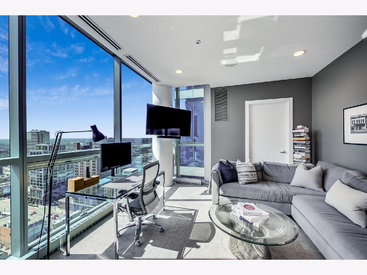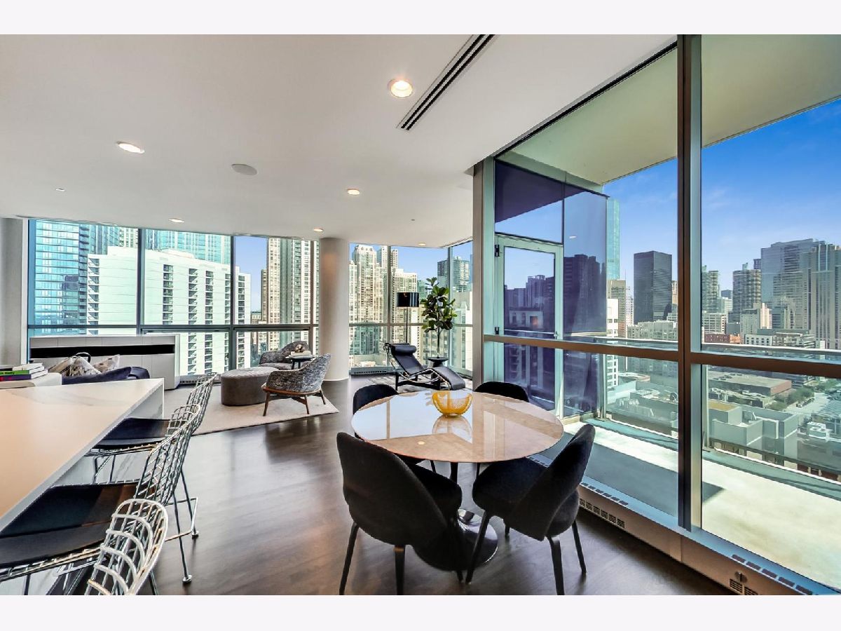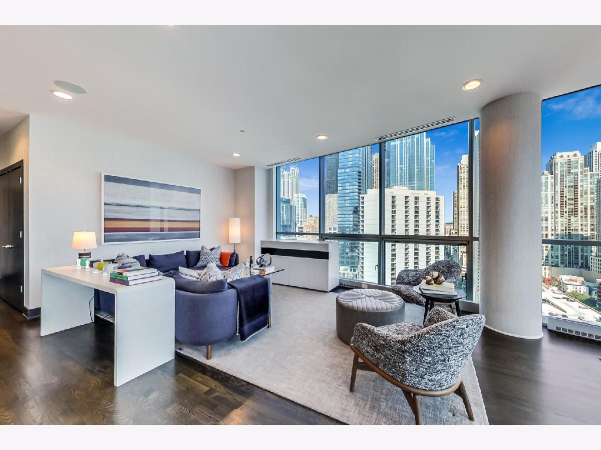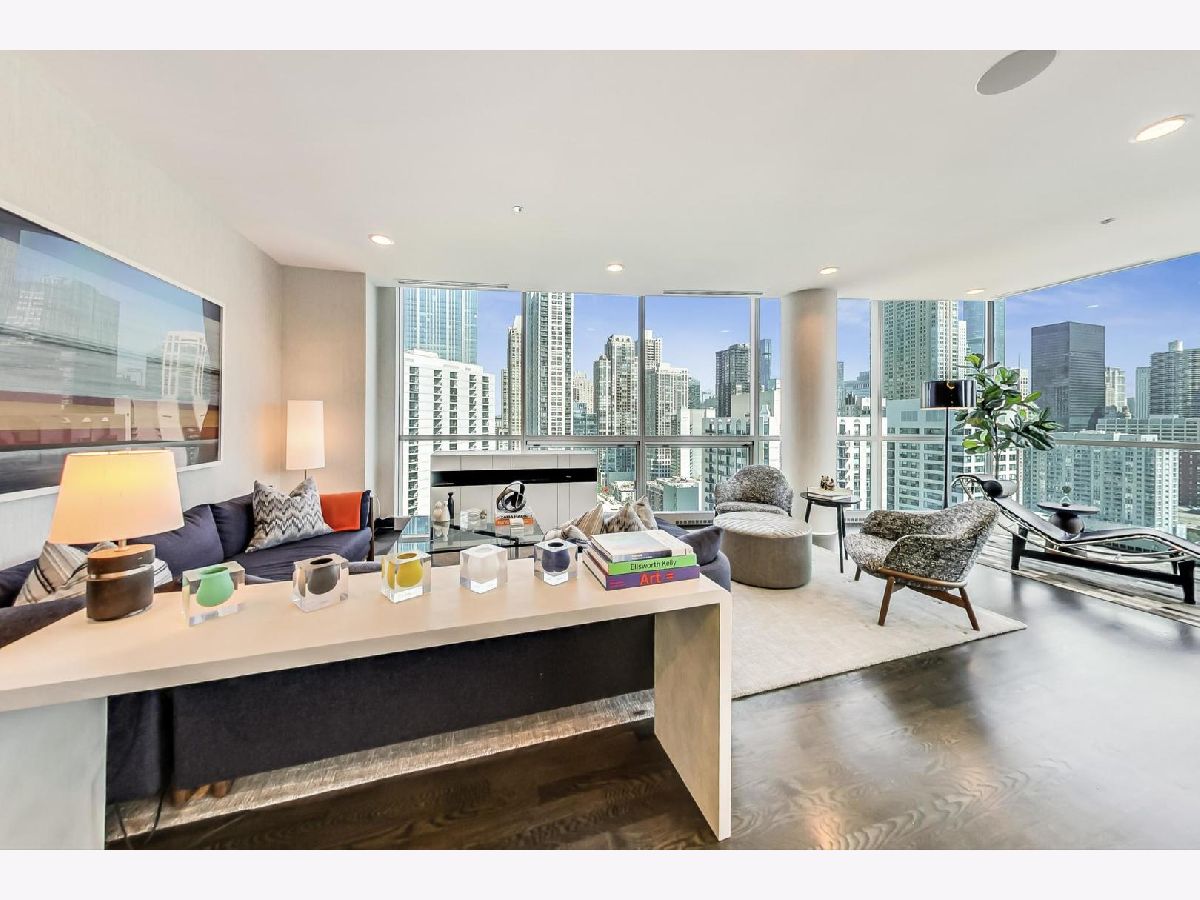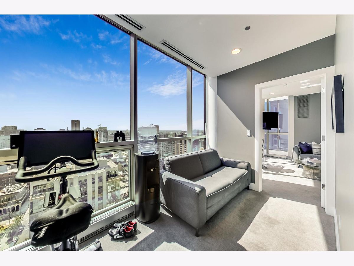 One of a kind, featured in Modern Luxury Magazine, reconfigured 3 bed plus office/den 3 bath 2020 renovated condo designed by Michael Abrams Interiors in River North boutique hi-rise! Highly sought after SE tier w/ breathtaking city views and two oversized terraces. Walk into an expansive living space with floor-to-ceiling windows and panoramic views. Newly improved throughout with Phillip Jeffries wall coverings, LED cans, motorized Hunter Douglas shades, Ecobee thermostats, & refinished hardwood floors. Updated Chef's kitchen w/ premium 48' Wolf range, Subzero refrigerator, Bosch dishwasher, Bosch microwave drawer, new Cambria Quartz waterfall counter tops & backsplash, upgraded LED ambient up-lighting and designer LED chandelier. Primary bedroom customized with Designer sconces, wool carpeting, and two LARGE walk-in newly customized closets. GUT RENOVATED Primary bathroom w/ natural stone throughout, matte black Kohler fixtures, custom double vanity w/ tower for added storage and Cambria Quartz tops, oversized rain shower w/ bench, Victoria + Albert matte black freestanding tub, heated floors, custom mirrors, and ambient lighting. Spacious 2nd bedroom was reconfigured to include a separate office/den/workout room. 2nd bath includes a walk-in shower, new sconce/mirror. All bedrooms have walk-in closets. 3rd bathroom off the entry designed with new Cambria banjo counter top and new mirror, new designer pendant lighting, Jacuzzi tub, & new custom shower curtain track with designer draperies. Full laundry room with side by side newer LG front loading washer & dryer & added storage. Other improvements include custom closets throughout, new efficient Panasonic bathroom vents, 4 HVAC systems, built-in ceiling sound system throughout. Extensive electrical upgrades include additional can lamps, adjustable art cans, all new outlets/switches/dimmers, and wiring to support multiple AV locations. Google WiFi included. 24-hr door staff, new exercise room & conference room, roof deck, WIFI/internet on first flr, storage. Excellently managed with strong reserves. Two heated garage spaces included within the sales price.