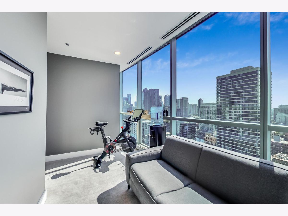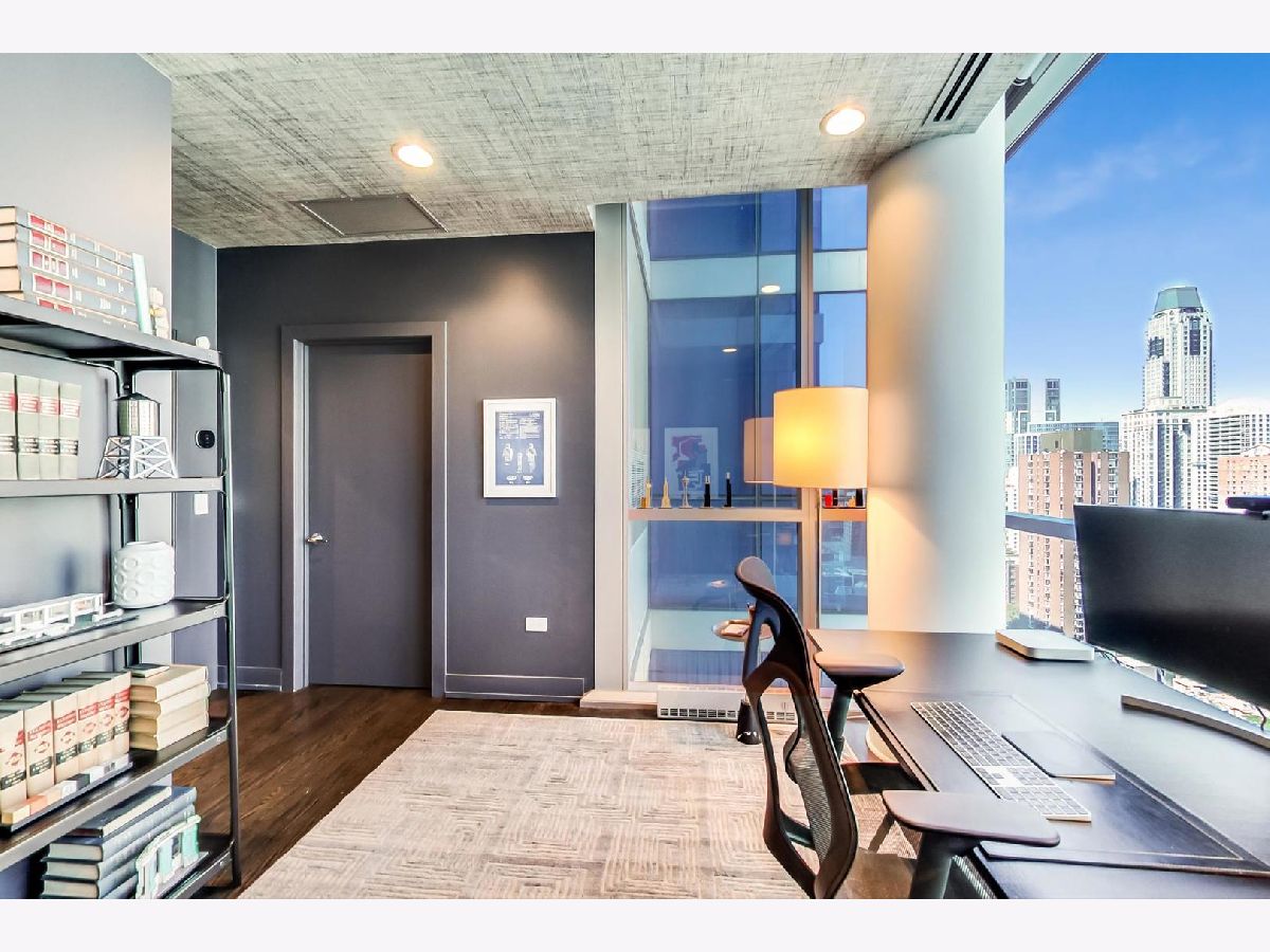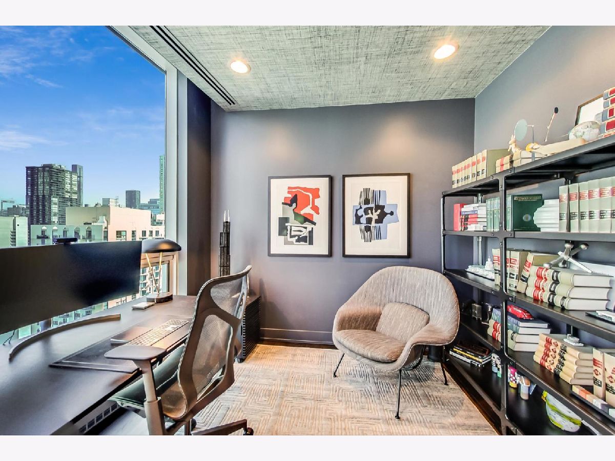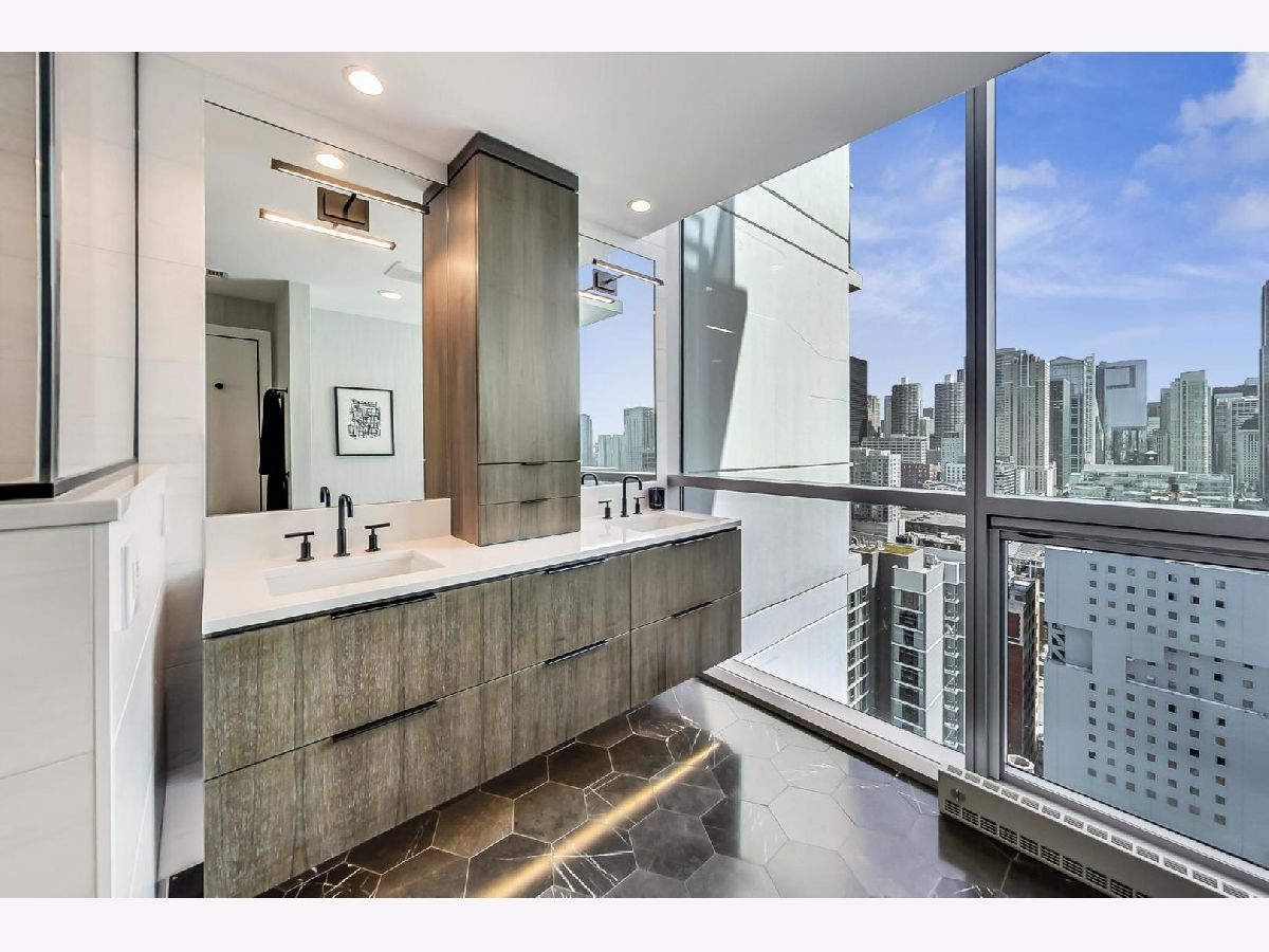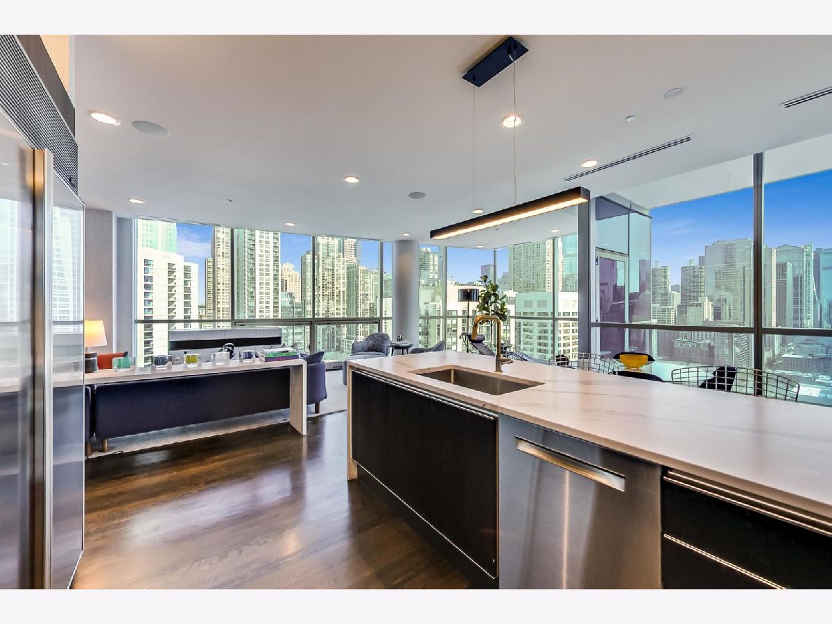 One of a kind, featured in Modern Luxury Magazine, reconfigured 3 bed plus office/den 3 bath 2020 renovated condo designed by Michael Abrams Interiors in River North boutique hi-rise! Highly sought after SE tier w/ breathtaking city views and two oversized terraces. Walk into an expansive living space with floor-to-ceiling windows and panoramic views. Newly improved throughout with Phillip Jeffries wall coverings, LED cans, motorized Hunter Douglas shades, Ecobee thermostats, & refinished hardwood floors. Updated Chef's kitchen w/ premium 48' Wolf range, Subzero refrigerator, Bosch dishwasher, Bosch microwave drawer, new Cambria Quartz waterfall counter tops & backsplash, upgraded LED ambient up-lighting and designer LED chandelier. Primary bedroom customized with Designer sconces, wool carpeting, and two LARGE walk-in newly customized closets. GUT RENOVATED Primary bathroom w/ natural stone throughout, matte black Kohler fixtures, custom double vanity w/ tower for added storage and Cambria Quartz tops, oversized rain shower w/ bench, Victoria + Albert matte black freestanding tub, heated floors, custom mirrors, and ambient lighting. Spacious 2nd bedroom was reconfigured to include a separate office/den/workout room. 2nd bath includes a walk-in shower, new sconce/mirror. All bedrooms have walk-in closets. 3rd bathroom off the entry designed with new Cambria banjo counter top and new mirror, new designer pendant lighting, Jacuzzi tub, & new custom shower curtain track with designer draperies. Full laundry room with side by side newer LG front loading washer & dryer & added storage. Other improvements include custom closets throughout, new efficient Panasonic bathroom vents, 4 HVAC systems, built-in ceiling sound system throughout. Extensive electrical upgrades include additional can lamps, adjustable art cans, all new outlets/switches/dimmers, and wiring to support multiple AV locations. Google WiFi included. 24-hr door staff, new exercise room & conference room, roof deck, WIFI/internet on first flr, storage. Excellently managed with strong reserves. Two heated garage spaces included within the sales price.