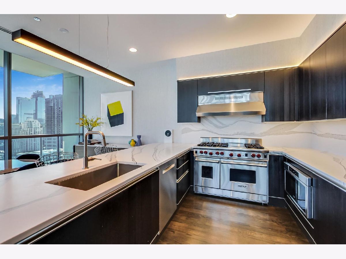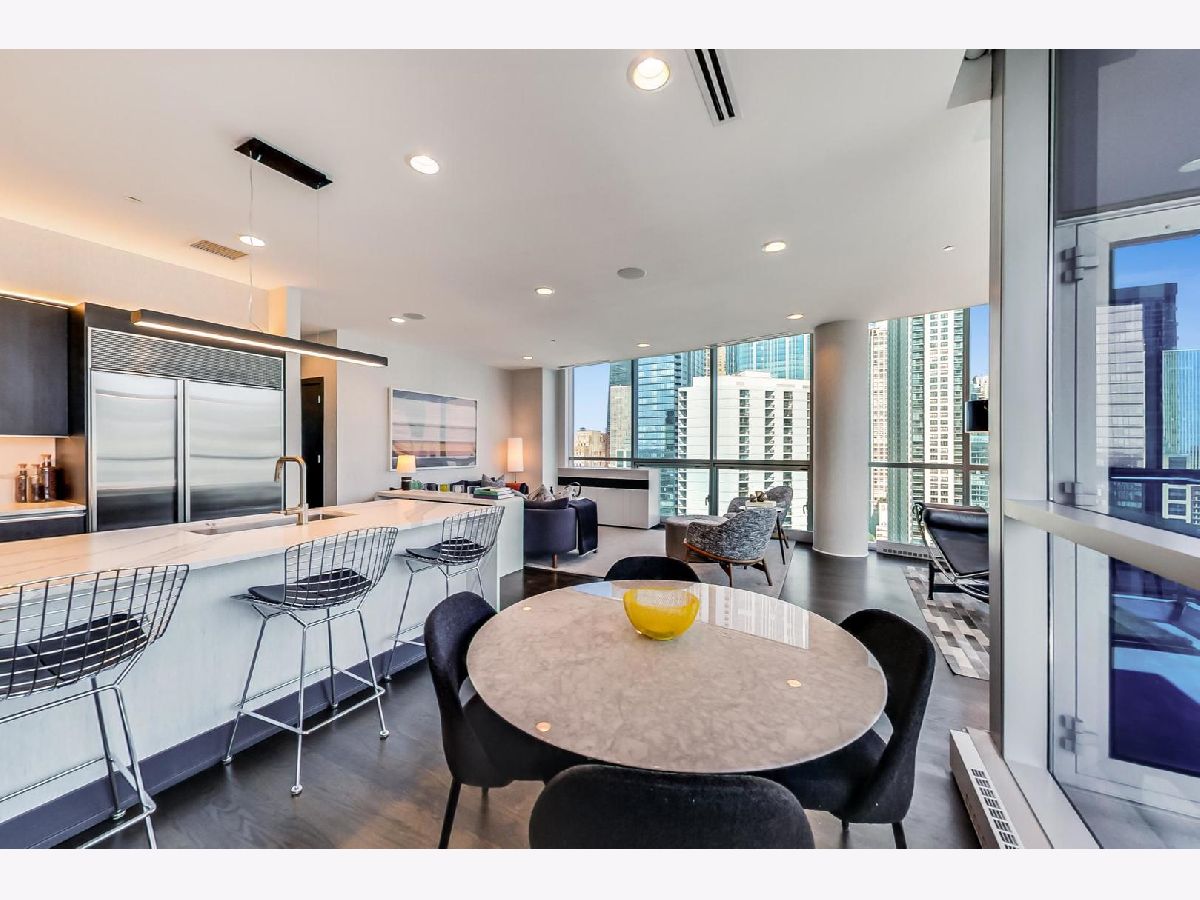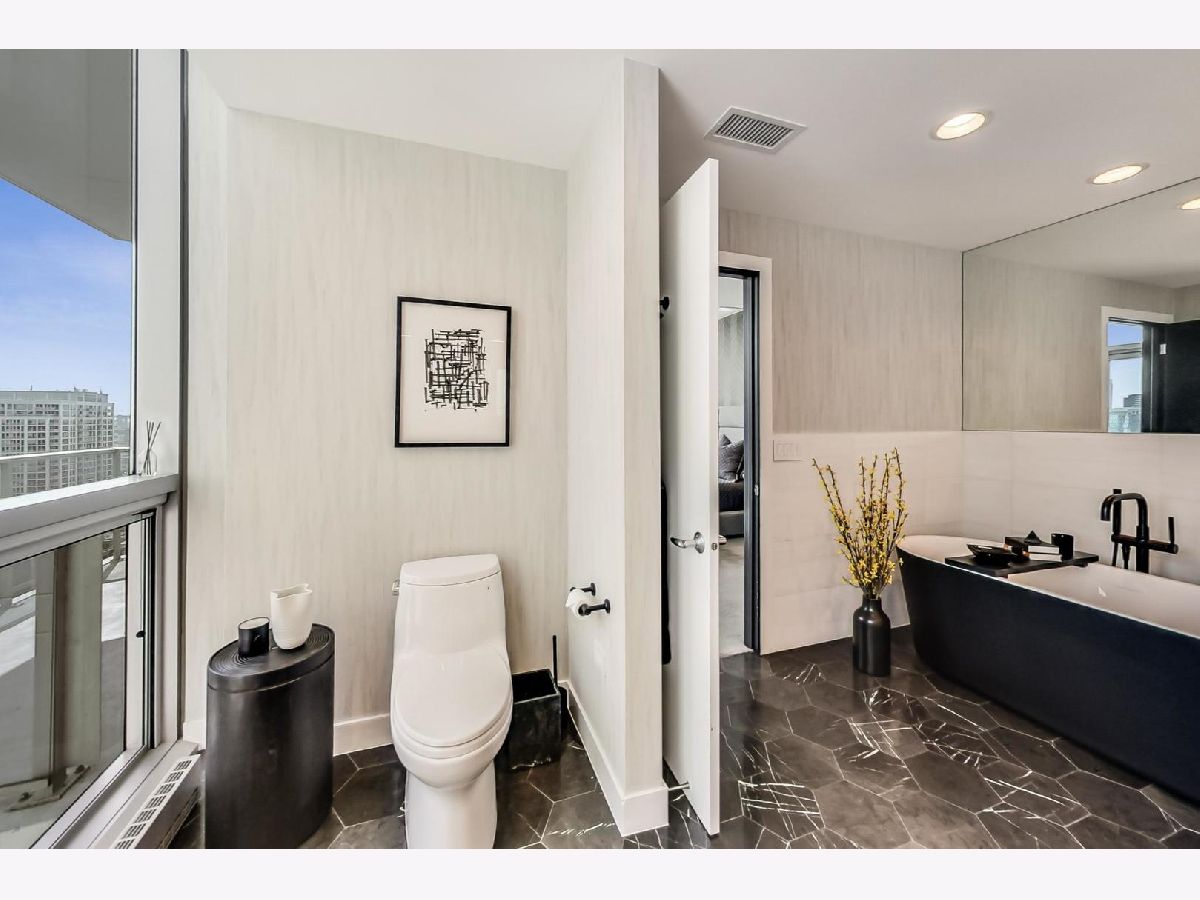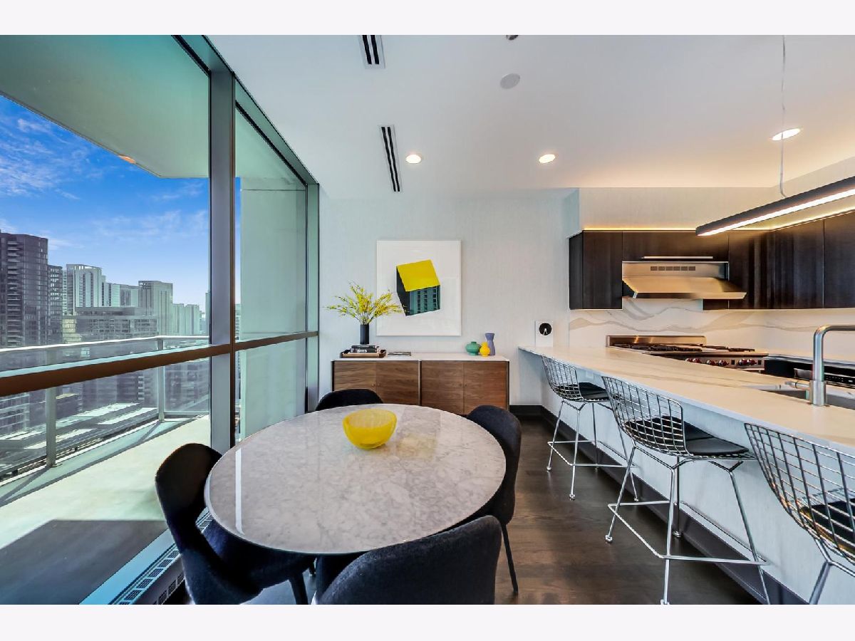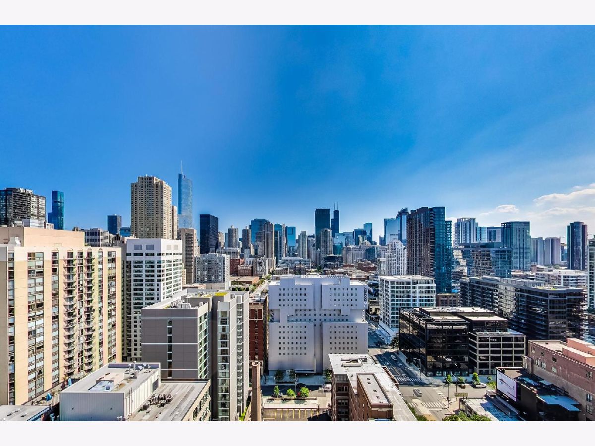 One of a kind, featured in Modern Luxury Magazine, reconfigured 3 bed plus office/den 3 bath 2020 renovated condo designed by Michael Abrams Interiors in River North boutique hi-rise! Highly sought after SE tier w/ breathtaking city views and two oversized terraces. Walk into an expansive living space with floor-to-ceiling windows and panoramic views. Newly improved throughout with Phillip Jeffries wall coverings, LED cans, motorized Hunter Douglas shades, Ecobee thermostats, & refinished hardwood floors. Updated Chef's kitchen w/ premium 48' Wolf range, Subzero refrigerator, Bosch dishwasher, Bosch microwave drawer, new Cambria Quartz waterfall counter tops & backsplash, upgraded LED ambient up-lighting and designer LED chandelier. Primary bedroom customized with Designer sconces, wool carpeting, and two LARGE walk-in newly customized closets. GUT RENOVATED Primary bathroom w/ natural stone throughout, matte black Kohler fixtures, custom double vanity w/ tower for added storage and Cambria Quartz tops, oversized rain shower w/ bench, Victoria + Albert matte black freestanding tub, heated floors, custom mirrors, and ambient lighting. Spacious 2nd bedroom was reconfigured to include a separate office/den/workout room. 2nd bath includes a walk-in shower, new sconce/mirror. All bedrooms have walk-in closets. 3rd bathroom off the entry designed with new Cambria banjo counter top and new mirror, new designer pendant lighting, Jacuzzi tub, & new custom shower curtain track with designer draperies. Full laundry room with side by side newer LG front loading washer & dryer & added storage. Other improvements include custom closets throughout, new efficient Panasonic bathroom vents, 4 HVAC systems, built-in ceiling sound system throughout. Extensive electrical upgrades include additional can lamps, adjustable art cans, all new outlets/switches/dimmers, and wiring to support multiple AV locations. Google WiFi included. 24-hr door staff, new exercise room & conference room, roof deck, WIFI/internet on first flr, storage. Excellently managed with strong reserves. Two heated garage spaces included within the sales price.