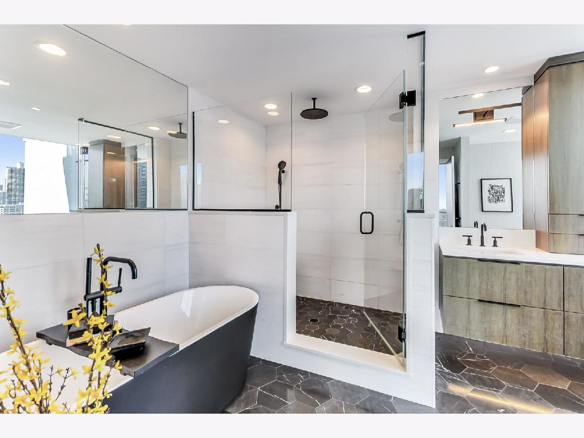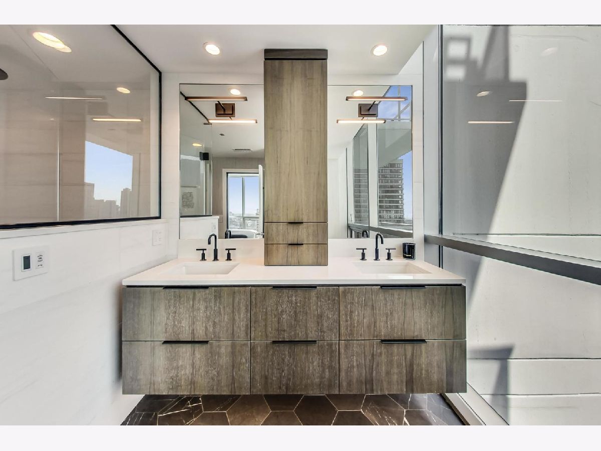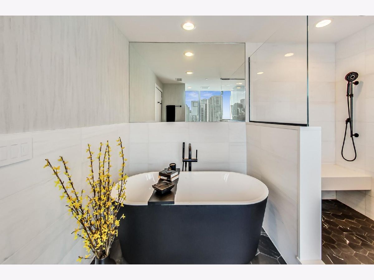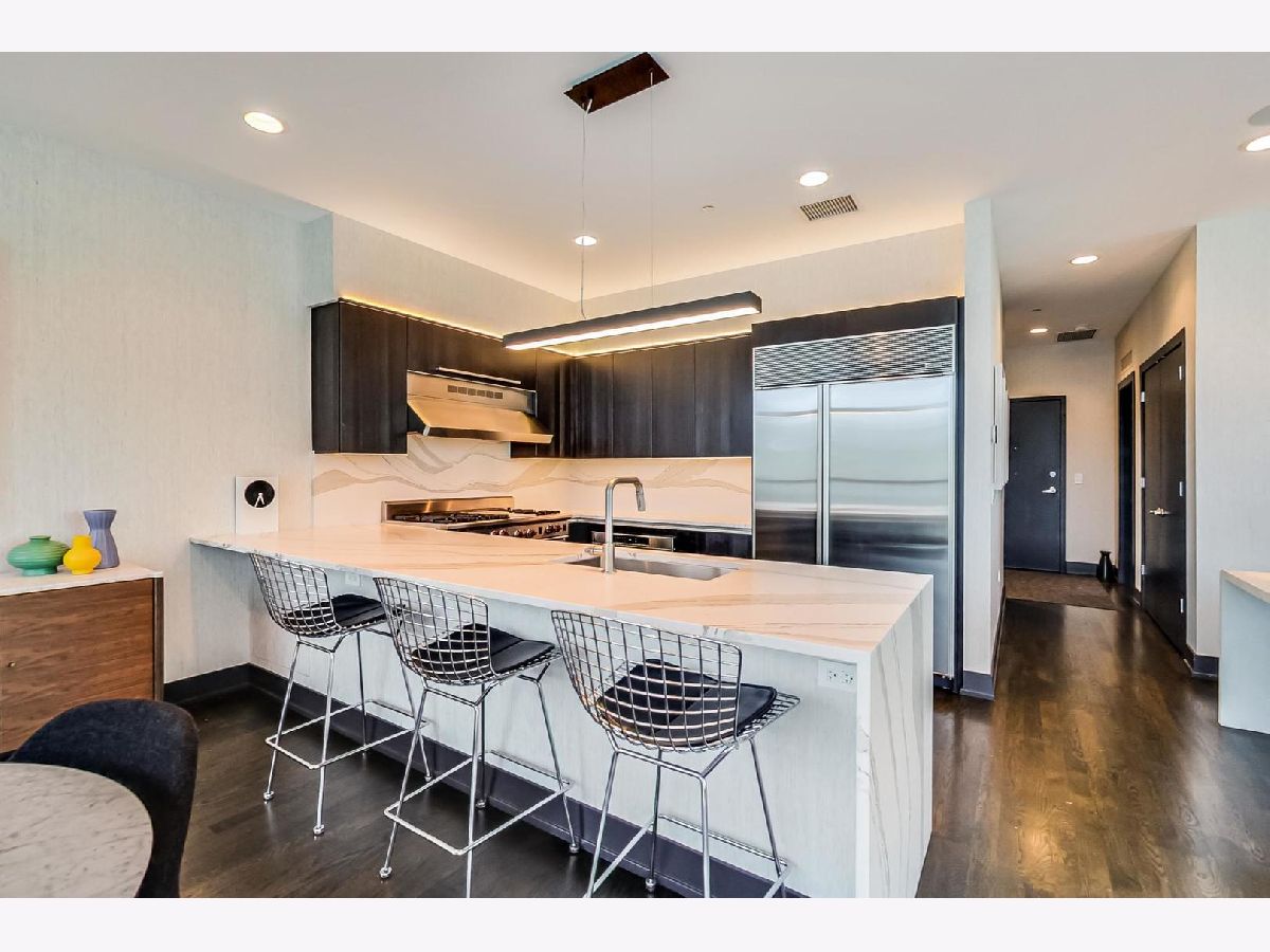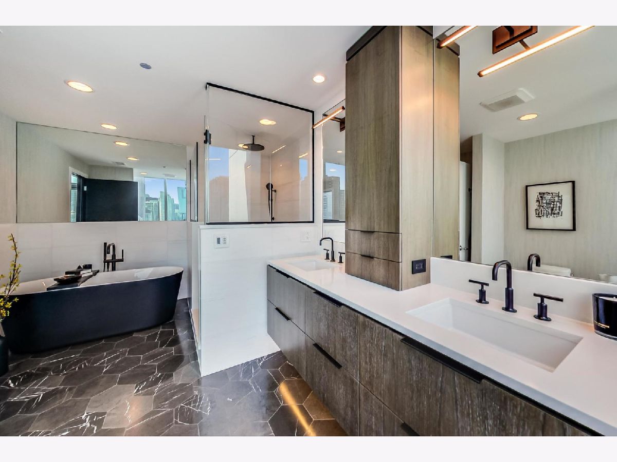 One of a kind, featured in Modern Luxury Magazine, reconfigured 3 bed plus office/den 3 bath 2020 renovated condo designed by Michael Abrams Interiors in River North boutique hi-rise! Highly sought after SE tier w/ breathtaking city views and two oversized terraces. Walk into an expansive living space with floor-to-ceiling windows and panoramic views. Newly improved throughout with Phillip Jeffries wall coverings, LED cans, motorized Hunter Douglas shades, Ecobee thermostats, & refinished hardwood floors. Updated Chef's kitchen w/ premium 48' Wolf range, Subzero refrigerator, Bosch dishwasher, Bosch microwave drawer, new Cambria Quartz waterfall counter tops & backsplash, upgraded LED ambient up-lighting and designer LED chandelier. Primary bedroom customized with Designer sconces, wool carpeting, and two LARGE walk-in newly customized closets. GUT RENOVATED Primary bathroom w/ natural stone throughout, matte black Kohler fixtures, custom double vanity w/ tower for added storage and Cambria Quartz tops, oversized rain shower w/ bench, Victoria + Albert matte black freestanding tub, heated floors, custom mirrors, and ambient lighting. Spacious 2nd bedroom was reconfigured to include a separate office/den/workout room. 2nd bath includes a walk-in shower, new sconce/mirror. All bedrooms have walk-in closets. 3rd bathroom off the entry designed with new Cambria banjo counter top and new mirror, new designer pendant lighting, Jacuzzi tub, & new custom shower curtain track with designer draperies. Full laundry room with side by side newer LG front loading washer & dryer & added storage. Other improvements include custom closets throughout, new efficient Panasonic bathroom vents, 4 HVAC systems, built-in ceiling sound system throughout. Extensive electrical upgrades include additional can lamps, adjustable art cans, all new outlets/switches/dimmers, and wiring to support multiple AV locations. Google WiFi included. 24-hr door staff, new exercise room & conference room, roof deck, WIFI/internet on first flr, storage. Excellently managed with strong reserves. Two heated garage spaces included within the sales price.