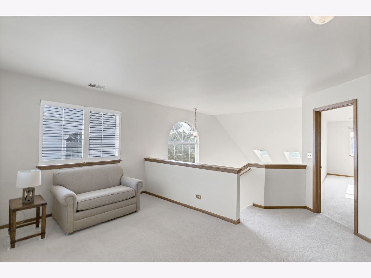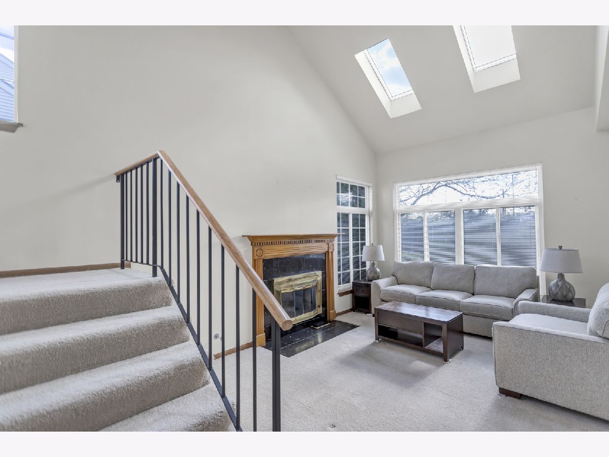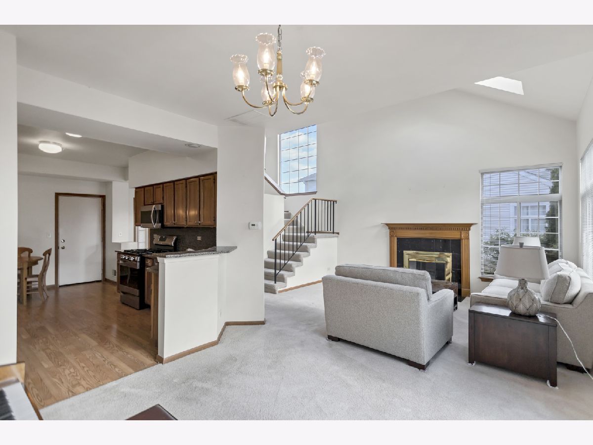 Welcome in! A charming covered front porch sets the tone as you step into a bright and inviting family room, complete with two skylights and an abundance of windows that flood the space with natural light. An elegant gas fireplace adds warmth and character. Just off the family room, the separate dining area connects effortlessly to the kitchen and glass sliding doors, offering an open concept flow that's perfect for gatherings. The kitchen is well-equipped with all stainless steel appliances, generous cabinetry, and a cozy breakfast nook for casual dining. A convenient half bathroom completes the main level. Upstairs, a spacious loft provides additional flexibility for a home office or reading area. The primary bedroom boasts a walk-in closet and an en suite bathroom with a walk-in shower. The second bedroom features mirrored closet doors and plenty of room to relax. A full hallway bathroom with a tub and shower and a separate laundry room add to the ease of living. Step outside to a concrete patio framed by lush landscaping-an ideal spot for outdoor dining or simply enjoying the serene surroundings. This home is ideally located close to beautiful parks, convenient grocery options, excellent dining, entertainment, and upscale shopping at Oakbrook Center.