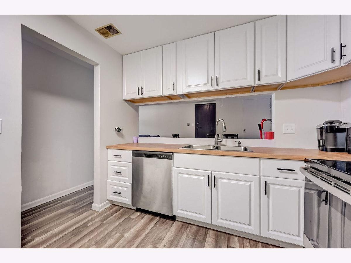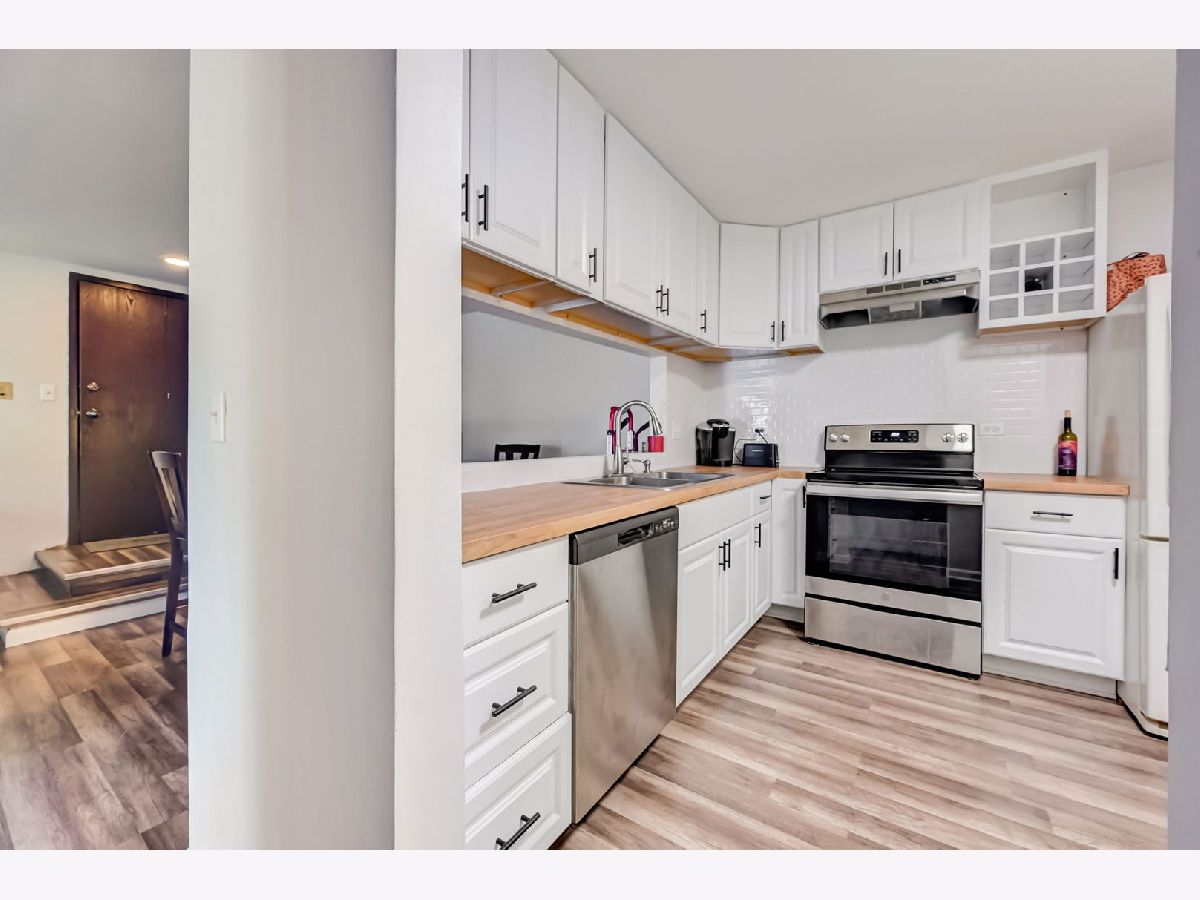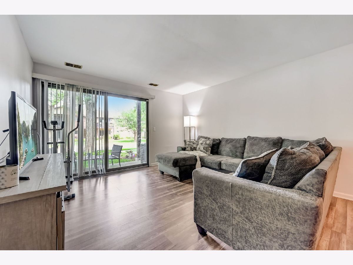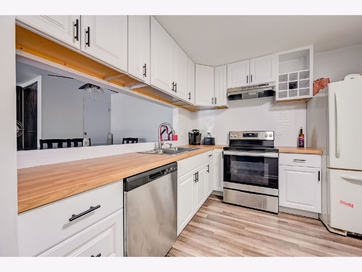 Welcome home to your newly remodeled 2BR, 1 Bathroom condo in the conveniently located Westbury community. The unit welcomes you into the living/dining room combo and offers continuous LVP flooring throughout the home. The kitchen boasts butcher block countertops, newer appliances (2022), backsplash, large pass-through window and plenty of white cabinets for ample storage. The home offers 2 generously sized BRs and a large shared updated bathroom. There is a full laundry in the unit and includes a storage locker. Enjoy the outdoors on your private patio, covered by the balcony above. Full remodel and appliances (2022/2023), Roof (2023), Water Heater (2019). So close to schools, shopping, paths/parks, entertainment, expressways, Metra and so much more!