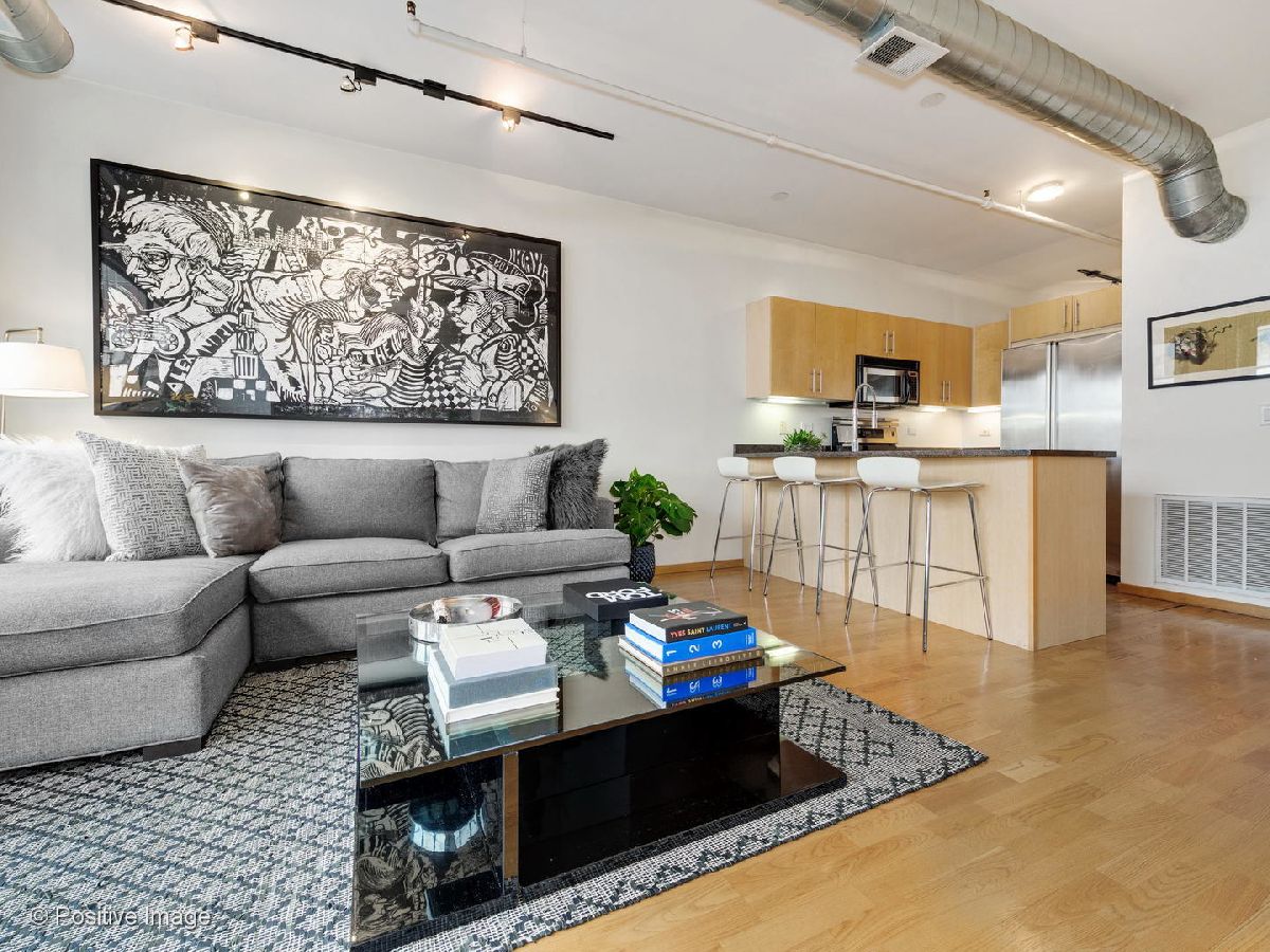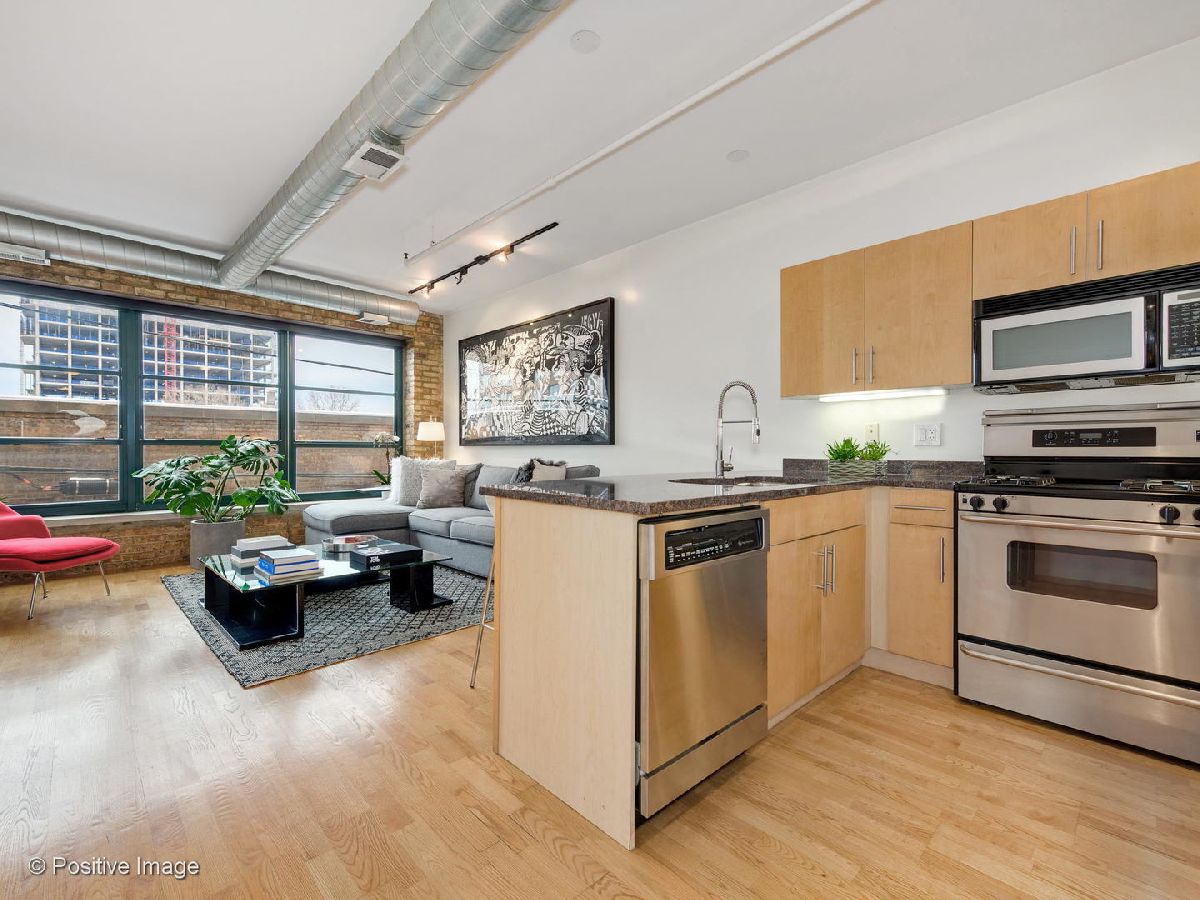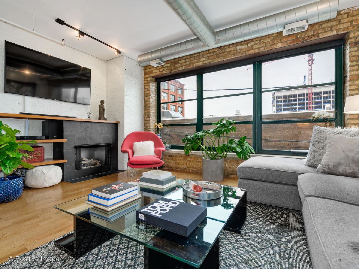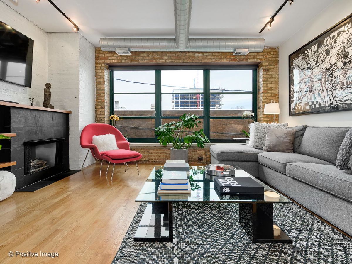 Situated within a stunning 17-unit boutique building in the heart of Fulton Market, this gorgeous 1 bed 1 bath residence is a secluded oasis away from the hustle and bustle of city living. With an open floor plan and sun-drenched interiors, this home features hardwood flooring and exposed brick and ductwork for a chic industrial feel. The open kitchen is a home chef's dream complete with granite countertops, maple cabinetry and stainless steel appliances. Designed with comfort in mind, the living space includes a gas fireplace with built-in shelving ideal for unwinding after a long day. With an expansive layout, the primary bedroom features a full wall of custom closet space from California Closets and a large custom built-in office station perfect for people working from home. Featuring natural stone and luxurious finishes, the bathroom includes a jetted soaking tub with a shower for the true spa experience. One large private storage locker included. Attached garage parking is an additional $25k. Building amenities include a common rooftop deck with grills and breathtaking skyline views. This location cannot be beat; walk to everything Fulton Market and the West Loop have to offer.