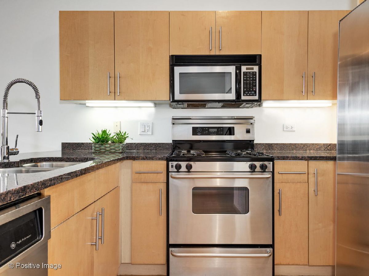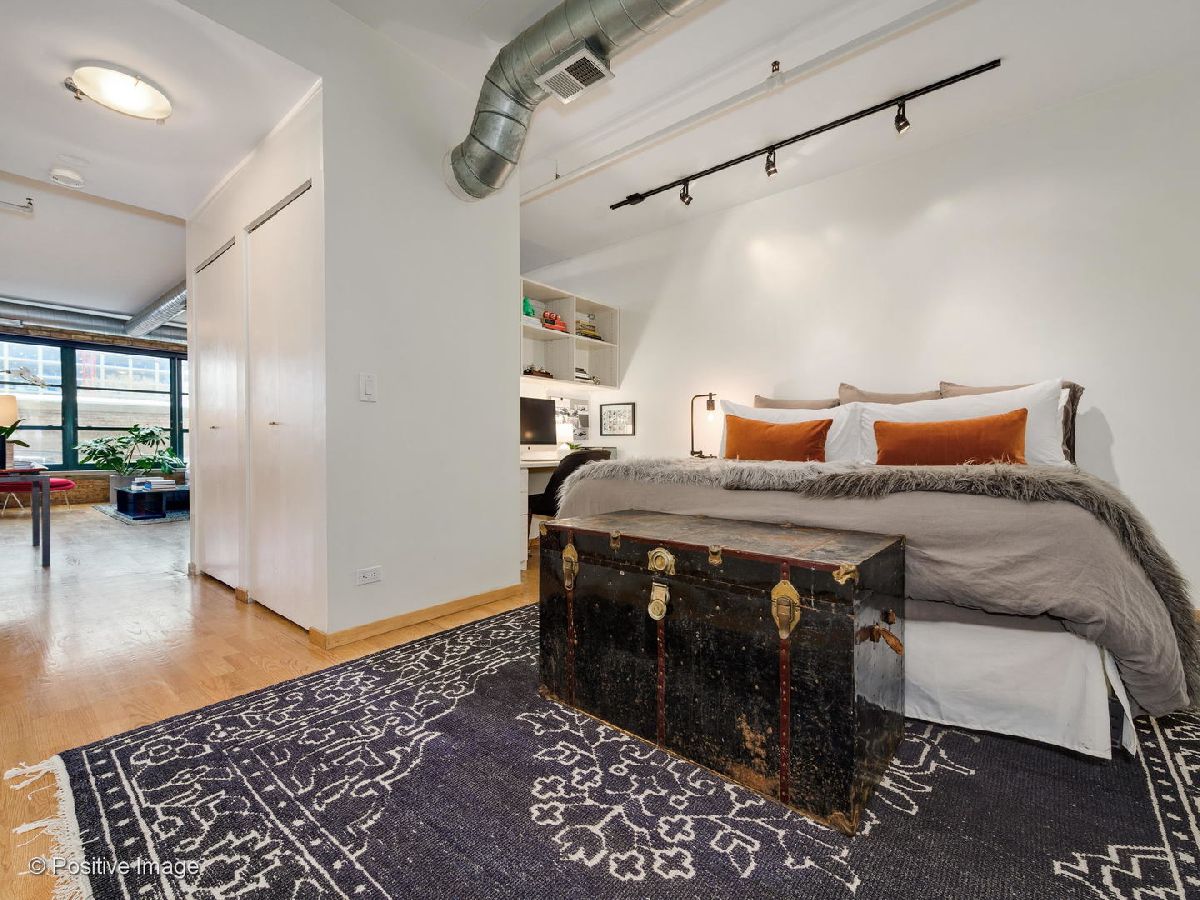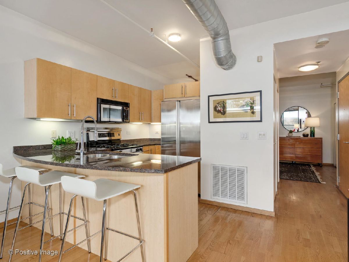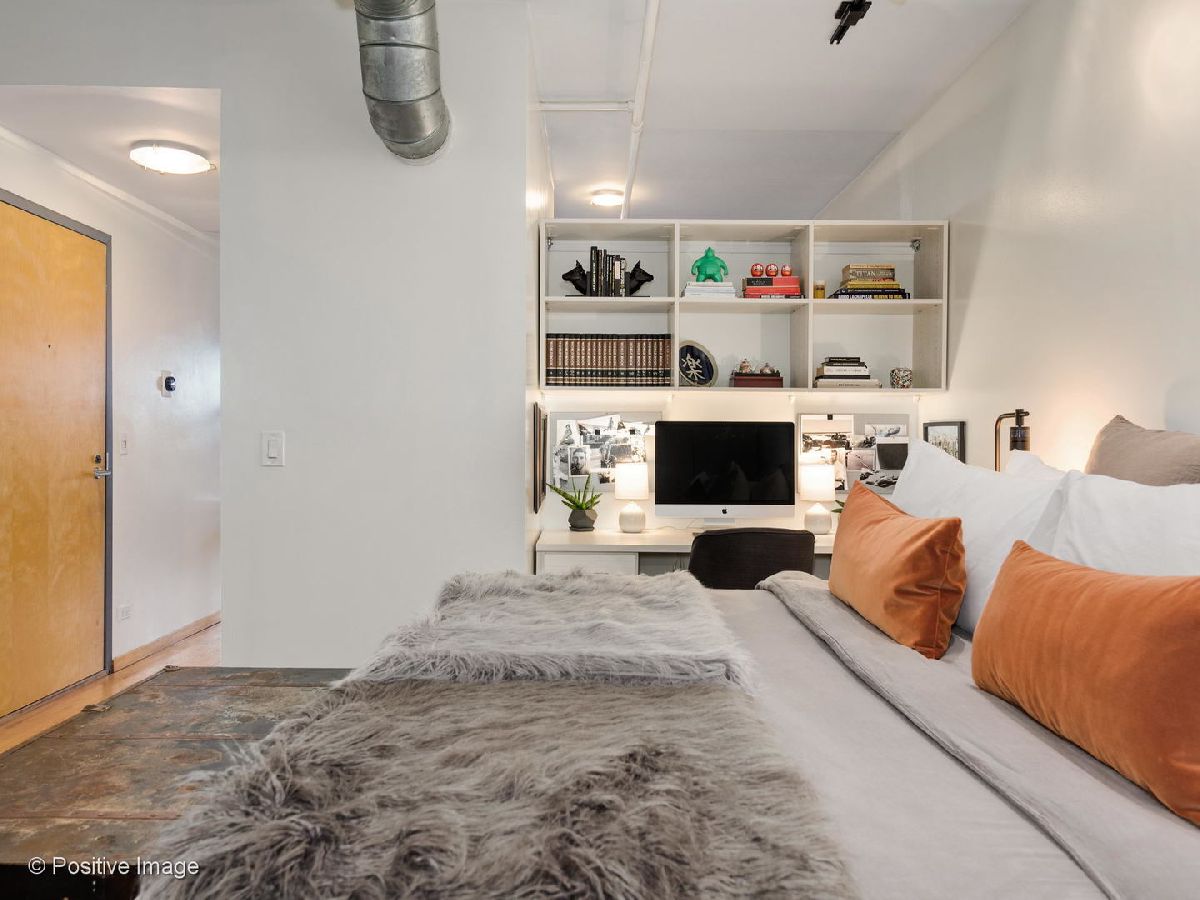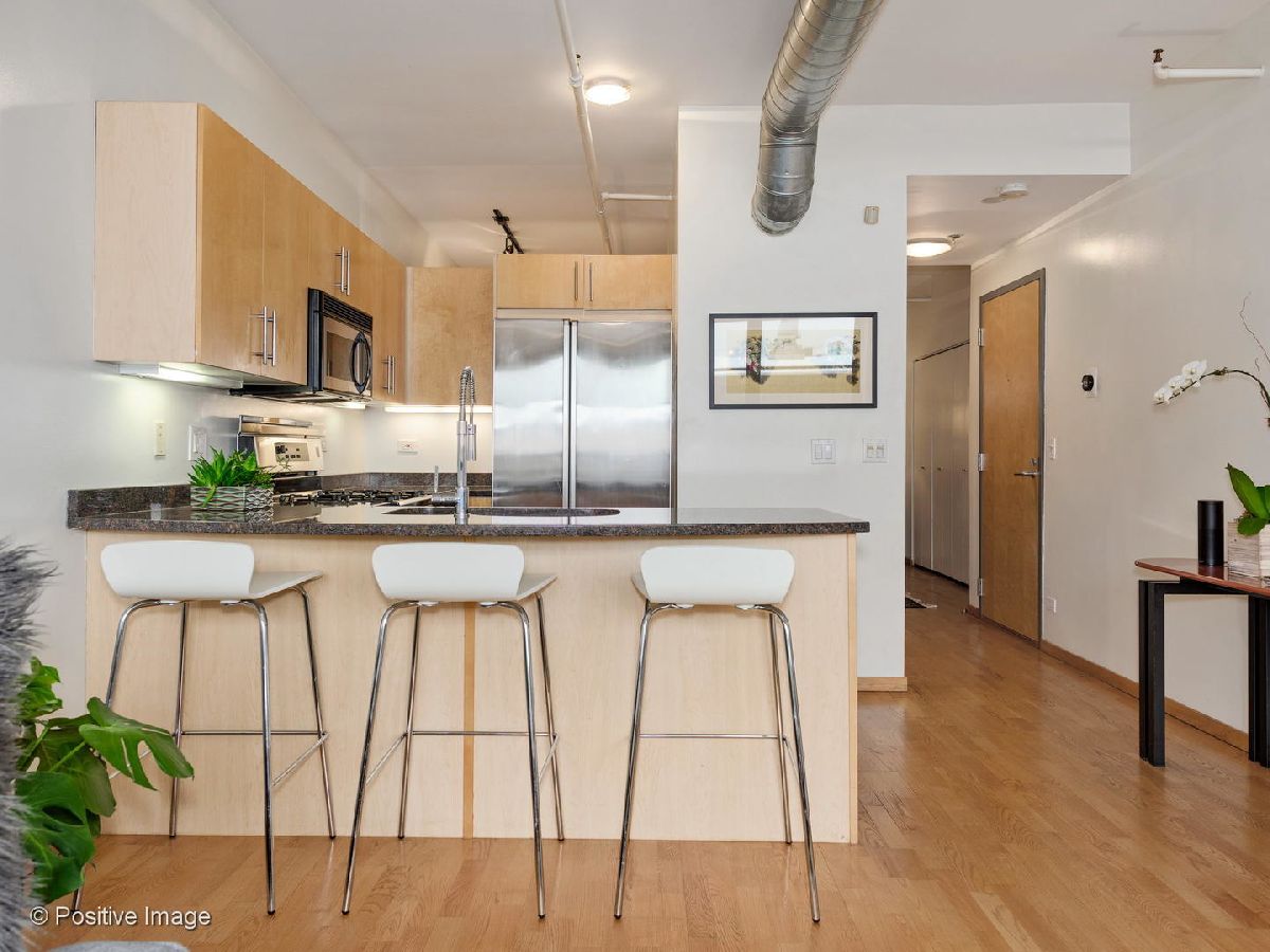 Situated within a stunning 17-unit boutique building in the heart of Fulton Market, this gorgeous 1 bed 1 bath residence is a secluded oasis away from the hustle and bustle of city living. With an open floor plan and sun-drenched interiors, this home features hardwood flooring and exposed brick and ductwork for a chic industrial feel. The open kitchen is a home chef's dream complete with granite countertops, maple cabinetry and stainless steel appliances. Designed with comfort in mind, the living space includes a gas fireplace with built-in shelving ideal for unwinding after a long day. With an expansive layout, the primary bedroom features a full wall of custom closet space from California Closets and a large custom built-in office station perfect for people working from home. Featuring natural stone and luxurious finishes, the bathroom includes a jetted soaking tub with a shower for the true spa experience. One large private storage locker included. Attached garage parking is an additional $25k. Building amenities include a common rooftop deck with grills and breathtaking skyline views. This location cannot be beat; walk to everything Fulton Market and the West Loop have to offer.