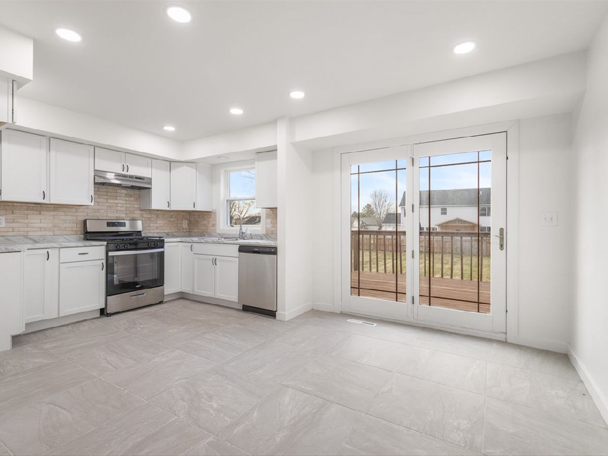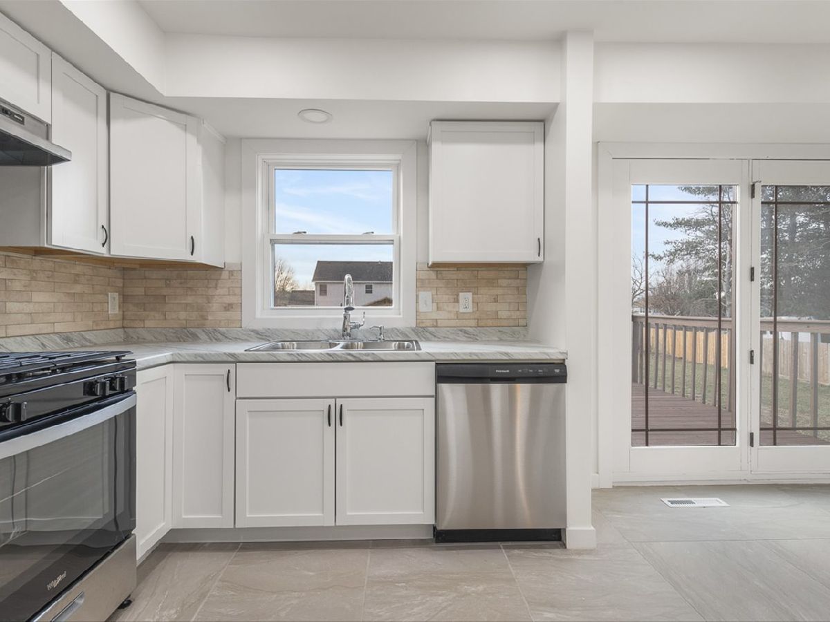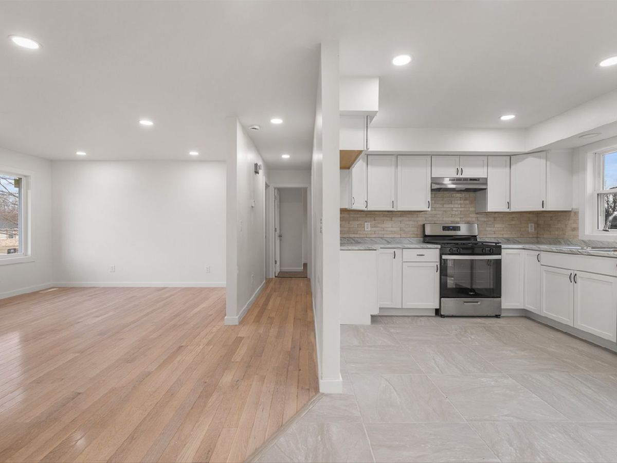 Remodeled down to the studs - completely new inside! Light and bright open concept 3 bedroom 2 bath home with large eat-in kitchen, formal living room, and family room with fireplace. The two-story foyer leads to a main level with a large eat-in kitchen with stone tile, white cabinets, tile backsplash and new appliances. The formal living room is has wood flooring and leads to two bedrooms with new carpet and updated full bath. The lower level has an additional bedroom, connected to updated full bath. Massive family room with hardwood floors and wood burning fireplace for cozy winter nights. Large deck overlooks fenced backyard. White woodwork, trim and recessed lights. throughout. New central air, water heater, plumbing, electric, drywall, insulation, new windows, new doors.