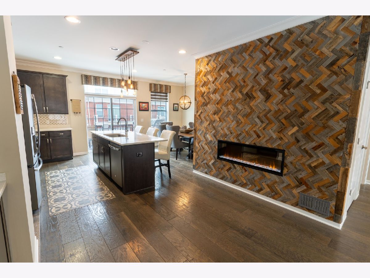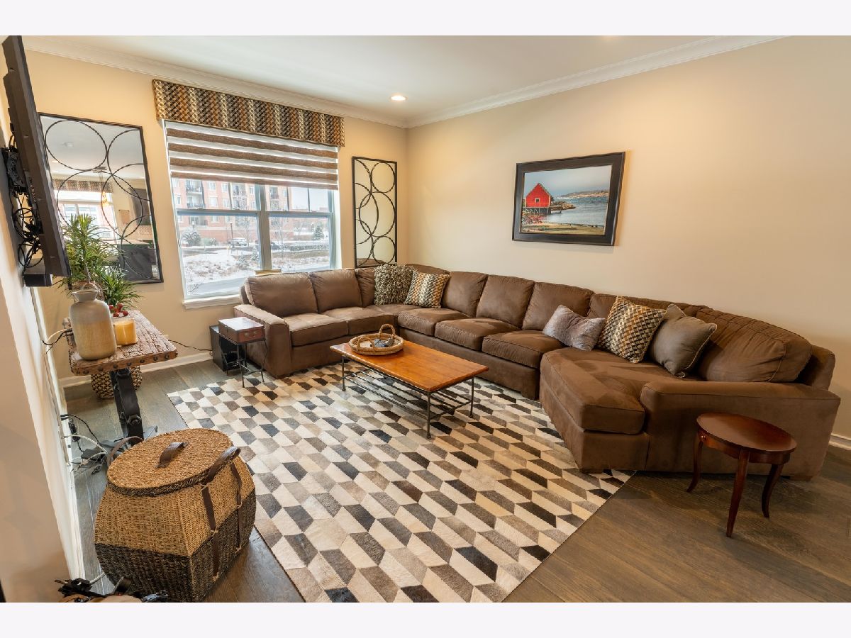 Spacious light-filled designer rowhouse facing the main water feature at Vernon Hills Town Center. 3 bedrooms, 2.5 bathrooms, lower level bonus room/office, 2 car garage and open living, dining and kitchen area. Master bedroom has vaulted ceilings and all bathrooms have upgraded tile and quartz countertops. Wide planked hardwood floors throughout the main level. Main floor upgrades include crown moulding, custom fireplace and coffee/wine bar with beverage refrigerator. Kitchen has rich stained cabinets with soft close drawers, slate stainless appliances and quartz countertops. Custom lighting through-out. Walking distance to Starbucks, numerous restaurants, retail and the forest preserve. House shows like a model and is only four years old.