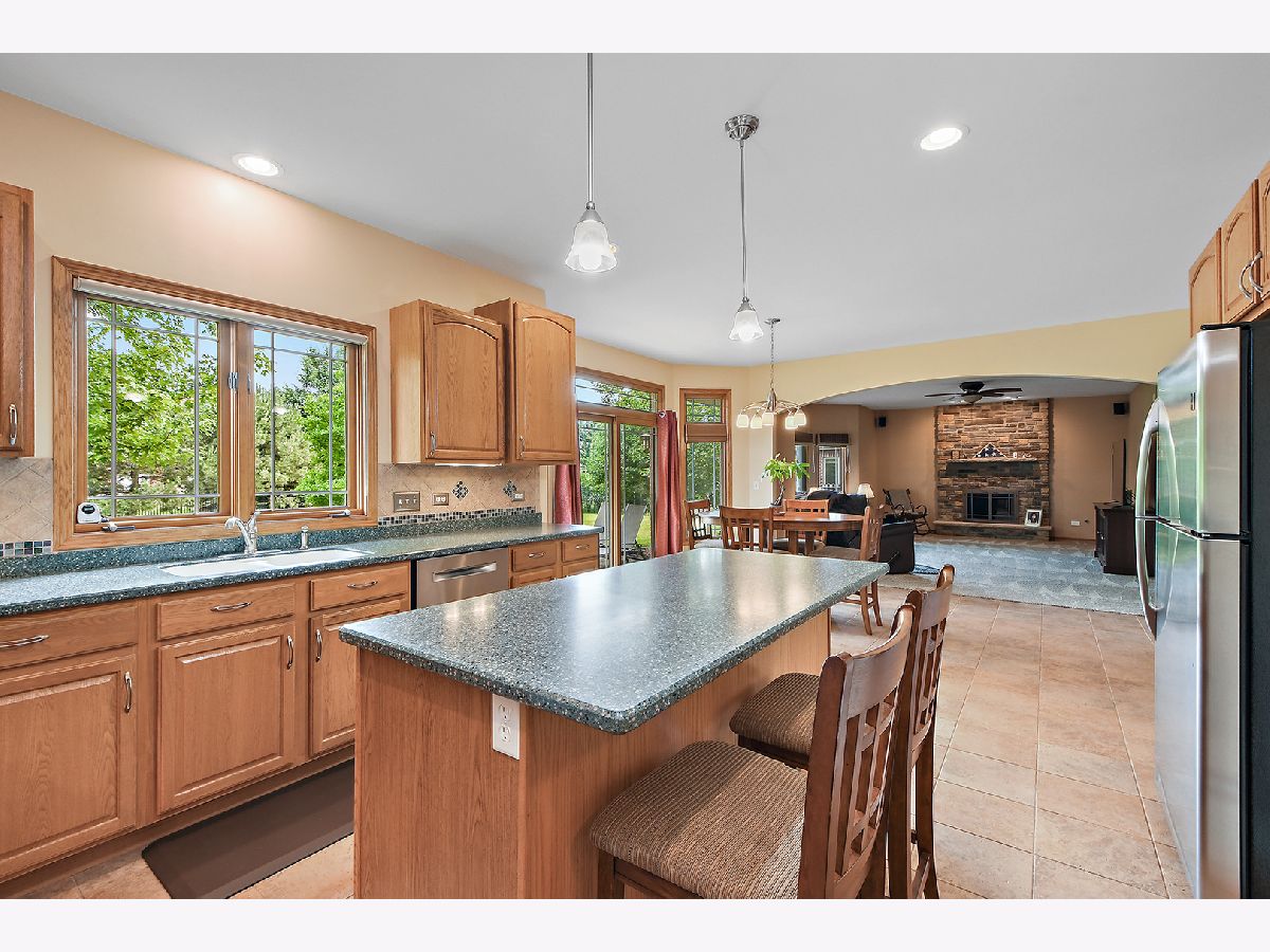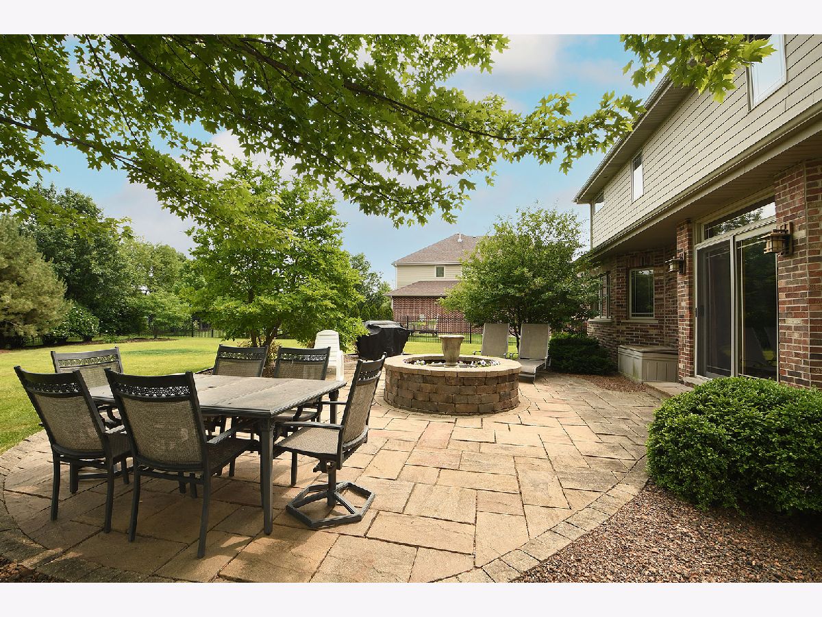 Set on a cul-de-sac, this 4 bedroom, 2 1/2 bath 2-story has been meticulously maintained. Covered front porch entry to formal dining room with coffered ceiling and hardwood flooring. Glass French doors to living room offers privacy ideal for a home office or study as well. Expansive kitchen with plenty of cabinetry, corian countertops, stainless appliances, and an island with seating. Eating area with transom prairie style windows overlooking your outdoor retreat. After dinner gather in the adjacent family room with cozy stone fireplace. Spectacular paver patio complete with fireplace/fountain offers an outdoor expansion of entertaining space. Fenced yard, professionally landscaped with mature trees and a lush lawn maintained by a sprinkler system, this is sure to be your happy place. Convenient main level laundry with bonus cabinetry and sink. 4 upper level bedrooms including a primary with hardwoods, decorative ceiling and separate walk-in closets. Ensuite with soaker tub, separate shower and dual sinks. Tandem bedroom with separate flex space would make an ideal playroom, sitting area or homework station. Full basement with tall ceiling! Attached 3-car garage. Walk to community park and Junior High School. Enjoy Frankfort's shopping, dining and entertainment.