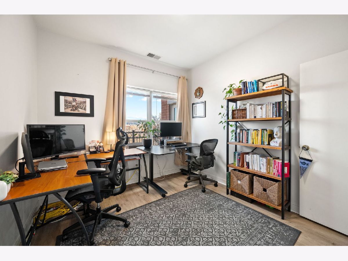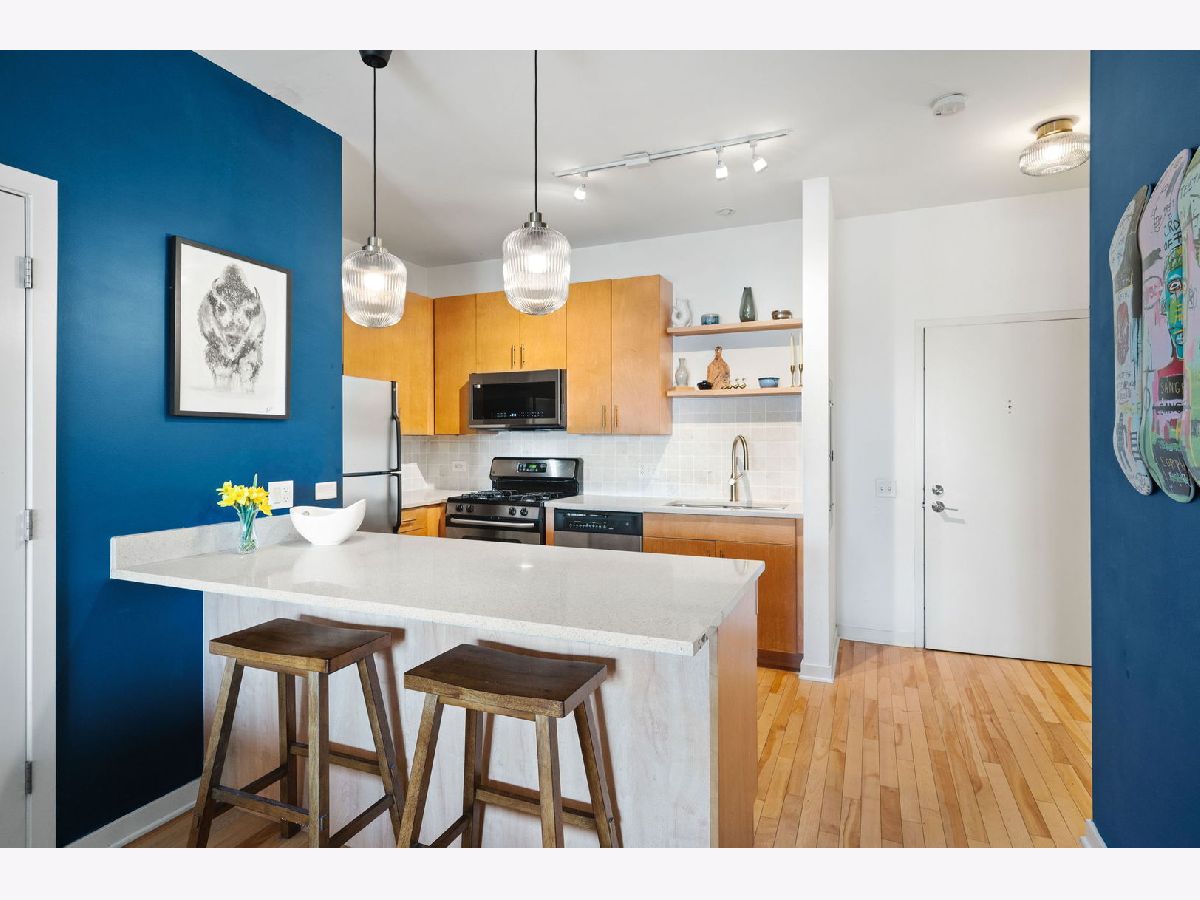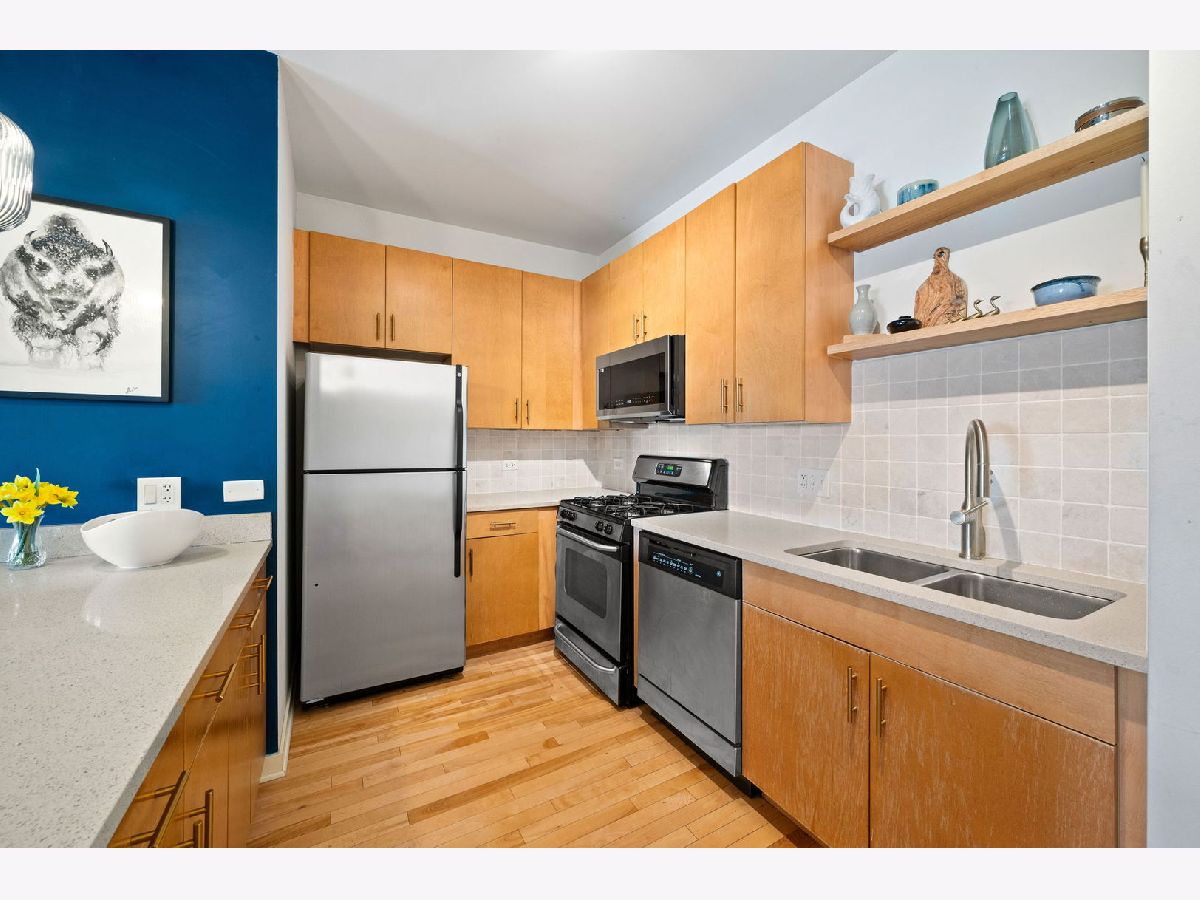 Welcome home to a sunny, spacious and immaculate 2 bed, 2 bth condo featuring an open living area with room for a dining table and a north facing balcony from where you can see stunning views of the downtown skyline. Kitchen features maple cabinets w/ stainless steel appliances, quartz countertops and breakfast bar. Primary bedroom has an ample sized walk in closet and double vanity bathroom. Unit also offers flooring throughout and in-unit Washer/Dryer. Located in Roosevelt Square / University Village located in close proximity to UIC campus and Rush Medical District, restaurants, entertainment, and public transportation. Common amenities include exercise room. One heated garage parking space and substantial storage closet included.