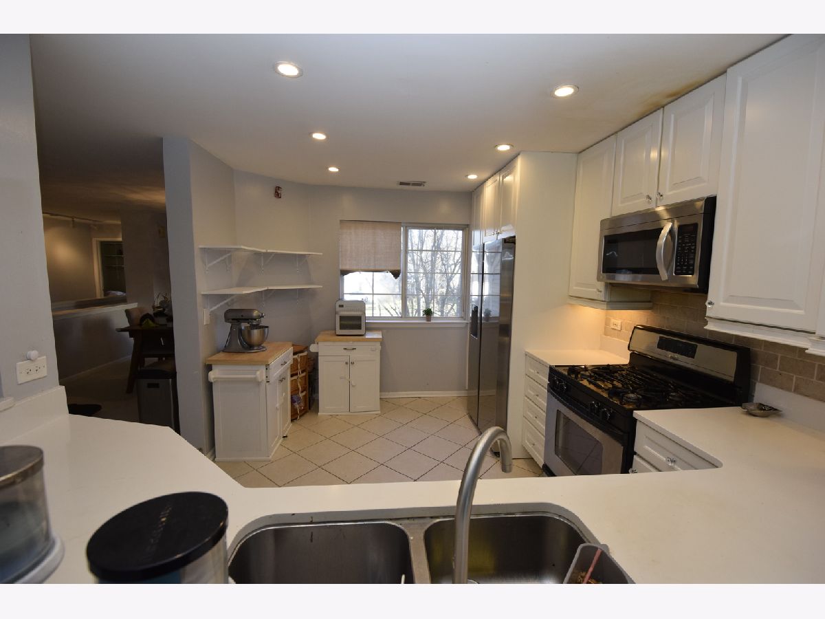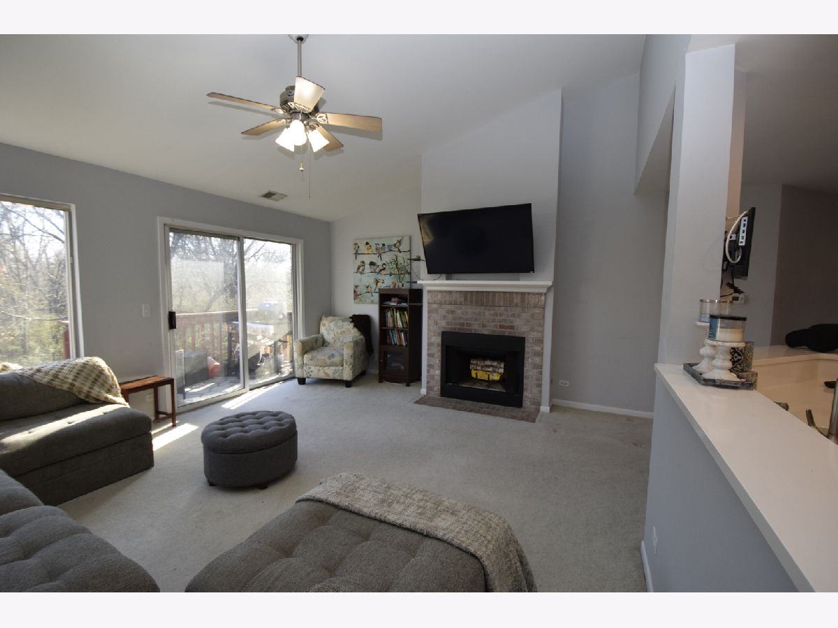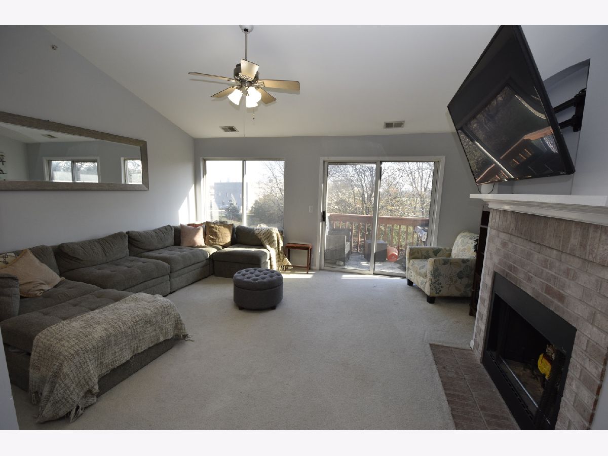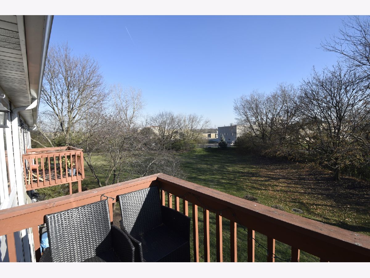 Premium location with wooded rear view. Eat-in kitchen, new refrigerator, features solid surface counter tops, under cabinet lighting, soft close cabinet drawers, recessed lighting and all stainless steel appliances, new fridge. Separate dining room off kitchen. Living room features vaulted ceiling, wood burning fireplace and access to the balcony. Two hall closets. Updated hall bath. Master bedroom features vaulted ceiling, plant ledge, walk-in closet, and updated full bath. 2nd bedroom features built-in bookshelves and closet organizer. Convenient in-unit laundry. Attached garage with built-in shelving. New roof in 2018. Great location - close to schools, shopping, expressways and more!