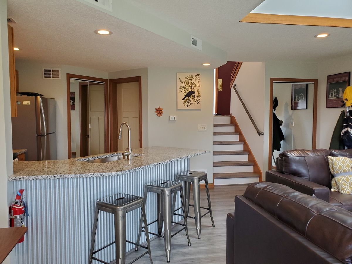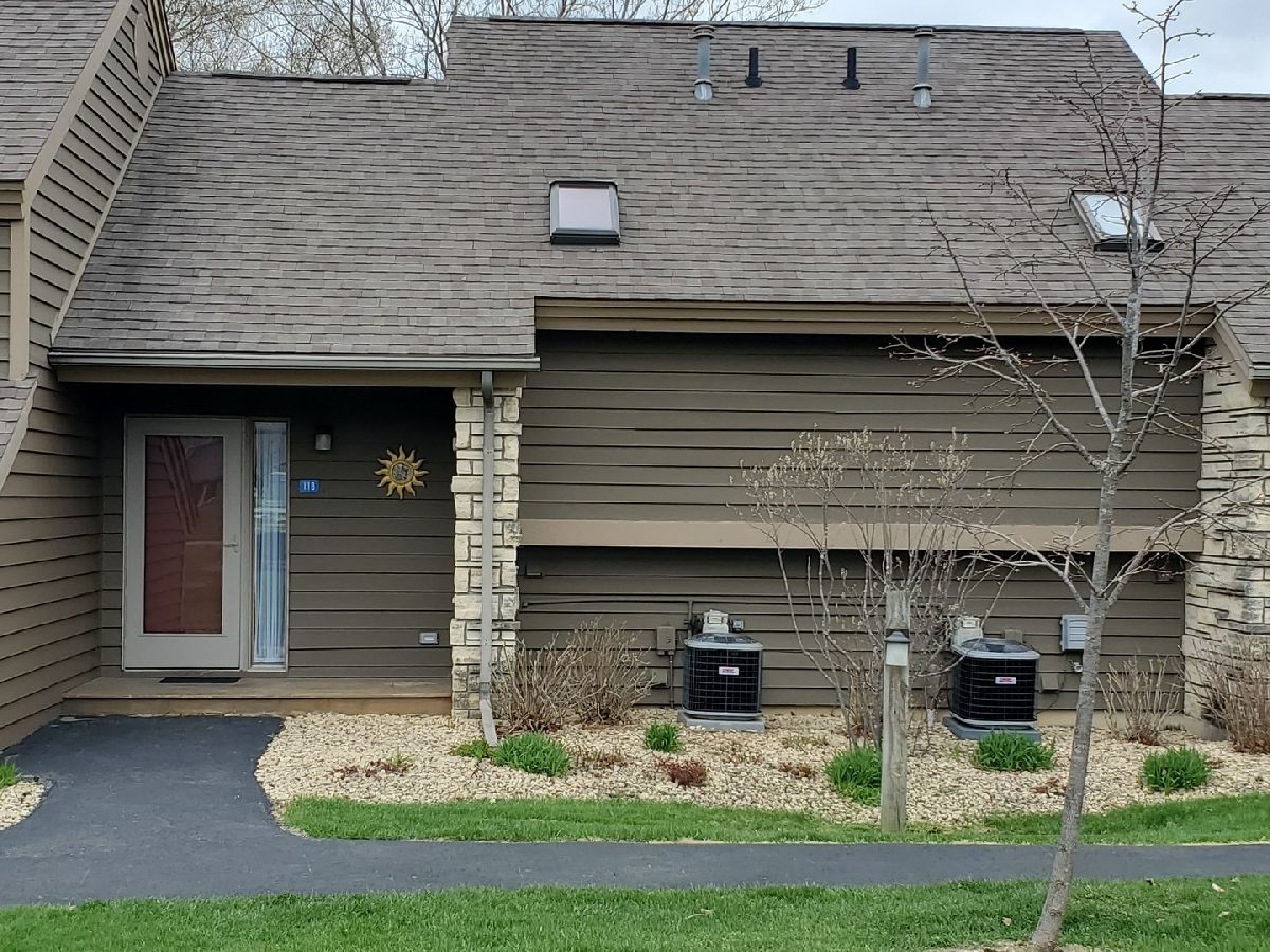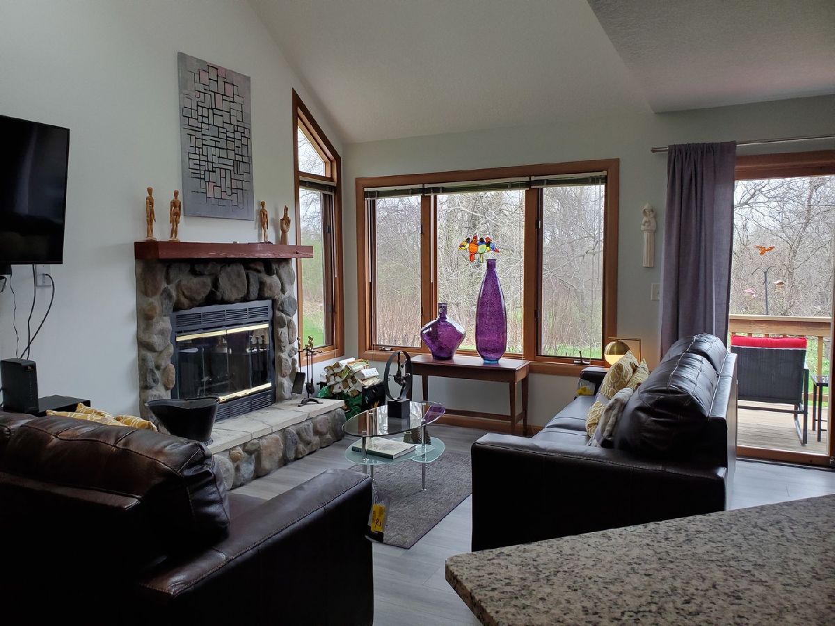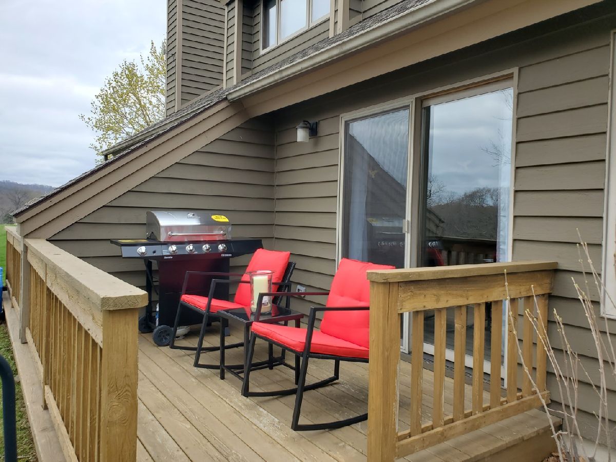 Modern! This Hickory Run 1 bedroom 2 bathroom Townhouse has been updated both in furnishings and core updates. Open, airy, bright, and peaceful. With a view of the #1 fairway of Eagle Ridge Golf Course, there are no neighbors out back. The stillness, wildlife and beauty of The Galena Territory is intoxicating. The entire home has been updated and is modern, clean and fresh! If you loathe carpeting then you will love this home as there is no fixed carpet! New Pergo grey plank floors have been installed throughout along with new floor, window and door trim. Closet doors have been replaced with mirrored bifold doors to reflect the light, color and energy of The Territory and all have new LED lights. Kitchen has brand new granite countertops, new stainless sink, new faucet, new backsplash, new garbage disposal, new SS appliances, new recessed LED lights, new thermostat. The kitchen basin has been updated with modern new corrugated facade sheeting. Living room boasts a wood-burning fireplace with new interior refractory panels, new stainless curtain rod and modern curtains at patio door, new barrel ceiling light in dining. Large skylight floods the home with light. If you love this during the day you will love this equally at night with a log in the fireplace and the new dimmer lights on, perfect for watching the colorful Illinois sunsets! Main floor bathroom has new granite countertop, new vessel sink, new faucet, new toilet, new showerhead along with a new solid craftsman door. Laundry room has a new washer and dryer that chime when completed as well as a new Rheem water heater and new Heil furnace. Outside Heil Central Air is new as well! Stairs have new treads and risers with accompanying Wolf stainless handrails for an added modern feel. New storm door installed at front. Upstairs you will find a loft which is perfect for an office with the large skylight directly in front. New craftsman doors in bedroom and upper bath. Vaulted ceiling in bedroom with new ceiling fan and dimmer switches too! The upper bath has vaulted ceiling and new granite countertops, new vessel sinks, new faucets, new toilet, new showerhead. Nice skylight in upper bath above jacuzzi tub. Also new are the ceiling, wall and floor grates, gfci outlets, duplex outlets, light switches and dimmer switches. Interior newly painted in neutral colors. The ceilings are a gorgeous modern bright white. All the furnishings, most of which are brand new are negotiable with the home furnished as tasteful and modern. This home is about as close to new as you can get without building your own. Seller has pre-paid the monthly HOA through December 2021 and that conveys to the buyer. If you are seeking peace and stillness in your life with a modern ambiance then you may have just found what you are looking for in this Townhome in the low density Galena Territory.