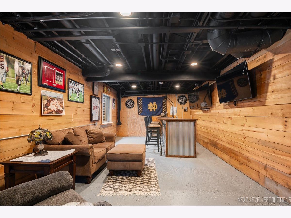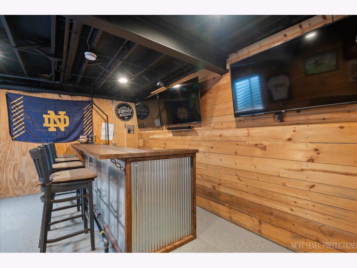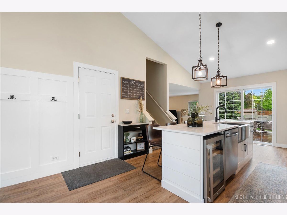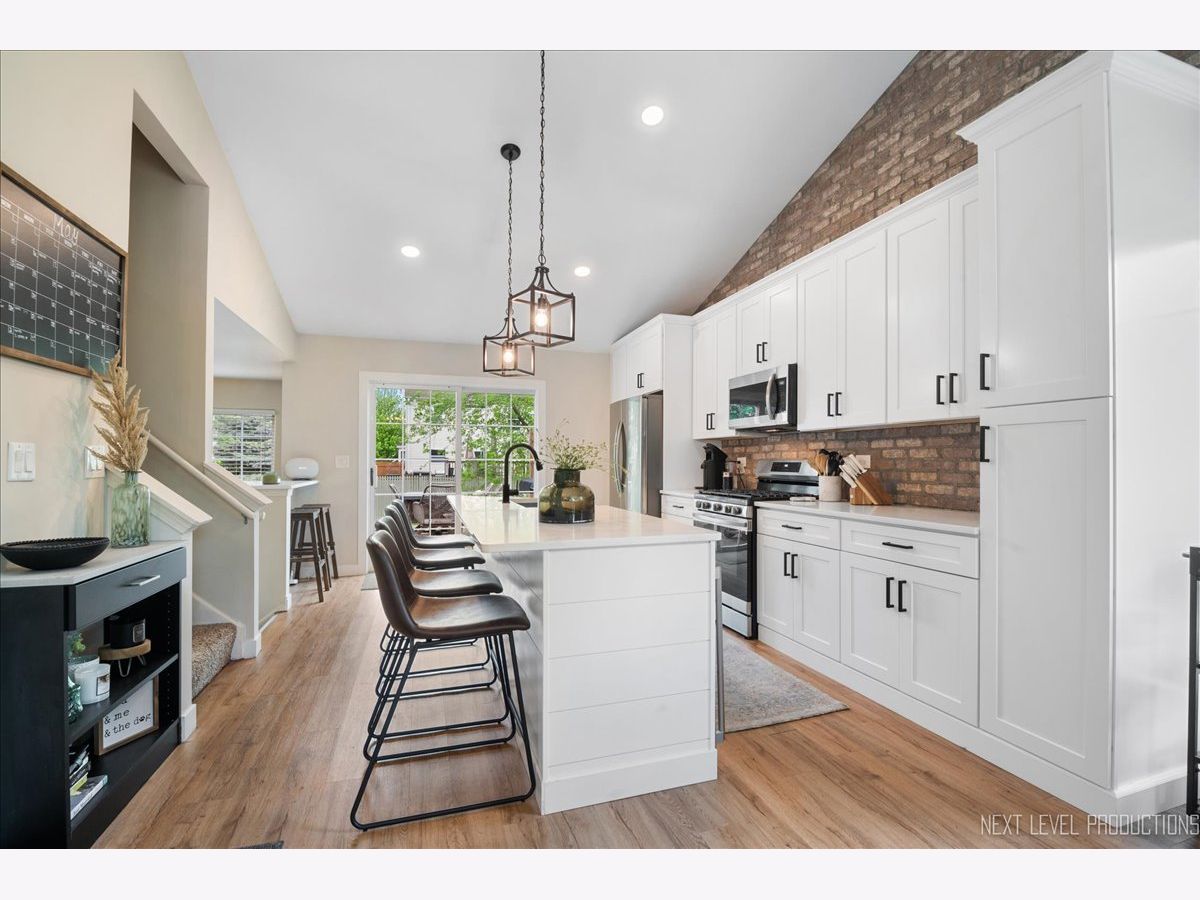 Stunning Wing Pointe home is ready and waiting for you! You will love this home from the moment you enter! The foyer with custom wainscot and vaulted ceiling leads into the dining space and kitchen with real brick accent wall. Gorgeous kitchen boasts shaker style white cabinets, SS appliances, quartz c-tops, big center island/breakfast bar with farmhouse sink and beverage cooler. Another eating bar is available by the slider leading out to a deck and fenced yard. Step down to the cozy family room with 2 big windows overlooking the big yard. Primary bedroom suite with volume ceiling, walk-in closet with built-ins and access to shared hall bath with painted vanity and shower/tub combo. Two nice size secondary bedrooms with generous closet space. The basement has charming wood paneled walls, exposed painted black ceiling and custom bar. Two car attached garage with epoxy floor and amazing custom built-in storage. Fenced back yard with a large deck and mature landscaping. The central location is close to absolutely everything you could need or want!