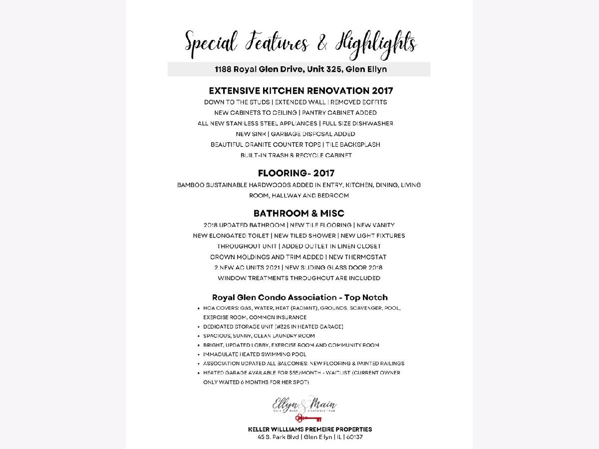 Wow - fall in love with every inch of this condo - simply STUNNING! So many "news": NEW KITCHEN - COMPLETELY GUTTED, ALL NEW BAMBOO FLOORING THROUGHOUT - ALL NEW APPLIANCES - NEW AC UNITS - UPDATED BATH - NEW LIGHTS THROUGHOUT. If you are currently renting and would rather PAY YOURSELF - come for a visit. Royal Glen is tucked away off Roosevelt Road in Glen Ellyn. Super easy access to 355 - shopping, restaurants and you decide if you want to take the Metra from Glen Ellyn or Lombard - train stations both close by. Say goodbye to rent and hello to this beautiful condo and a really great community to call home! Pool, Exercise Room and Clubhouse on-site.