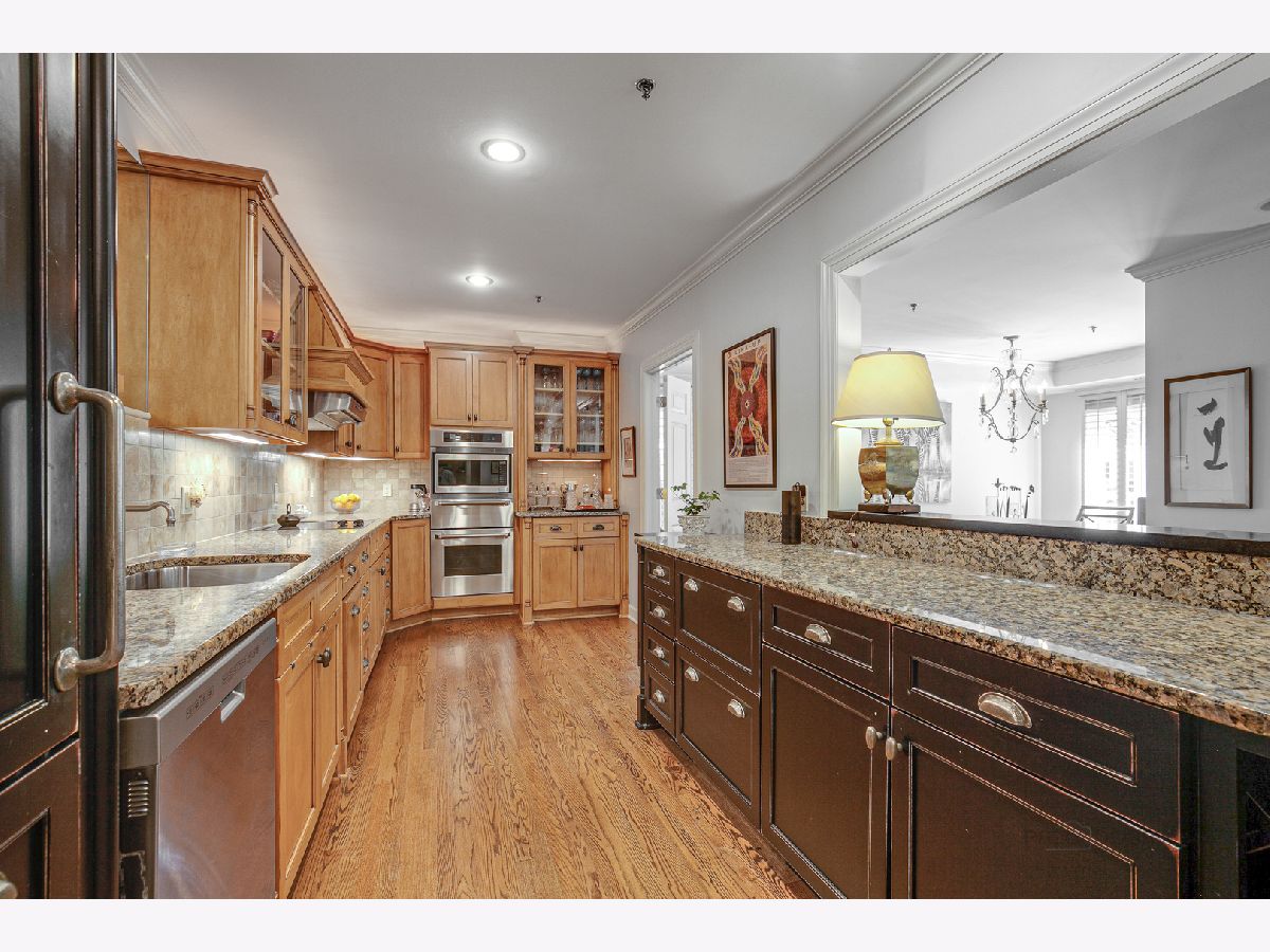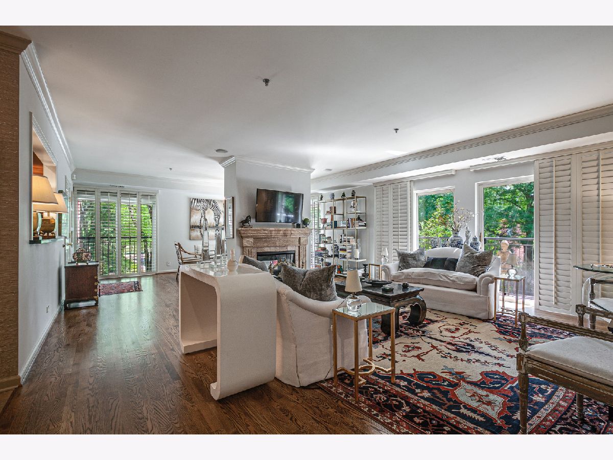 Very desirable corner unit with lots of sunlight. This 2 bedroom with two full bath condo that is convenient to town, train and shopping. New hardwood floors and newly decorated. East corner unit with fabulous kitchen featuring high end appliances, beautiful cabinetry and granite counter tops. Open concept living make it great for entertaining with two-sided fireplace separating living room from dining room. Slider door to new balcony. Plantation shutters throughout the unit. Large master suite with walk-in closet and luxurious bath. Nice size second bedroom/office. Two parking spaces in heated garage below building with storage locker.