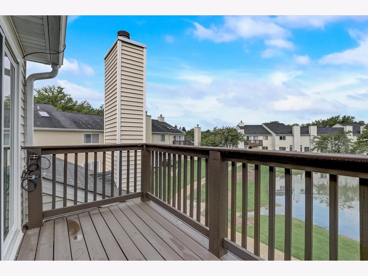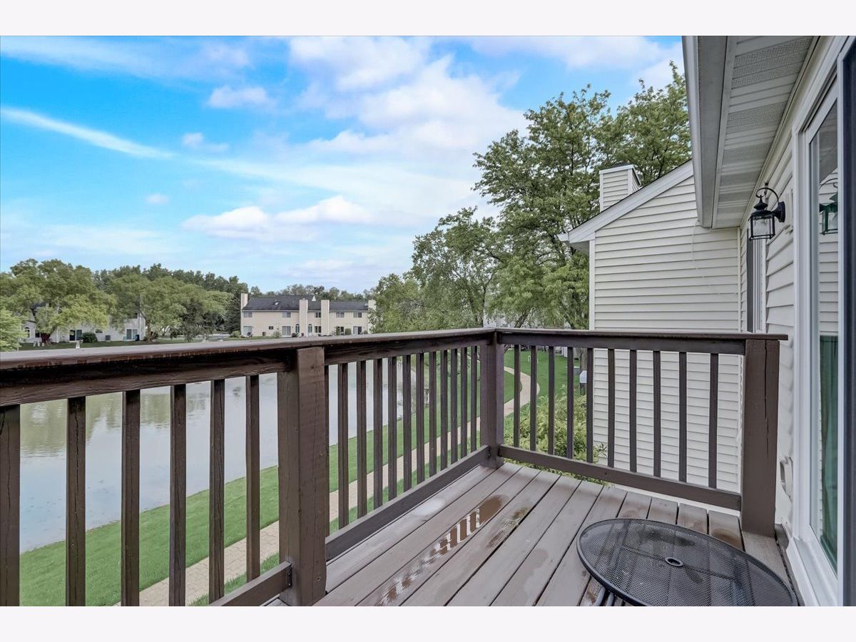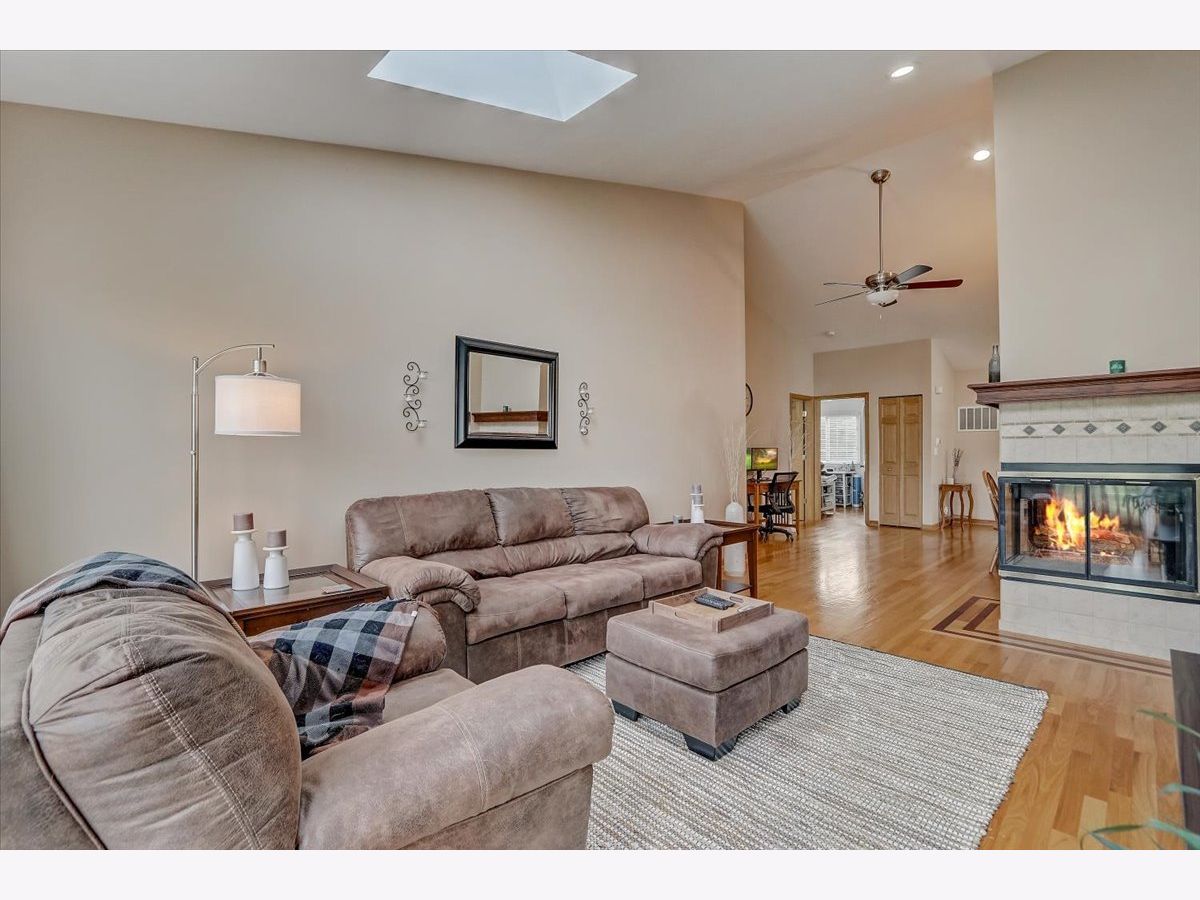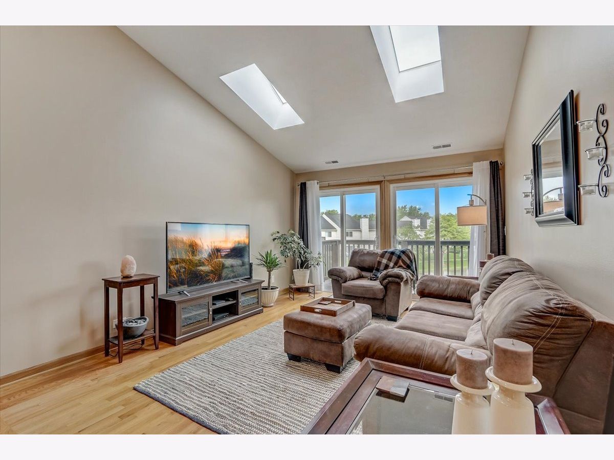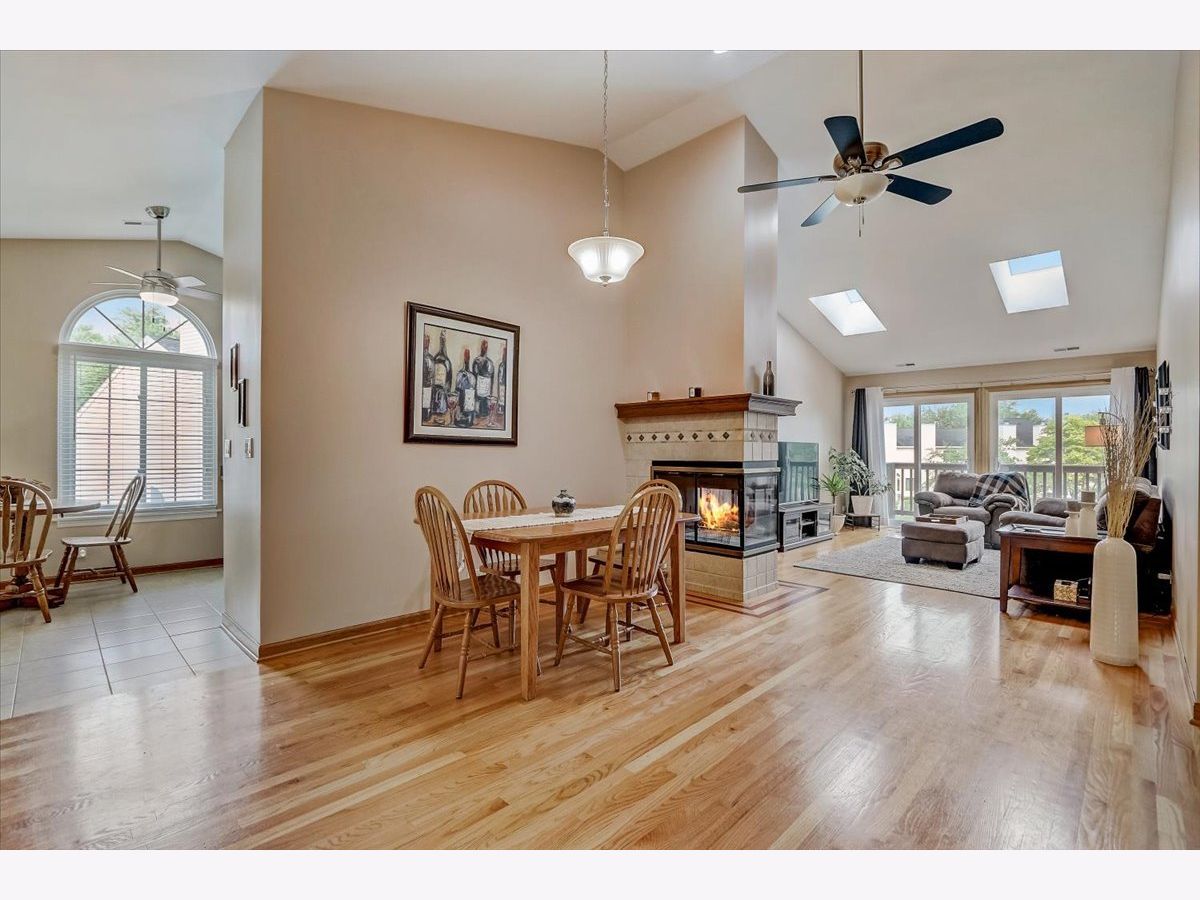 Nice 2nd floor Ranch unit featuring 2 bedrooms, 2 full baths and 1 car attached garage. End Unit! Vaulted living room has 2 skylights, dining area, 2 sided fireplace and private balcony overlooking the beautiful pond. Spacious kitchen has tile floors, eating area, tons of storage and all appliances stay. Oak Railings, gleaming hardwood floors throughout the unit except the kitchen area. Master bedroom has private bathroom w/Skylight and 2 closets. This unit is move in ready.