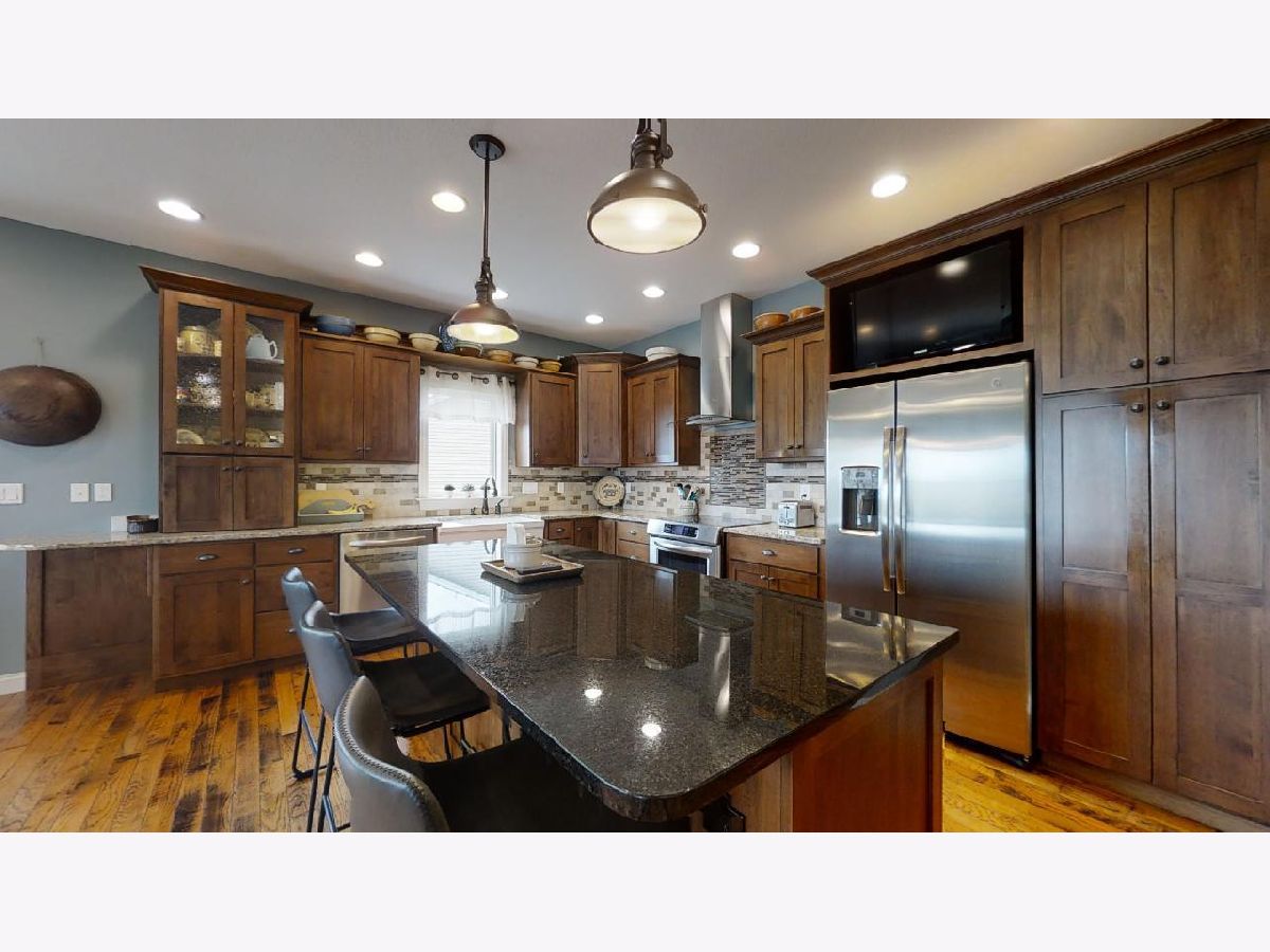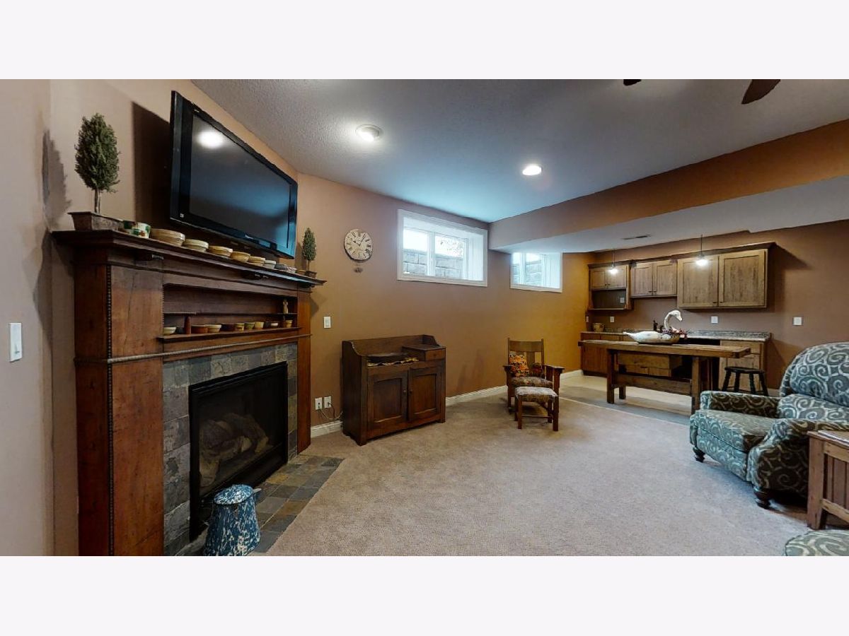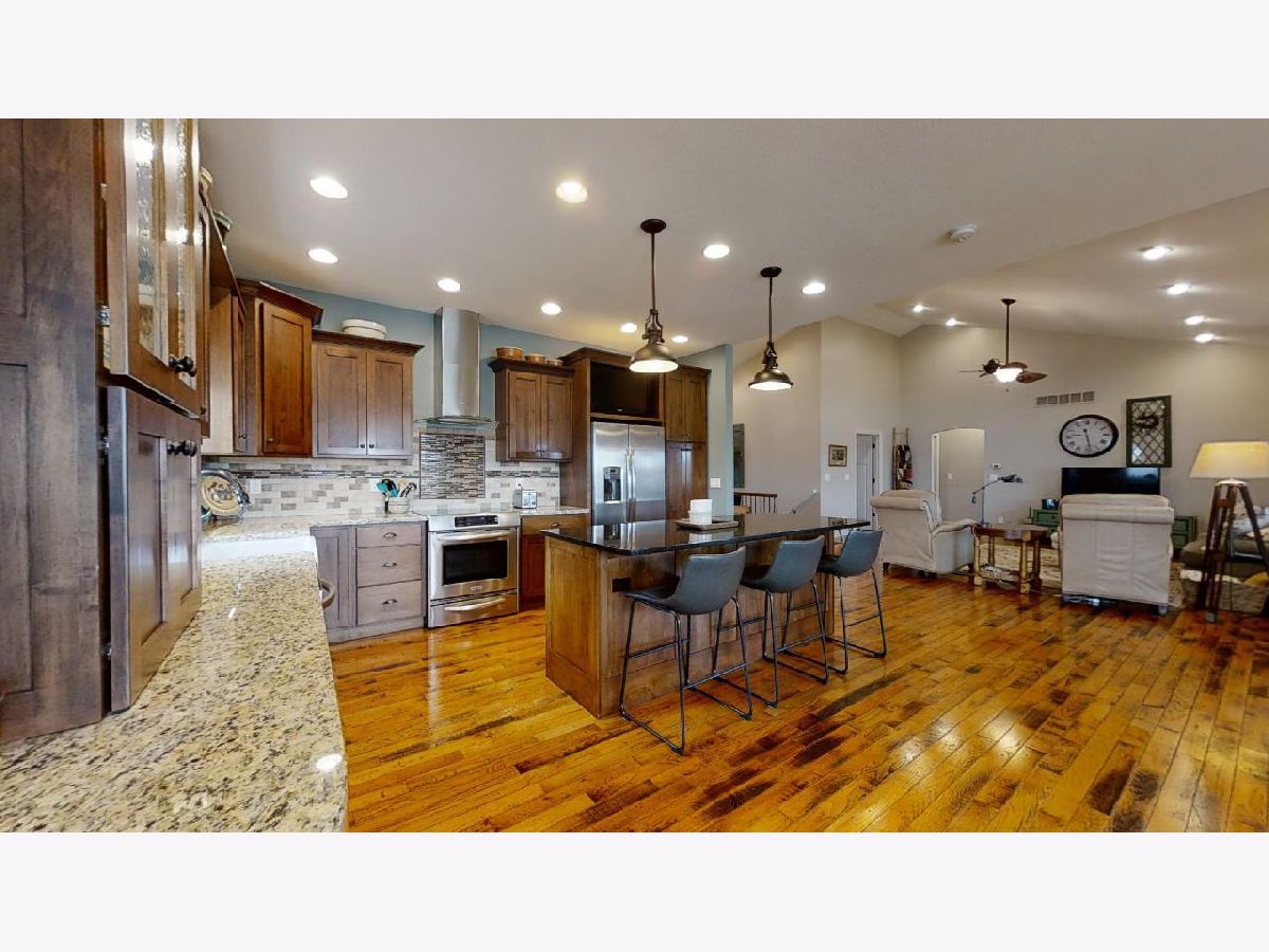 Fall in love with this stunning home in the Liberty on the Lake subdivision with panoramic views of the water! The exterior is striking with a mixture of brick and stone, beautiful landscaping, and an inviting entryway. Through the front door, you are greeted by a large foyer that opens into an open concept living, dining, and kitchen combo. Gleaming hardwood flooring flows through the heart of the home while adding so much warmth and character to the space. Vaulted ceilings and large windows with views of the lake make the space feel open and airy. You will be impressed with the modern kitchen with stainless steel appliances, warm wood cabinets, tile backsplash, granite counters, and a convenient island with seating. The open dining room was made for entertaining and includes access to the enclosed porch with nearly floor-to-ceiling views of the water. The master suite offers a serene place to relax thanks to tons of natural light, a large walk-in closet, and a spa-like master bath with modern double sinks, soaking tub, and huge walk-in shower with multiple shower heads. A second full bath sits between two warm and cozy bedrooms with great closet space. Equipped with built-in cabinets, a sink, and washer and dryer hookups, the mudroom also includes access to the amazing heated 3-car garage with room for storage, a drain and sink, and a small workshop. Entertaining is easy in the partially finished basement with a cozy fireplace, kitchenette with solid wood custom cabinetry, two large bedrooms, and a full bath. Additional room for storage in the unfinished portion of the basement. Relax and unwind outside on the wood deck overlooking the stunning lake! Built for efficiency, this house is equipped with extra insulation in the attic, Low-E glass windows, geothermal heating and cooling, 400 amp electric, and gutters and sump pump that drain into the lake! Come check this place out and make this home your personal retreat today!