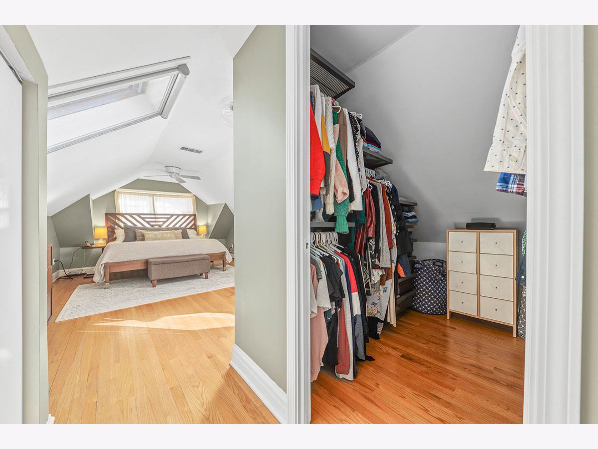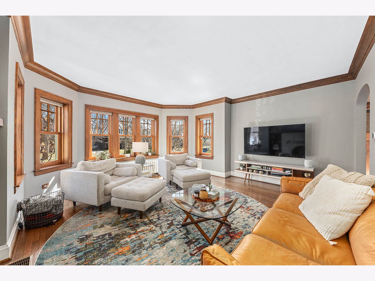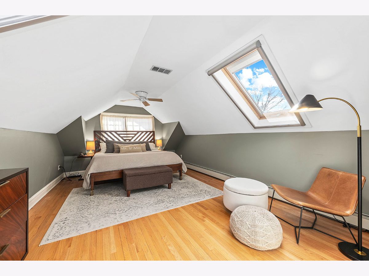 TRULY MOVE IN READY, UPDATED BUNGALOW IN OAK PARK. Brick & Hardie board exterior with professional landscaping of colorful perennial trees & flowers is ready to bloom for the next buyer. Seller has added immense value since purchasing, hates to leave, but their family has expanded & they need to upsize. Covered front entry welcomes you into the foyer with coat closet & gorgeous woodwork. Hardwood Floors throughout whole home were recently refinished. Archway leads to large living room in the front of the home featuring a curved wall of windows, brick decorative fireplace with wood mantel, hardwood floors & professionally wired tv access & wall mount. Separate dining room has new lighting, wood floors, a swing door to the kitchen & top down/bottom up shades. The updated kitchen features a walk in pantry, subway tile backsplash, all stainless appliances including newer refrigerator, new quartz countertops, farm sink, new disposal & 5 burner gas range with 2 ovens. The kitchen leads directly into the family room addition, which incorporates gorgeous views of the back yard & partially covered deck & access to the screened-in porch. Family room has great built in shelving & a French door to the 3rd bedroom currently used as an office. Full bath on first floor between both bedrooms. Upstairs you will find the primary suite which includes a generous sunny bedroom with 3 skylights with retractable screens & pull down shades and a recently updated, spa-like bathroom with soaking tub, separate shower with frameless glass door, & new vanity. Upper level also has a sitting area & two large closets with one being a walk in with new Elfa organizers as of 2022. Partially finished basement with several zones for entertaining or storage, laundry area with new washer & dryer, access door to heated crawl and door to the exterior. The property also boasts zoned heating & cooling, a 2 car, detached garage, & newer Marvin windows. EV charger added 2022. Leased solar panels added to roof in 2021 that transfer to the buyer to have a fixed utility payment every month & savings galore. Parking on street & plenty of overnight guest parking on the new concrete driveway. Since purchasing in 2017 the sellers enhanced with putting in a zoned air conditioning system, painted entire interior, changed all lighting, installed window coverings, updated kitchen, 2nd floor bath, new vanity in 1st floor bath, had main sewer cleaned out & repaired, removed & added new landscaping, added metal gate across driveway & more! This home is ready for you to call HOME!
