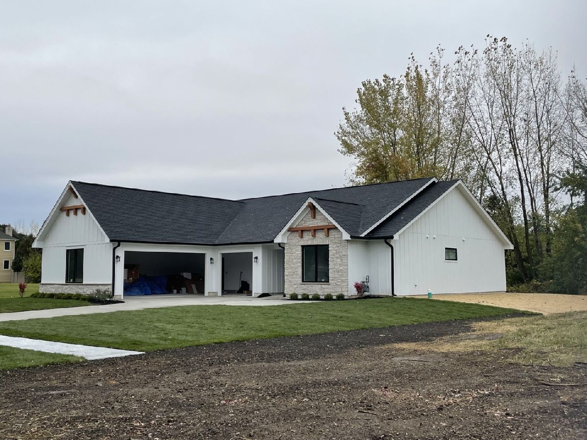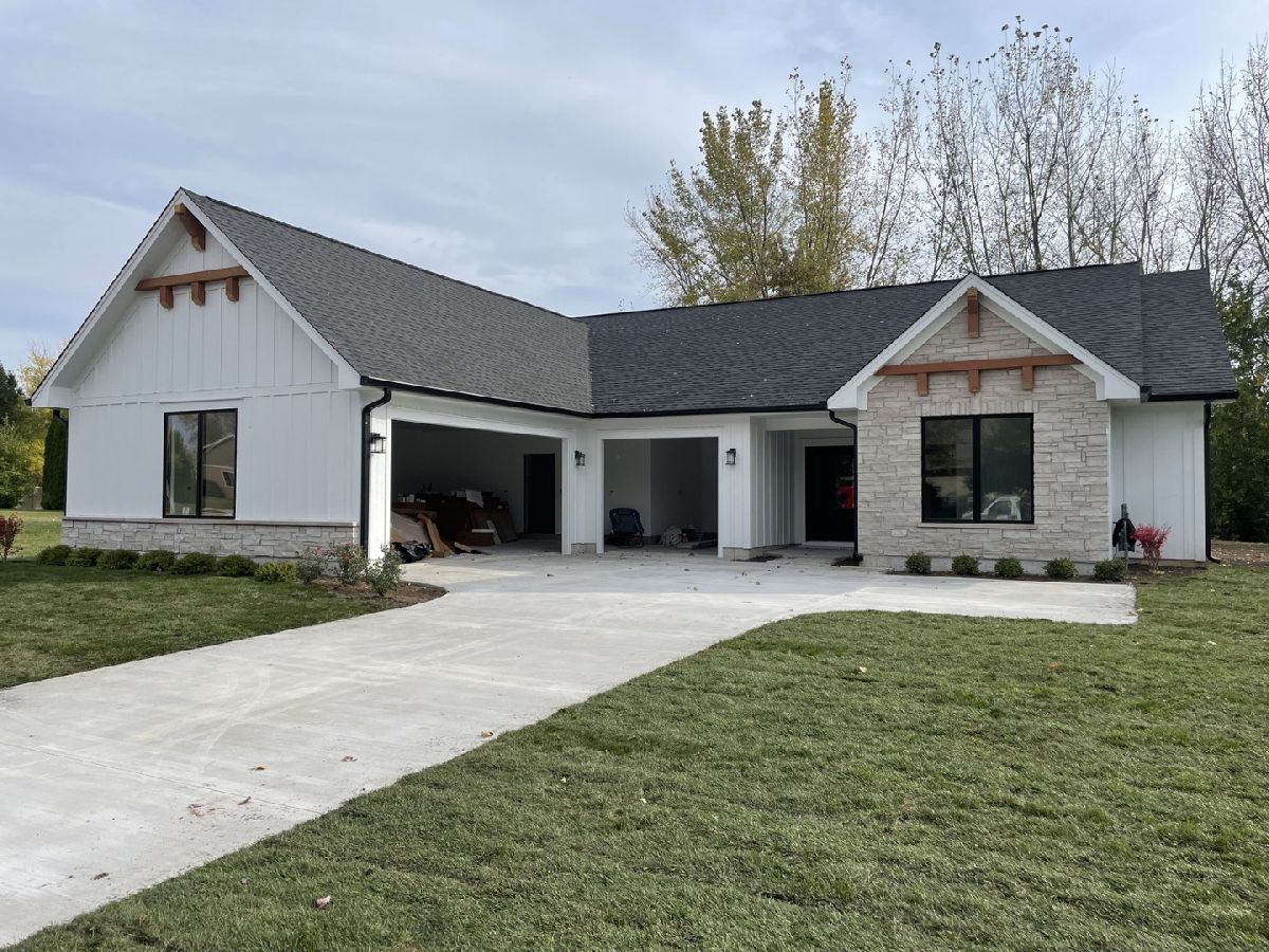 This luxury new construction modern farmhouse is being built with impeccable craftsmanship, 9 ft ceilings, and an open floor plan designed for modern living. The exterior is a showpiece with cedar accents, white Hardie board siding, stone details, and oversized Pella windows that flood the home with natural light. The heart of the home is the gourmet kitchen featuring 42-inch white cabinets, quartz countertops, an oversized accent island, under mount single bowl sink with pull-down faucet, and a spacious walk-in pantry. The kitchen flows seamlessly into the living and dining areas, highlighted by recessed can lighting, white trim, and two-panel doors throughout. The primary suite is a private retreat with a generous walk-in closet and spa-style bath offering two 42-inch vanities with multi storage drawers and sink for more counter top space. Comfort-height toilet, matching mirrors, linen closet, soaking tub with floor-mounted faucet, and an oversized walk-in shower with floor-to-ceiling tile. The second bedroom has a walk in closet. A second full bathroom includes a tub/shower combo with tile floors and tile walls to the ceiling, 42-inch vanity with matching mirror and ample storage space with sink for more countertop space. The versatile bonus room adds flexibility for family, guests, or a home office. Includes a separate laundry room with utility sink. Additional features include ample storage closets, tile flooring, a concrete driveway, oversized 3-car garage, and a large covered concrete patio perfect for outdoor living. Blending modern elegance with timeless farmhouse style, this home is the perfect combination of luxury, comfort, and functionality.