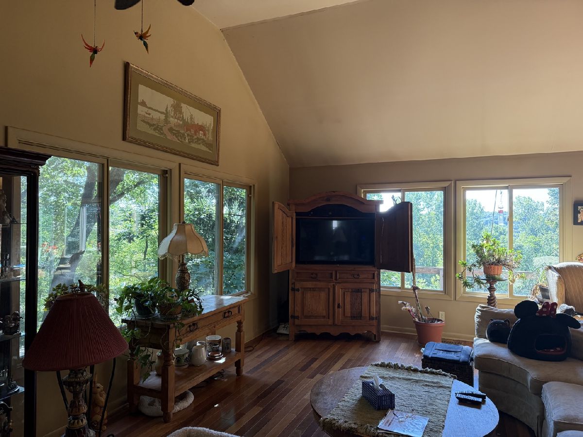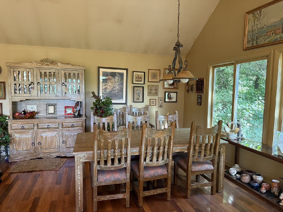 3bd/2bth home at the top of the hill with views for miles! Set on half an acre lot with mature trees, feels like you are in the North Woods! Huge wraparound deck & full walkout basement w/ studio apartment. Addition (about 10 years ago) added living/dining room combo with Brazilian Cherry floors & vaulted ceilings. 2nd Level/converted attic space is great primary suite with FP. 3 car attached garage & detached 1 car garage (rebuilt in 2025). Roof was replaced approx 10 years ago. Playground across the street. to downtown Algonquin & the river! Property being sold as-is.