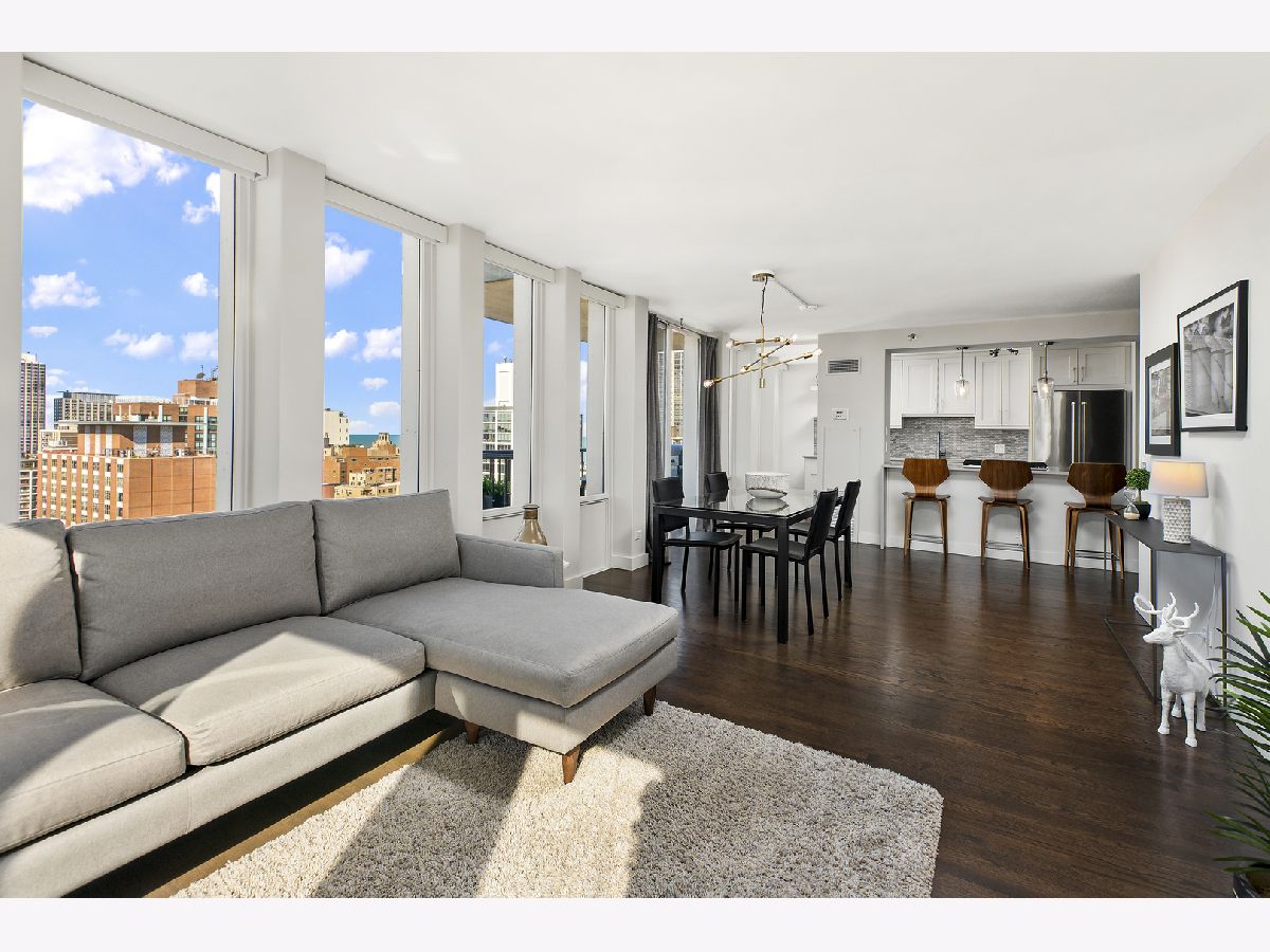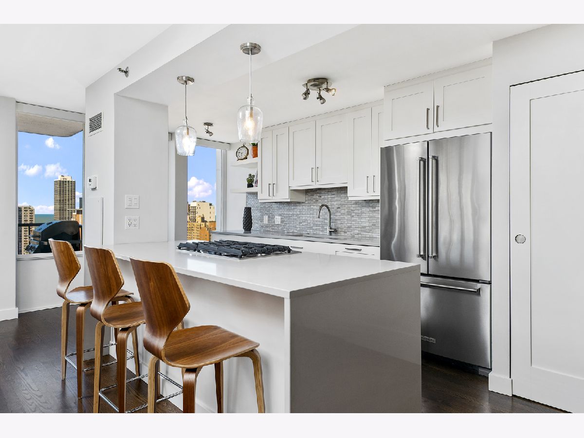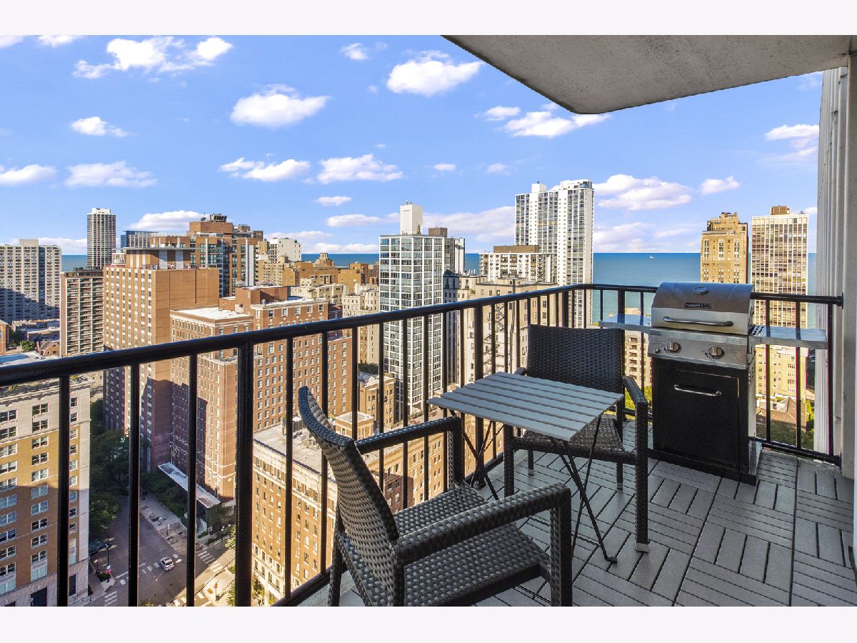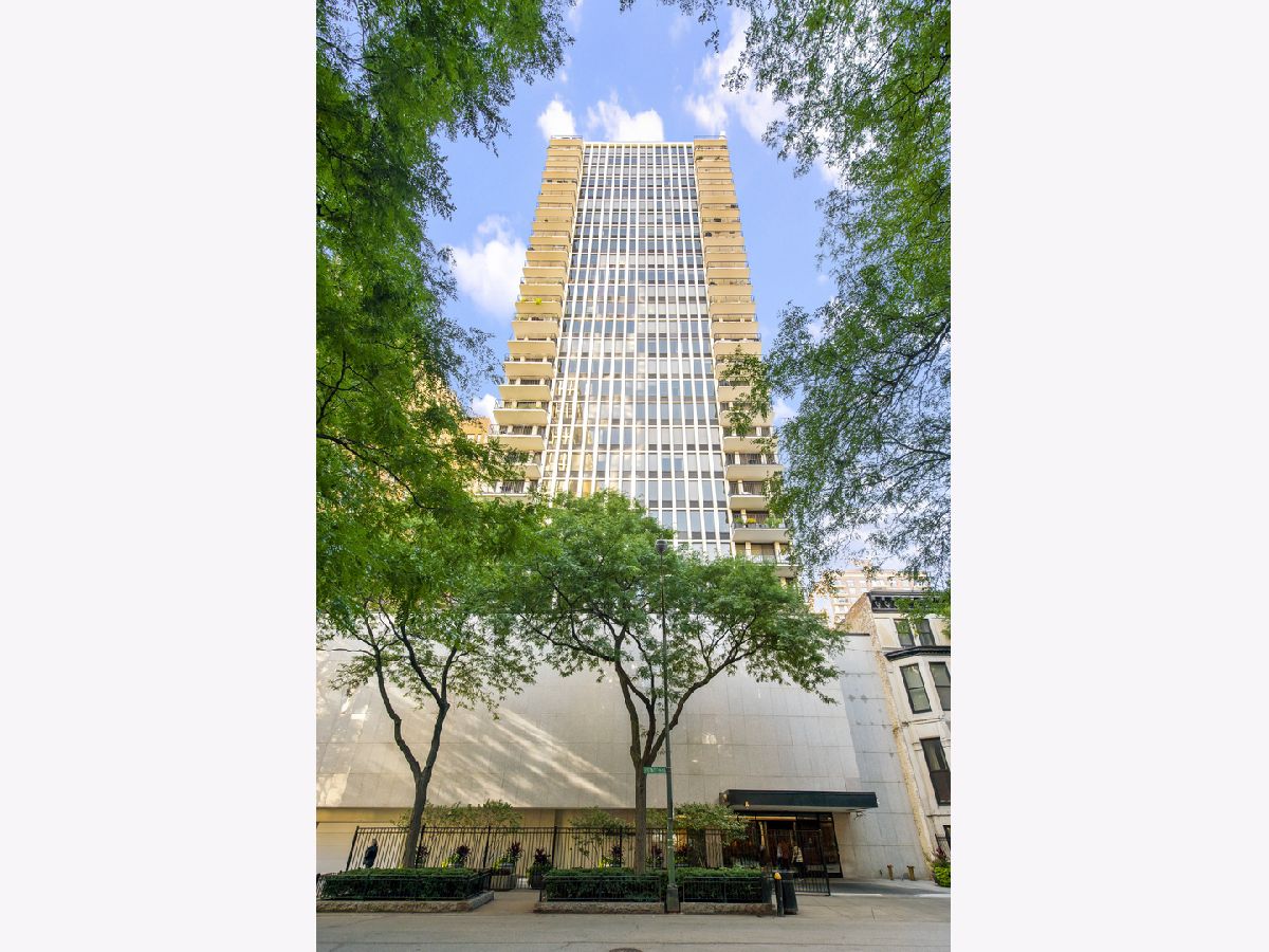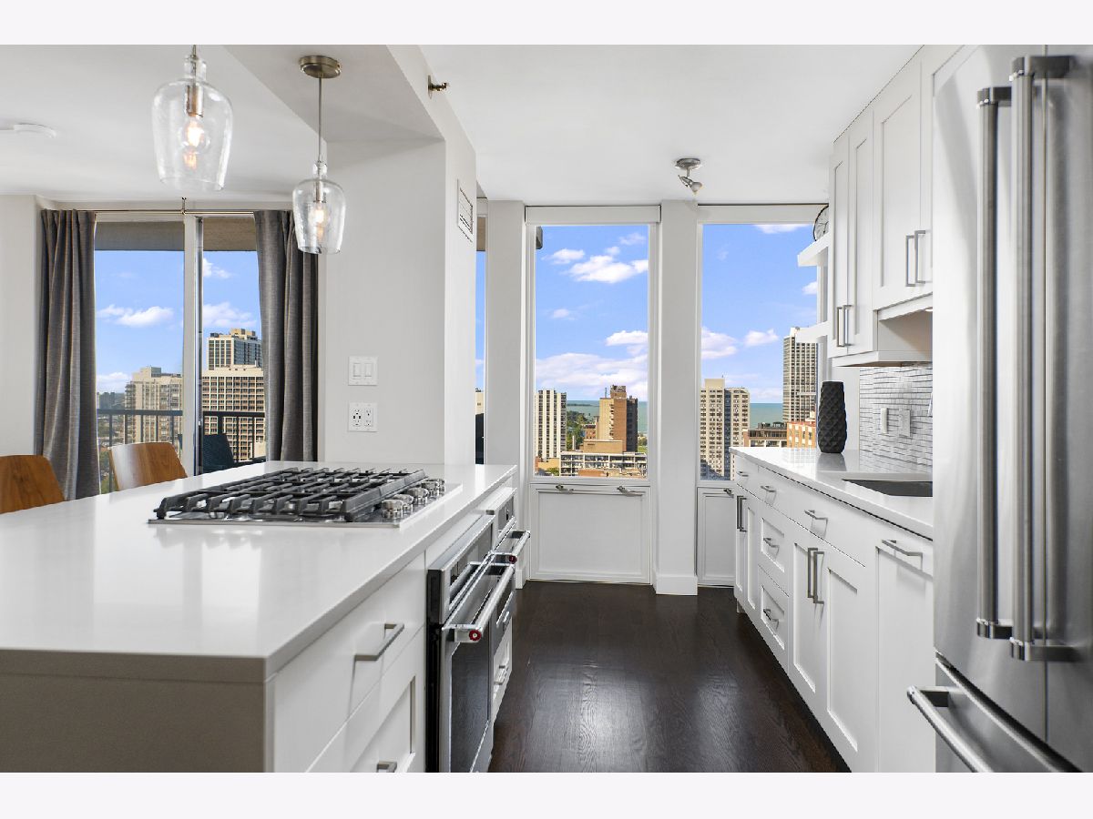 Completely and thoughtfully renovated 2 bed/ 2 bath + office in the heart of Gold Coast. High floor with spectacular north, east and west views with large balcony- tons of natural light! Solid oak hardwood floors and tons of closet space throughout. In-unit washer/ dryer! Remodeled kitchen includes solid soft-close cabinets & quartz countertops with built-in oven, cooktop and microwave as well as XL sink with garbage disposal. Professionally managed with 24 hour door security and solid 92-unit HOA, only 4 units per floor. Pet friendly, up to 35 lbs. Renovated building rooftop to be completed in October. Quiet and convenient location on historic tree-lined street, just steps to the lake, restaurants, the el and grocery stores! Prime garage parking spot is an additional $40k.