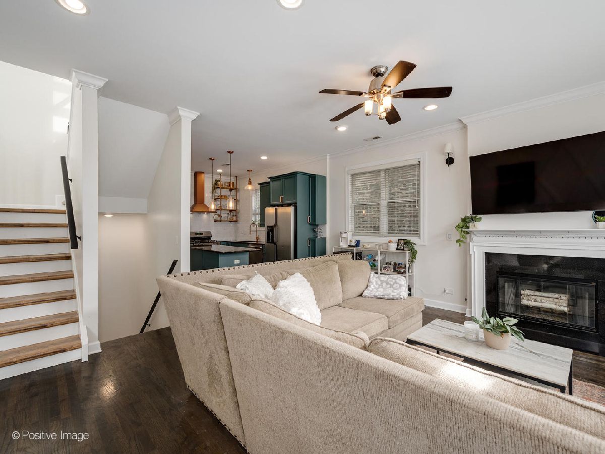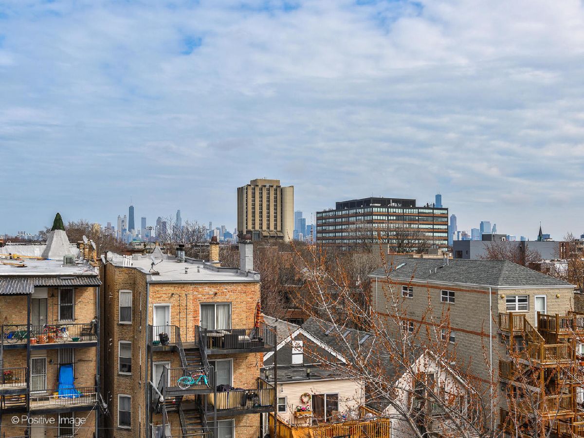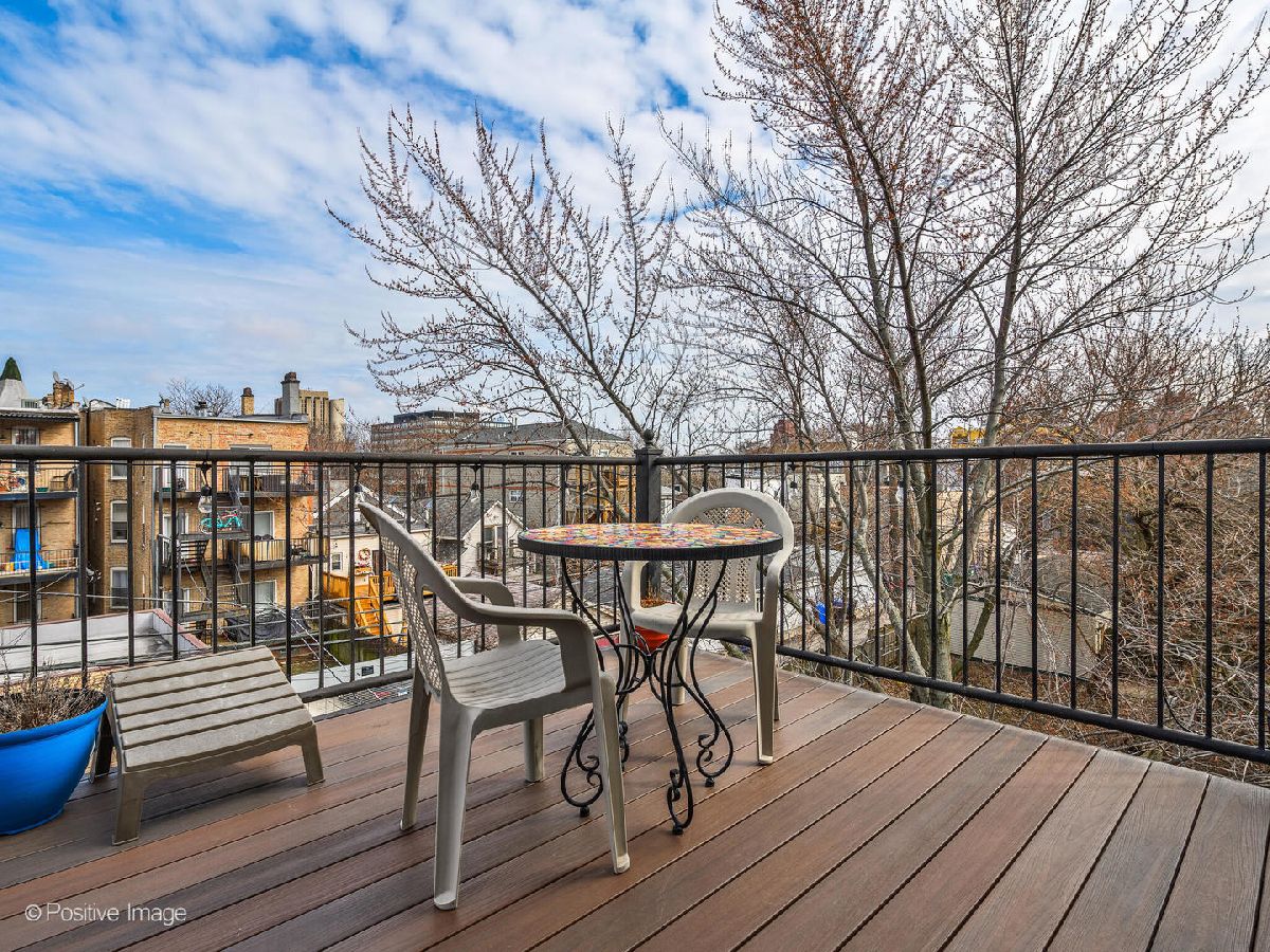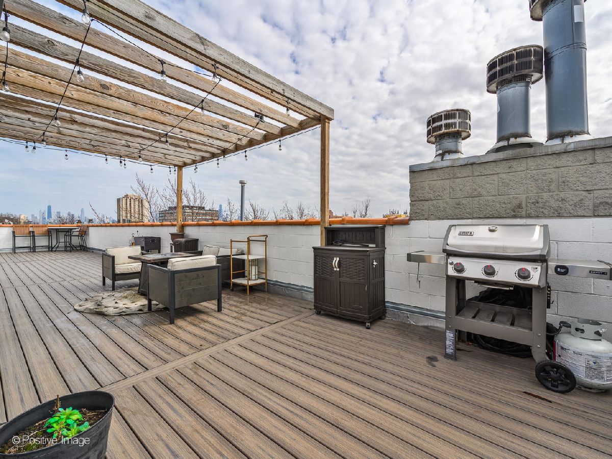 Beautifully updated 2 bedroom, 2 bathroom TOP FLOOR condo in East Humboldt Park with an amazing roof deck and skyline views! The open kitchen and living room layout is perfect for entertaining; the updated kitchen has all stainless-steel appliances, gorgeous porcelain subway tiles all the way to the ceiling, custom open shelving, and a beautiful copper range hood. The extra-wide living room offers a Juliet balcony, a gas fireplace, and a custom feature wall. Down the hall, the primary suite features TWO closets and an updated bathroom with marble countertops and an LED mirror. The second bedroom, which offers additional storage and would be a great guest room or home office, leads to the rear patio. Interior and exclusive access to the rooftop deck with brand new Trex decking and pergola with phenomenal skyline views. One car garage parking and additional storage is included in this beautiful condo home!