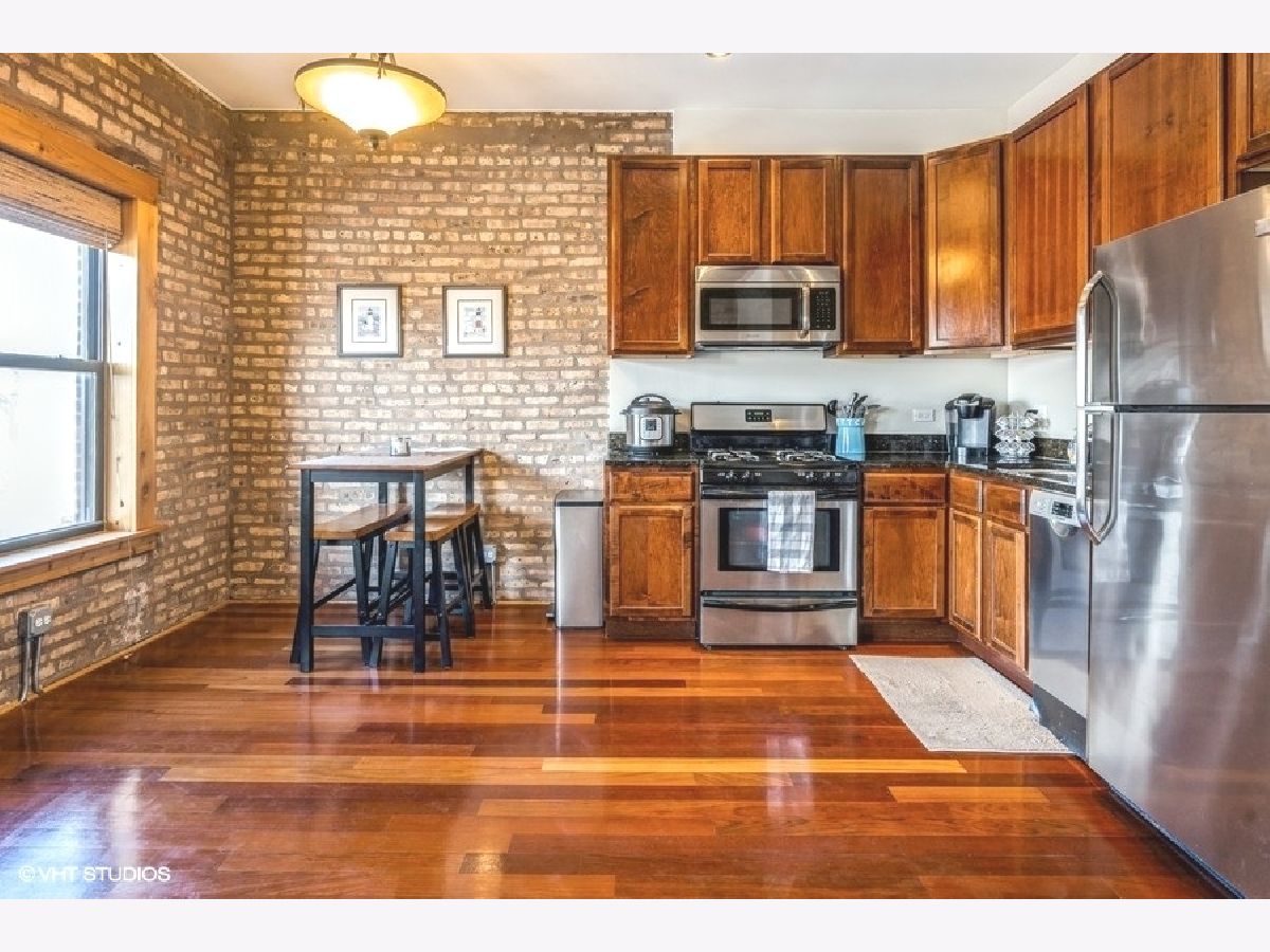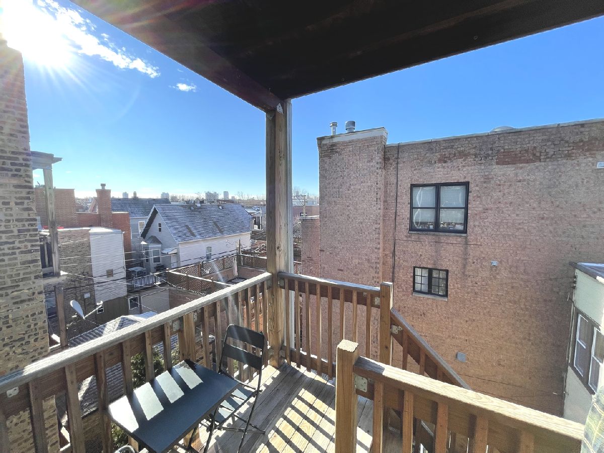 EXCEPTIONAL 2 bed/1 bath with treetop views in Southport Corridor. Located on picturesque, tree-lined, family-friendly Roscoe Street (not on El side). Third-floor skylight brightens front door entryway. Open floor plan highlights natural exposed brick walls, Brazilian cherrywood floors, and oversized windows welcoming natural light. Kitchen features 42" cherry-stained cabinets, stainless steel appliances, and granite countertops flowing into spacious dining area/living room - GREAT for entertaining! Bathroom has tub/shower combo and new cabinets/mirror. Bedrooms have ample organized closet space and large windows with INCREDIBLE views of CHICAGO SKYLINE. Second bedroom ideal for guests, home office, or study. New screened back door lets in abundant fresh air and sunshine. Ample rear deck perfect for table/chairs, grill, and panoramic view of the city. Hardwood floors and lofty 9.5' ceilings throughout, in-unit washer/dryer, newer high-efficiency furnace, central air/heat, and additional basement storage perfect for bikes and golf clubs. Pet-friendly building near neighborhood dog parks allows large breeds. Parking Permit Zone 383, easy-to-find leased parking, or free street parking nearby. Quick 3-minute walk to Starbucks and Southport Brown Line, short 10-minute walk to Jewel-Osco. This prime location within easy walking distance of countless amenities - entertainment, health clubs, restaurants, shopping, and WRIGLEY FIELD. Don't miss this one!