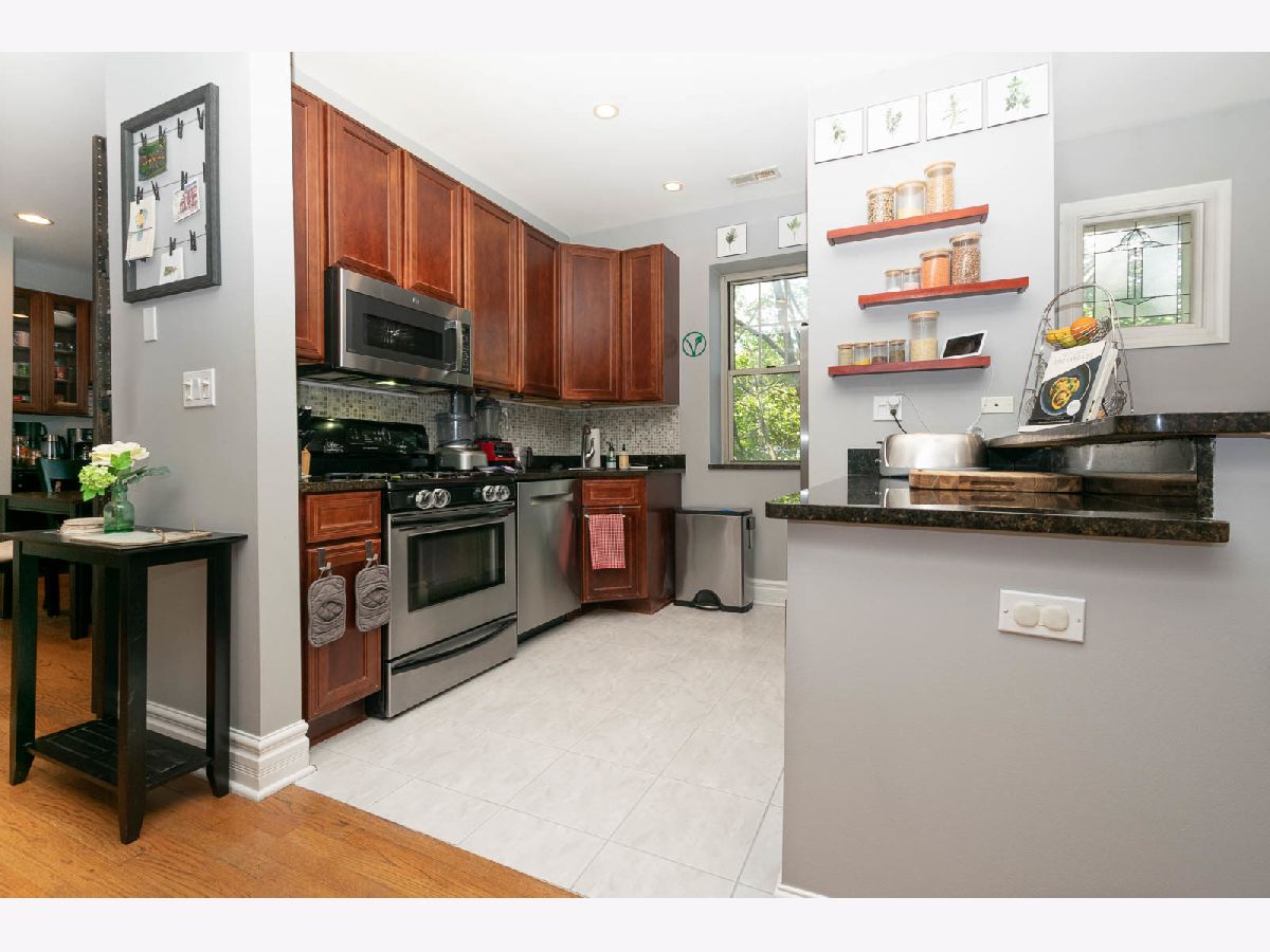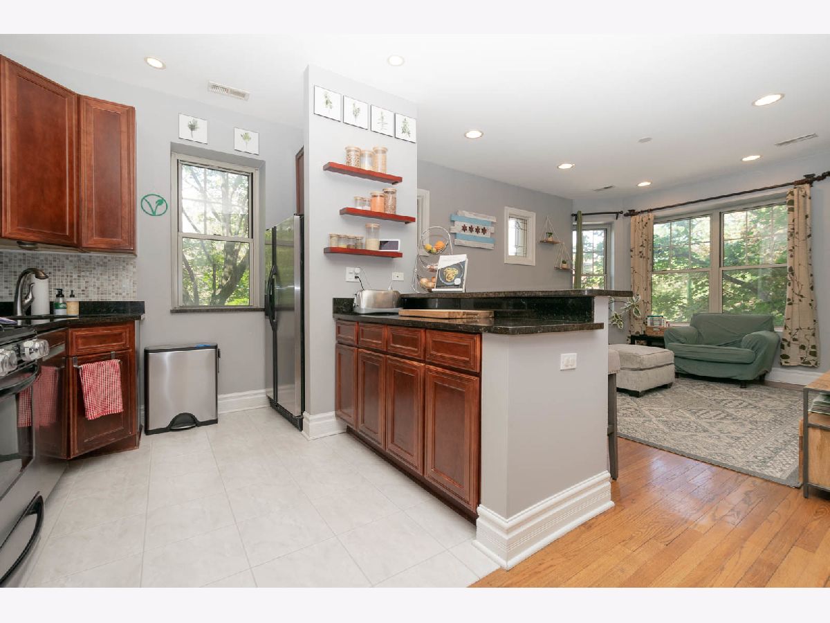 This Edgewater 2 bedroom/2 bathroom condo has one of the best floor plans in the building! This corner unit has amazing sunlight and treetop views from every window and also features a large dining room and huge primary bedroom suite. The kitchen has gorgeous cherry cabinets, granite countertops and stainless steel appliances plus space for bar stools. The dining room has a built-in wet bar that is perfect for your entertaining needs or your coffee bar. The primary bedroom has plenty of room for a king sized bed plus a Juliet balcony, a walk in closet and an attached bathroom with a subway tile shower. Other great features of this condo include central heat/AC, hardwood floors throughout and an upgraded washer & dryer. Fantastic Edgewater location on a tree lined street near the Granville red line stop, the beach, lakefront trails and lots of retail, dining and entertainment. Easy street parking!