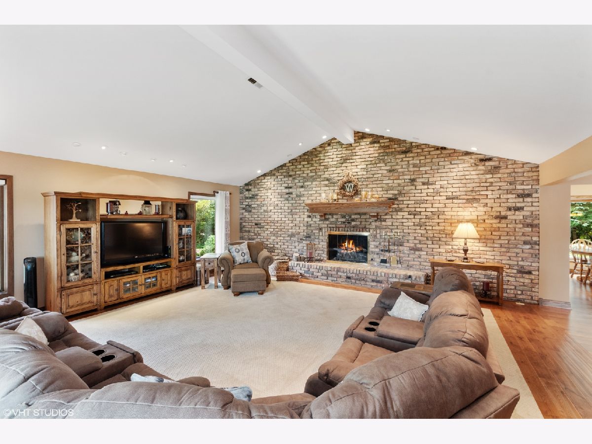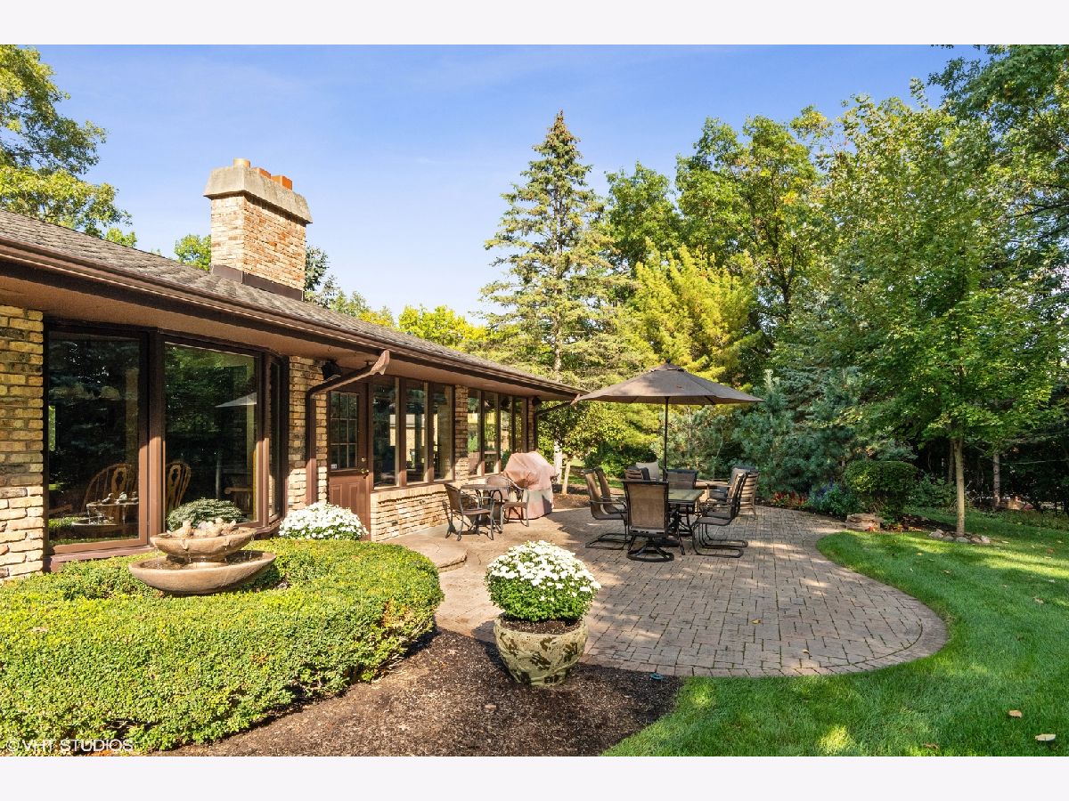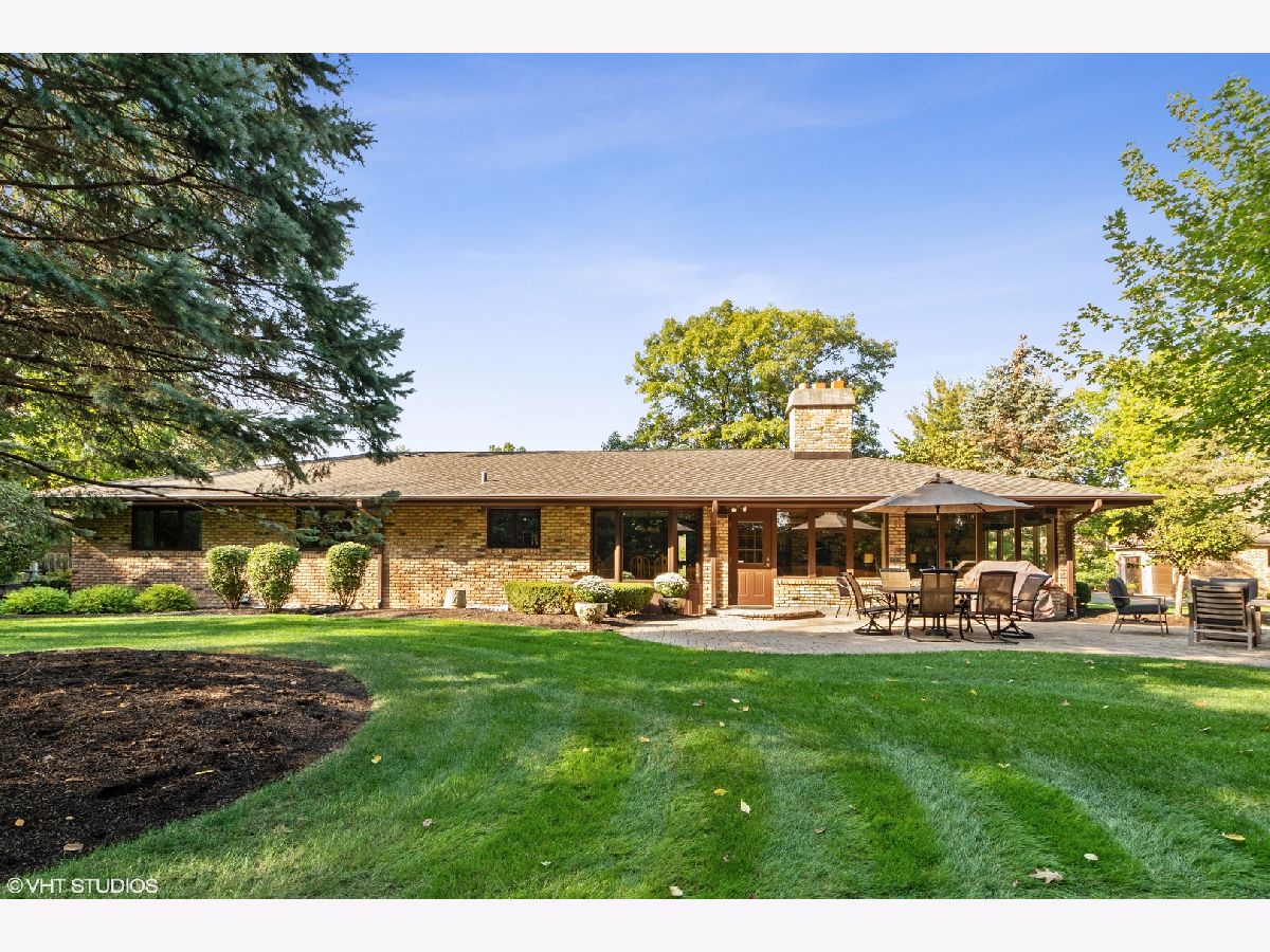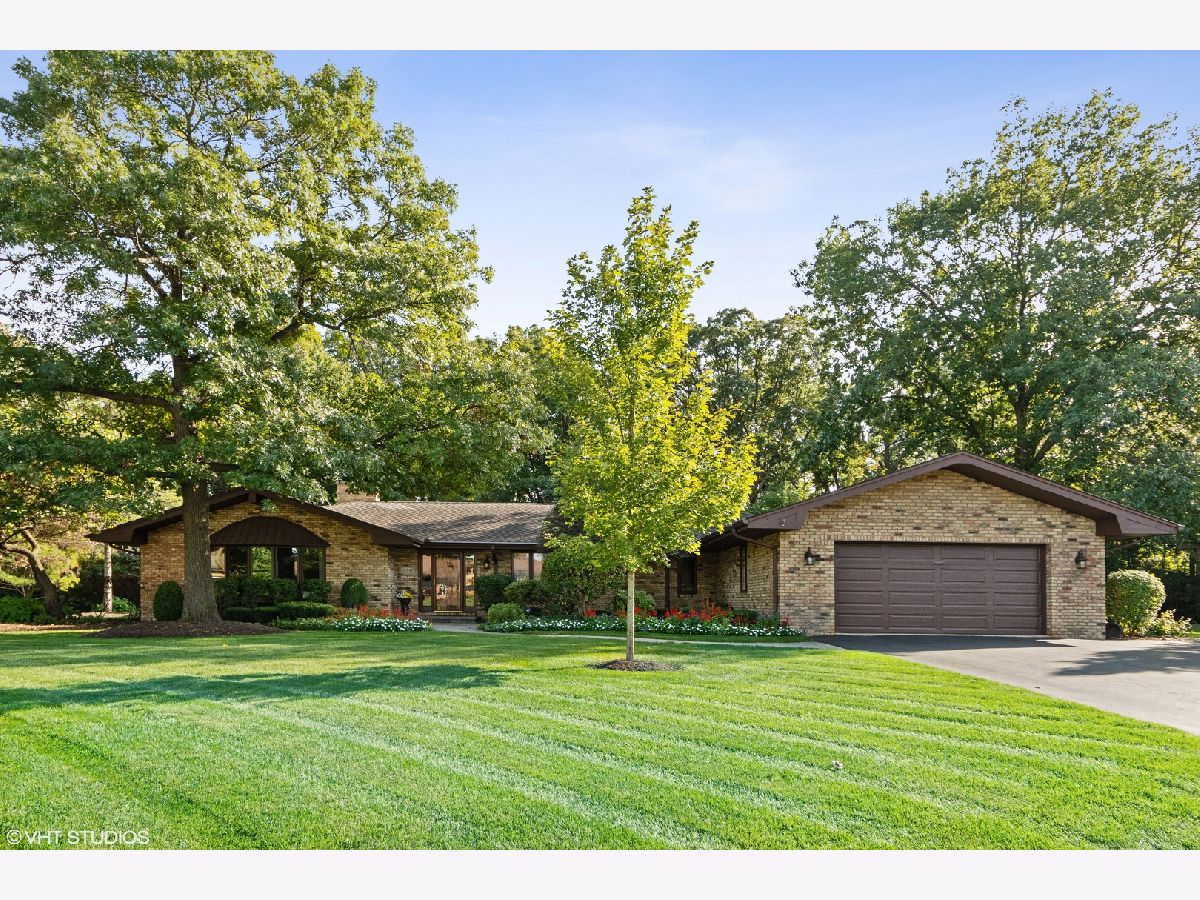 Custom, sprawling brick ranch set on a lush private wooded lot. Welcoming entry with designer lighted ceiling opens to huge great room with brick fireplace wall and vaulted ceiling. Stunning hardwood flooring. Warm kitchen offers loads of cabinets, buffet area and granite countertops adjoins the sunroom with built ins and second fireplace. Enjoy the views of the spectacular yard from paver patio. Master bed bath recently updated, Full finished basement with expoed brick walls, wet bar, 4th and 5th bedrooms, exercise room and storage room.