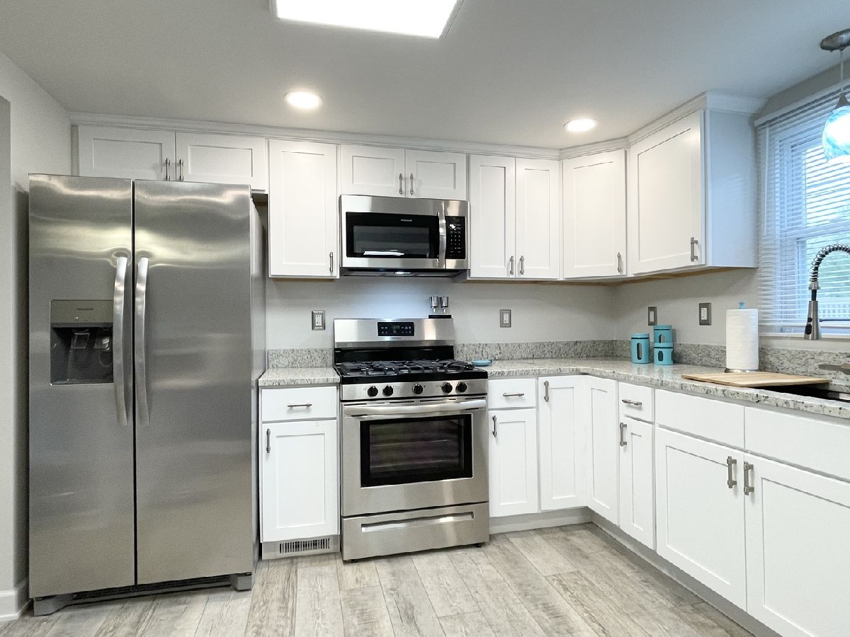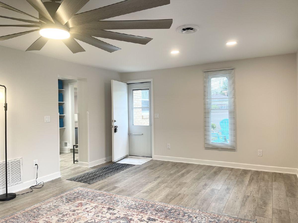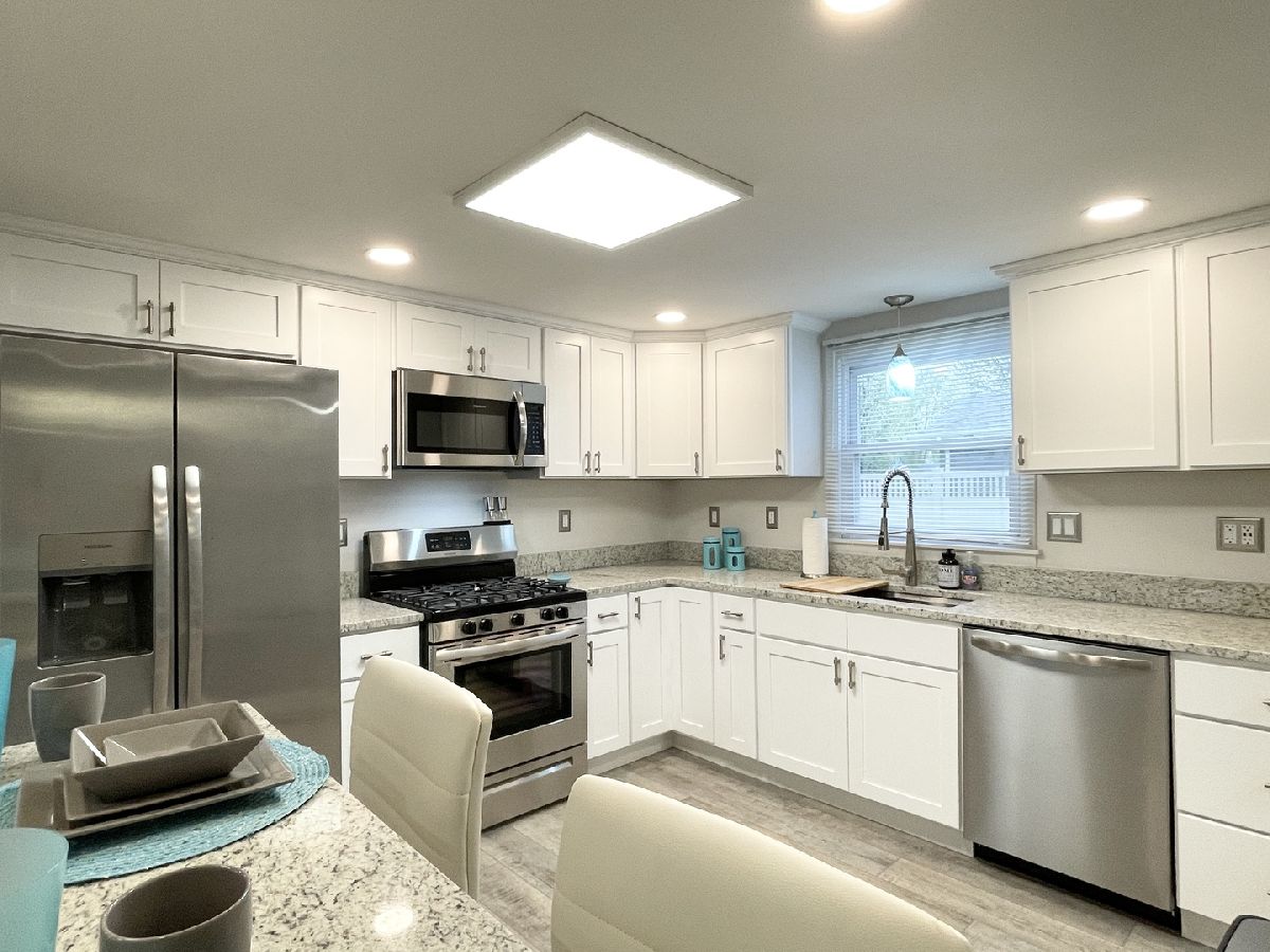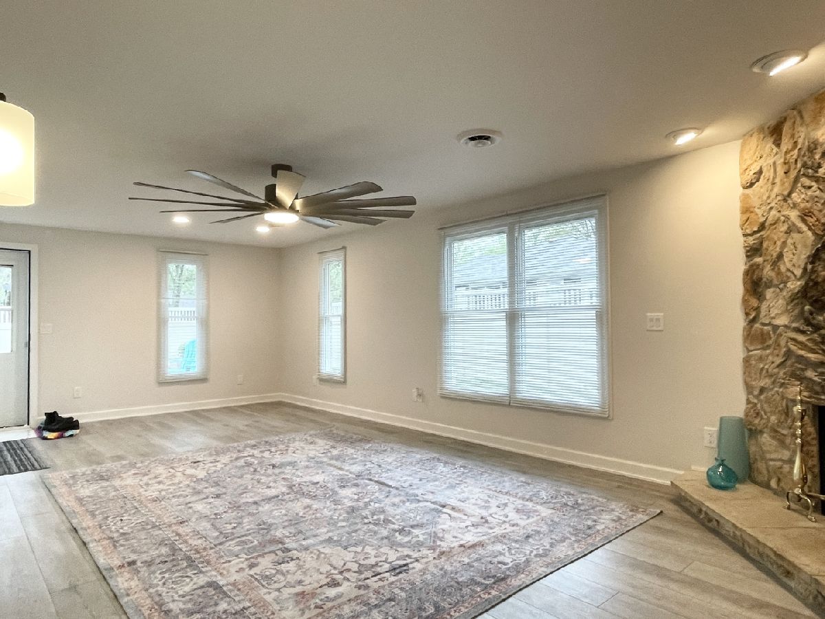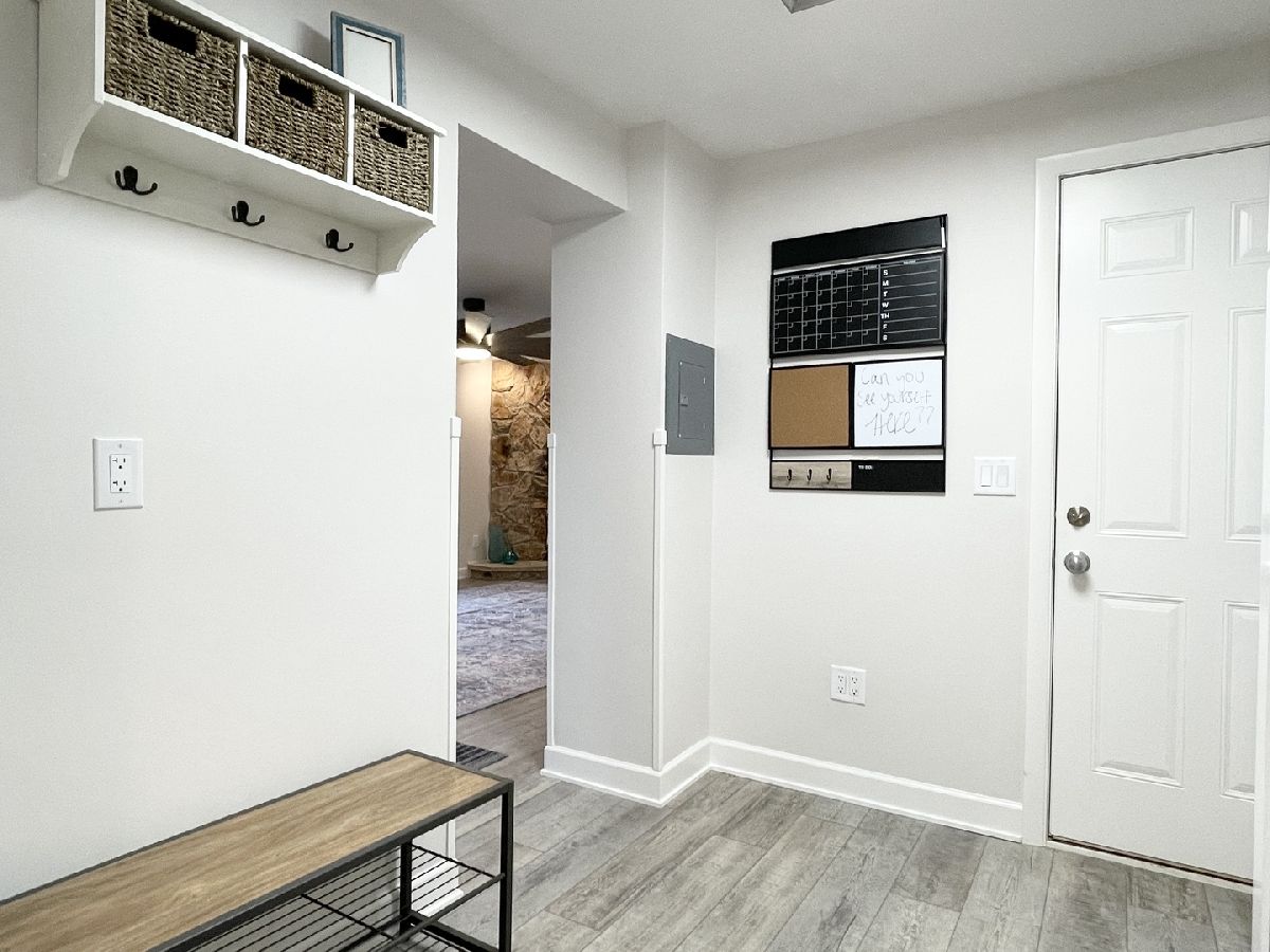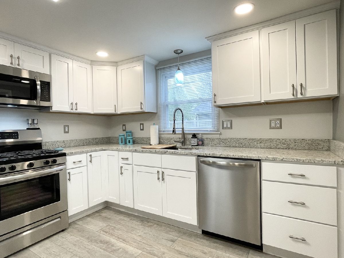 Stunning 1950s All-Brick Ranch-Completely Remodeled in 2022. Step into timeless charm blended with modern convenience in this fully renovated all-brick ranch from the 1950s. Every detail of this home has been thoughtfully updated (2022) to create a Mid-Century Modern living experience. The kitchen features sleek cabinetry, granite counter-tops, a breakfast bar that functions as a table for 4 people, stainless steel appliances, and durable vinyl plank flooring that flows throughout the entire home. Both bathrooms have been fully remodeled. The full bath has a designer raised vanity, penny tiles on the floor and subway tiles on the walls. The windows and modern lighting ensure a bright, inviting atmosphere. The attached two-car garage boasts a beautiful epoxy floor, cabinetry, a storage rack, and a car charger for your electric vehicle. A partition wall adds valuable extra storage space, keeping your garage organized and functional. Inside, the spacious family room features a cozy gas fireplace. The third bedroom, tucked at the back of the house near a half bath and the back entrance, offers privacy and versatility as it may be an ideal office. The large laundry room includes washer and dryer, a sink and a large cabinet ideal for storage and a folding counter. The mud room off the garage and laundry room is great for removing coats and shoes before entering the main home. Outside, enjoy a generously sized fenced-in yard with a useful shed-perfect for outdoor hobbies and entertaining.The freshly poured concrete driveway and patio are complemented by professional landscaping with river rock and an impressive granite boulder by the front walk-way creating a welcoming curb appeal. This home effortlessly balances classic character with today's modern amenities. Call today to schedule your private showing! Agent owned.