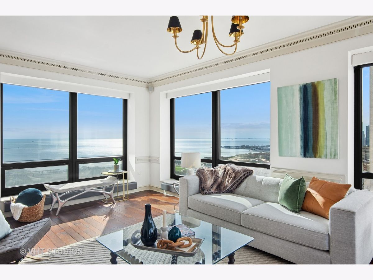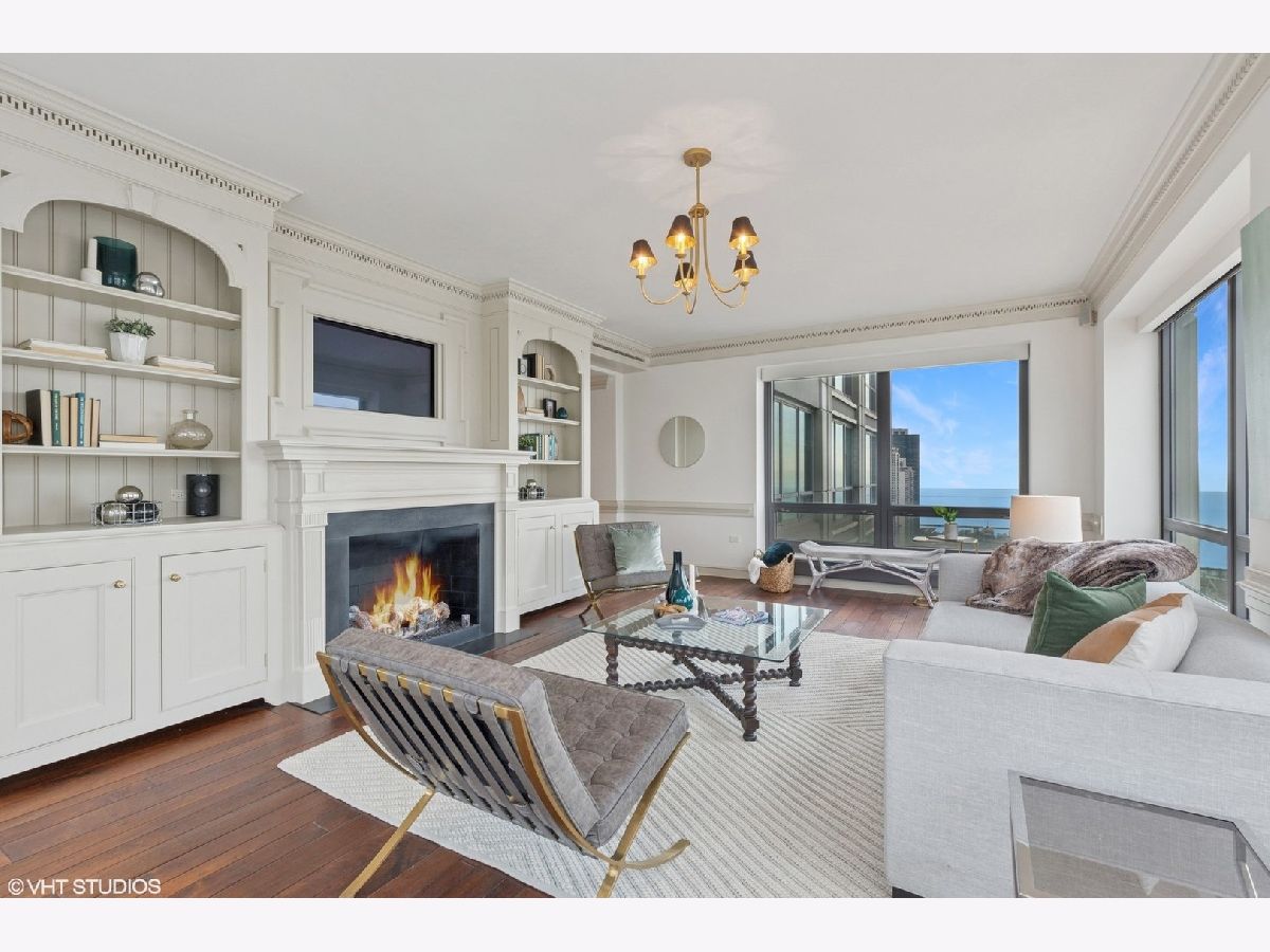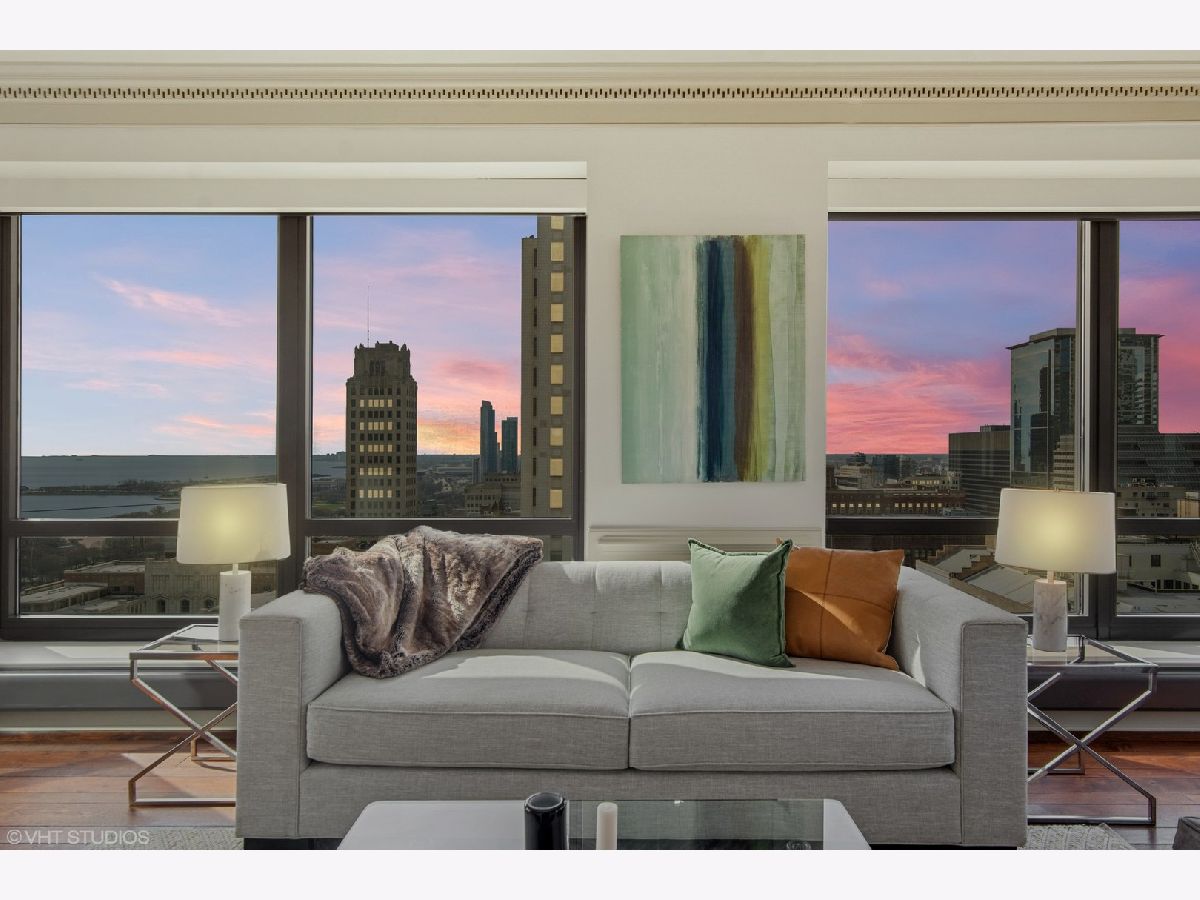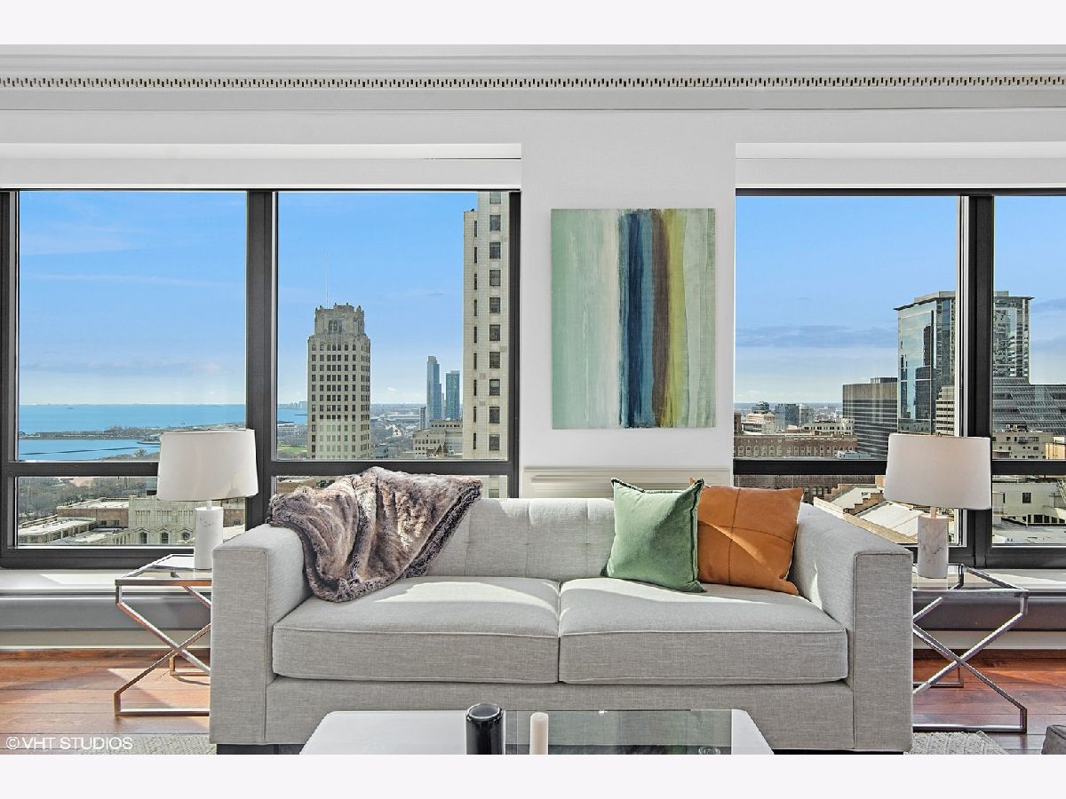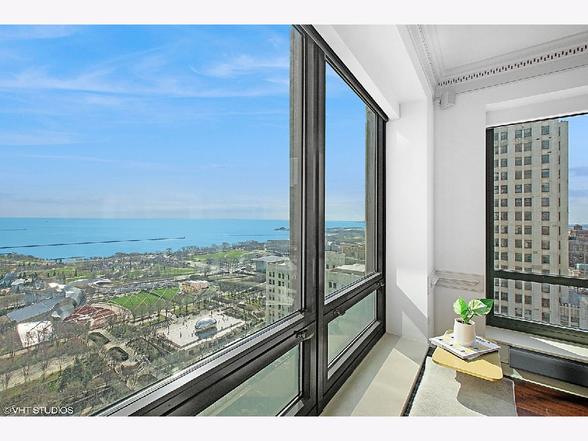Gracious three-bedroom, 2.5 bath, corner condominium with floor-to-ceiling windows that provide breathtaking views of Lake Michigan, the city, as well as 'The Bean' and the rest of Millennium Park. This 2100 sq ft home, carefully maintained by a single owner, features beautiful built-in cabinetry, solid core doors, plus high quality, hand-scraped, wide-plank walnut floors and custom crown molding throughout. Windows on three sides of the living room / dining area fill the home with natural light, while the room's case work surrounds a gas fireplace, above which a clever sliding panel disguises a built-in television. Centrally-controlled speakers can distribute entertainment to all rooms, including the master bath. The custom kitchen features in-cabinet and under-cabinet lighting, solid brass fixtures, stone countertops, and a pantry. Elegant and practical lighting enhances every room. Electric window shades filter sunlight effectively when needed and remain out of sight otherwise. In-unit laundry facilities are a plus. The home is genuinely move-in-ready; its neutral color selections can easily accommodate a wide variety of interior design styles. The Heritage is a quiet building with courteous and professional 24-hour door staff, on-site management, party and conference rooms, sauna, indoor pool and whirlpool, fitness center, outdoor terraces, dog run, storage, and Pedway access. Located just off Michigan Avenue, the area is within walking distance of shopping, theaters, museums, and restaurants. There is easy access to public transportation (Red, Blue, Orange and Brown lines, plus the Illinois Central train) and nearby highways.