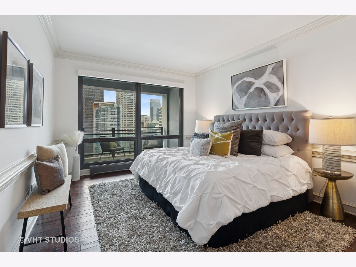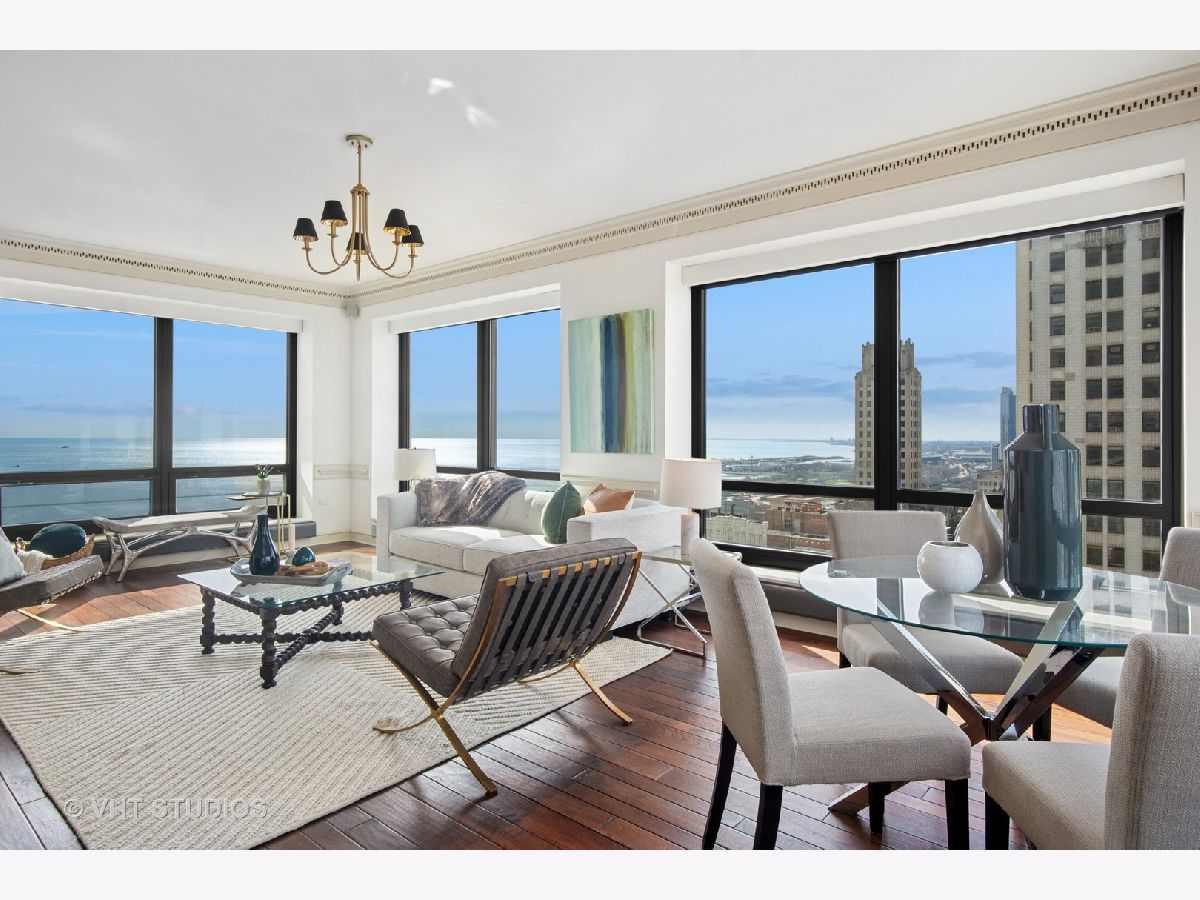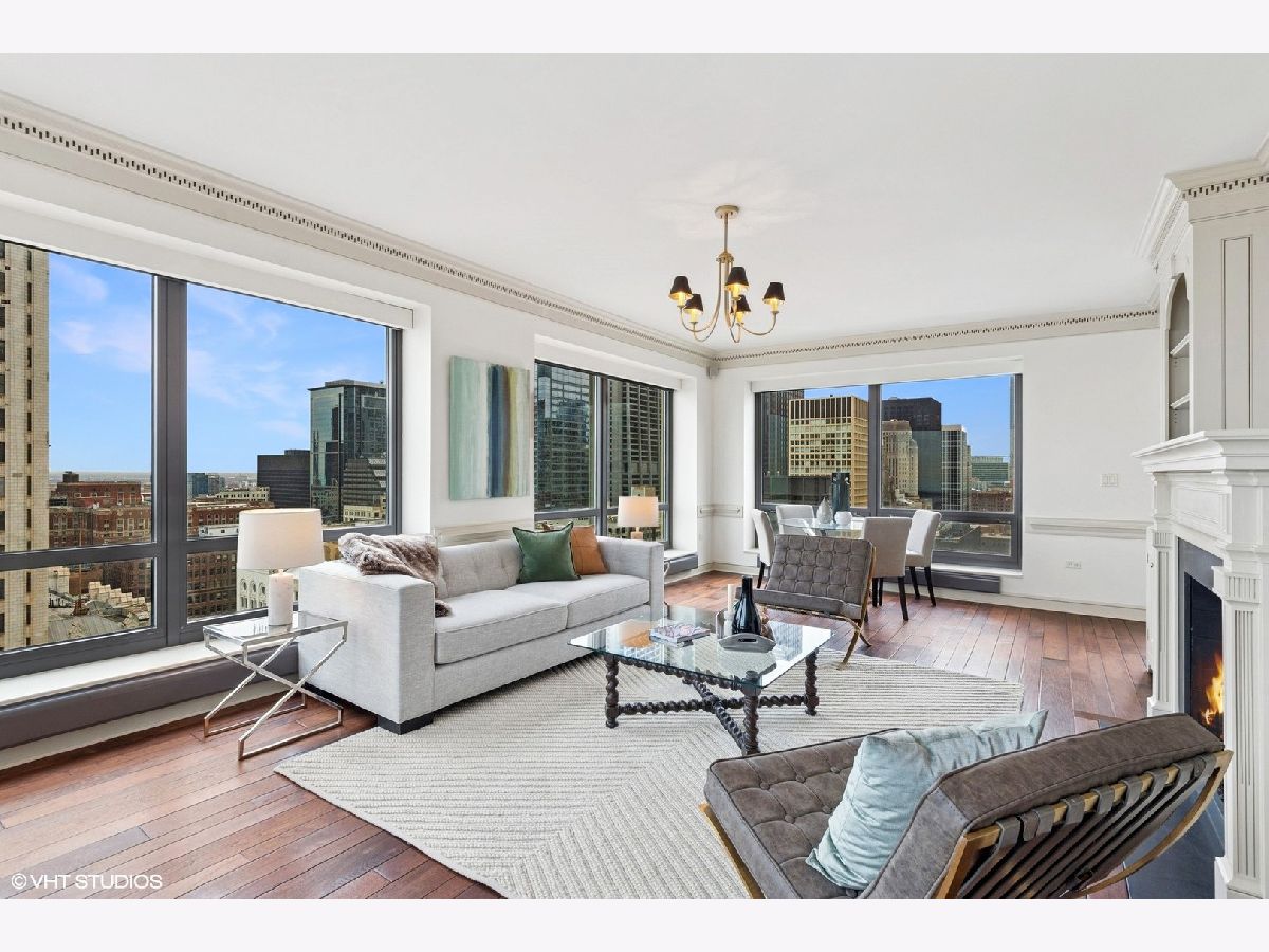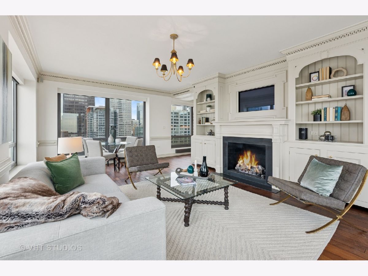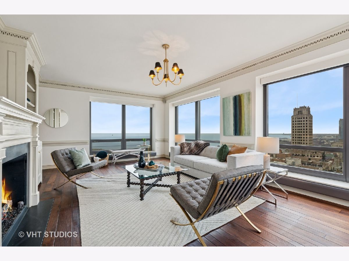 Gracious three-bedroom, 2.5 bath, corner condominium with floor-to-ceiling windows that provide breathtaking views of Lake Michigan, the city, as well as 'The Bean' and the rest of Millennium Park. This 2100 sq ft home, carefully maintained by a single owner, features beautiful built-in cabinetry, solid core doors, plus high quality, hand-scraped, wide-plank walnut floors and custom crown molding throughout. Windows on three sides of the living room / dining area fill the home with natural light, while the room's case work surrounds a gas fireplace, above which a clever sliding panel disguises a built-in television. Centrally-controlled speakers can distribute entertainment to all rooms, including the master bath. The custom kitchen features in-cabinet and under-cabinet lighting, solid brass fixtures, stone countertops, and a pantry. Elegant and practical lighting enhances every room. Electric window shades filter sunlight effectively when needed and remain out of sight otherwise. In-unit laundry facilities are a plus. The home is genuinely move-in-ready; its neutral color selections can easily accommodate a wide variety of interior design styles. The Heritage is a quiet building with courteous and professional 24-hour door staff, on-site management, party and conference rooms, sauna, indoor pool and whirlpool, fitness center, outdoor terraces, dog run, storage, and Pedway access. Located just off Michigan Avenue, the area is within walking distance of shopping, theaters, museums, and restaurants. There is easy access to public transportation (Red, Blue, Orange and Brown lines, plus the Illinois Central train) and nearby highways.