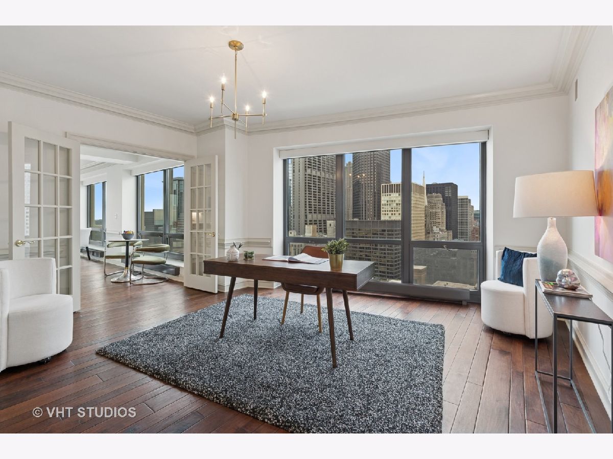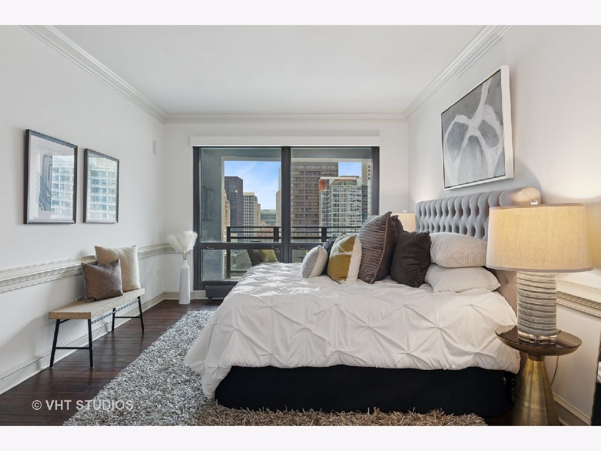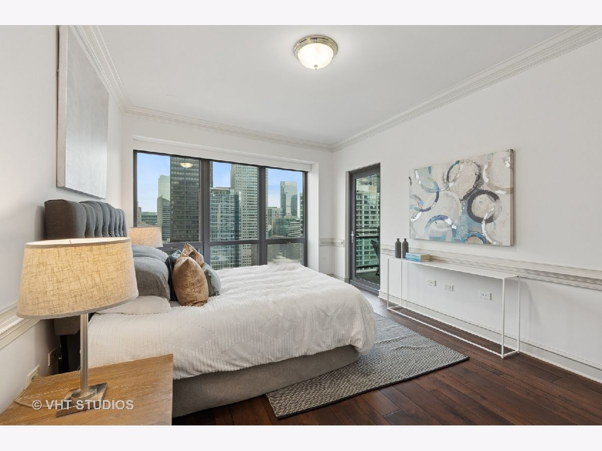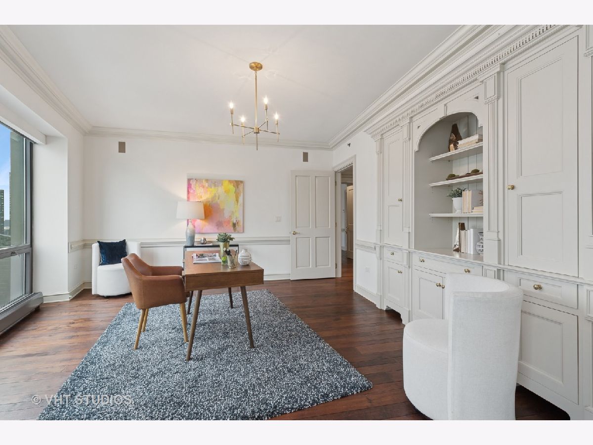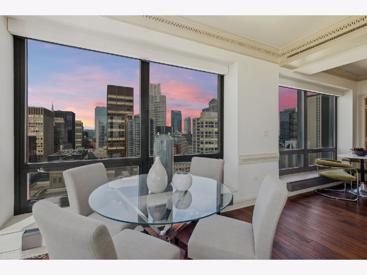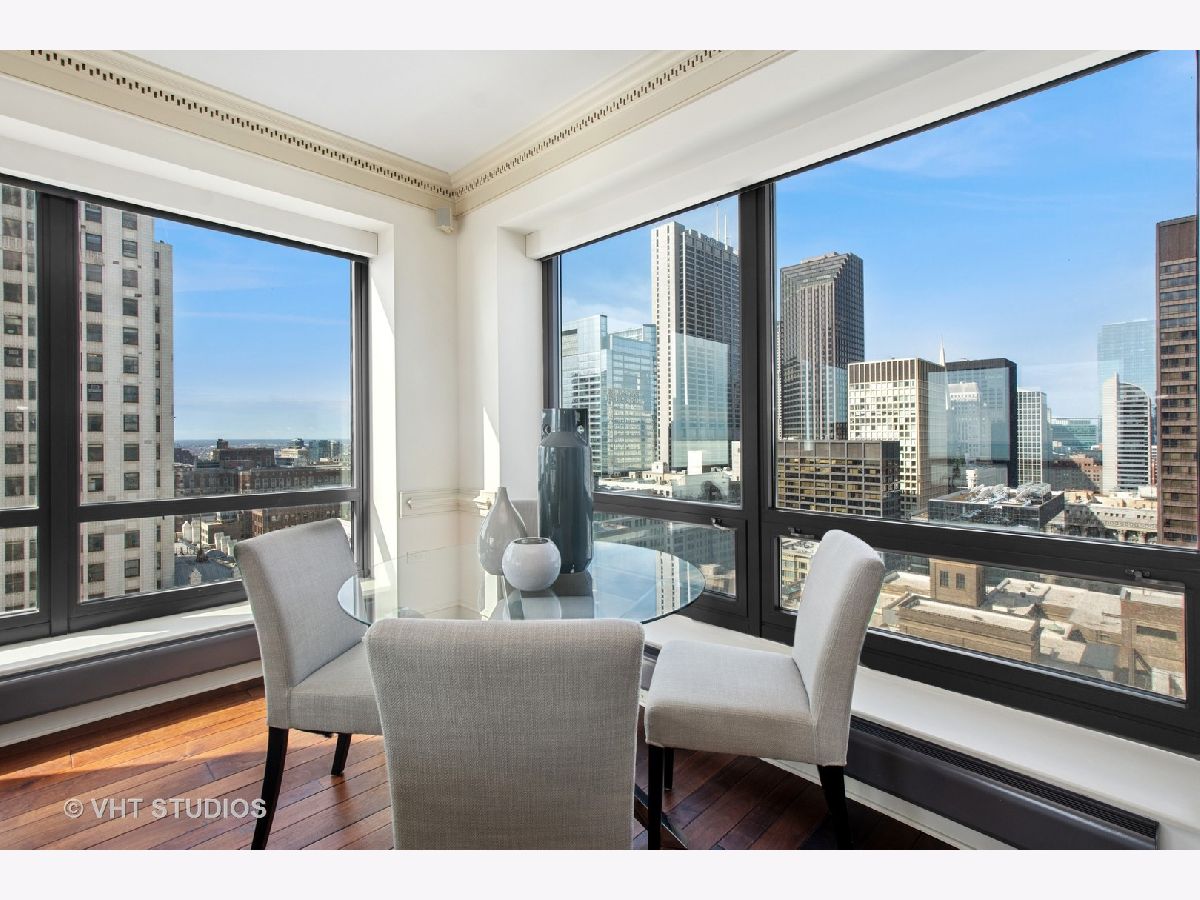 Gracious three-bedroom, 2.5 bath, corner condominium with floor-to-ceiling windows that provide breathtaking views of Lake Michigan, the city, as well as 'The Bean' and the rest of Millennium Park. This 2100 sq ft home, carefully maintained by a single owner, features beautiful built-in cabinetry, solid core doors, plus high quality, hand-scraped, wide-plank walnut floors and custom crown molding throughout. Windows on three sides of the living room / dining area fill the home with natural light, while the room's case work surrounds a gas fireplace, above which a clever sliding panel disguises a built-in television. Centrally-controlled speakers can distribute entertainment to all rooms, including the master bath. The custom kitchen features in-cabinet and under-cabinet lighting, solid brass fixtures, stone countertops, and a pantry. Elegant and practical lighting enhances every room. Electric window shades filter sunlight effectively when needed and remain out of sight otherwise. In-unit laundry facilities are a plus. The home is genuinely move-in-ready; its neutral color selections can easily accommodate a wide variety of interior design styles. The Heritage is a quiet building with courteous and professional 24-hour door staff, on-site management, party and conference rooms, sauna, indoor pool and whirlpool, fitness center, outdoor terraces, dog run, storage, and Pedway access. Located just off Michigan Avenue, the area is within walking distance of shopping, theaters, museums, and restaurants. There is easy access to public transportation (Red, Blue, Orange and Brown lines, plus the Illinois Central train) and nearby highways.