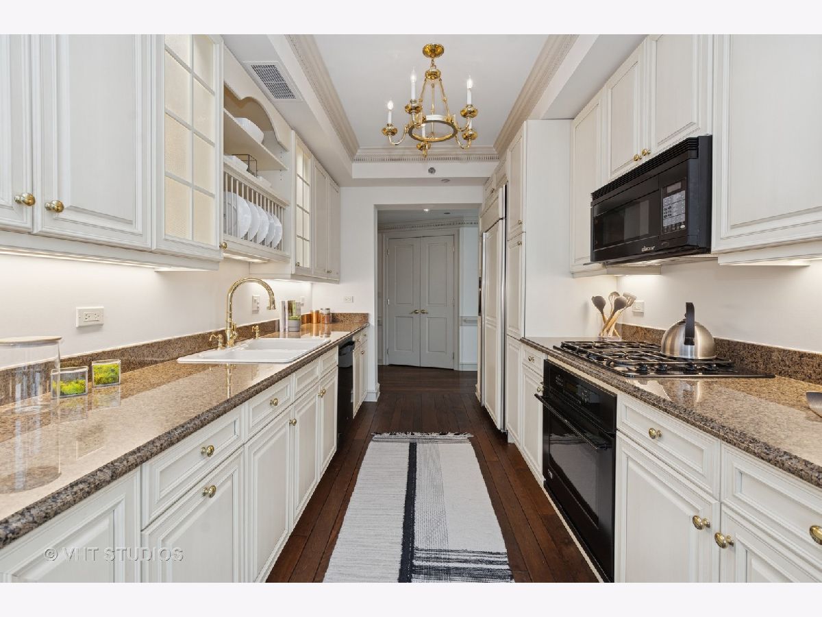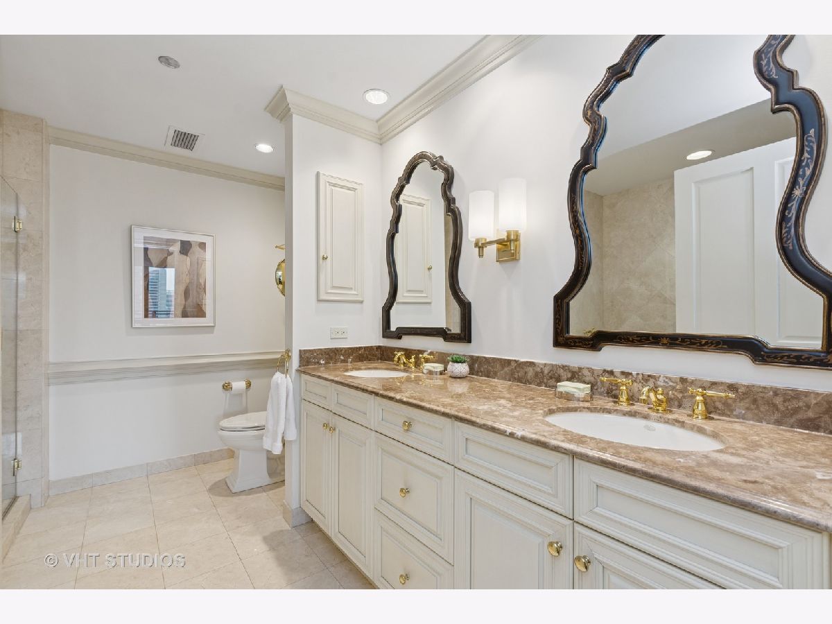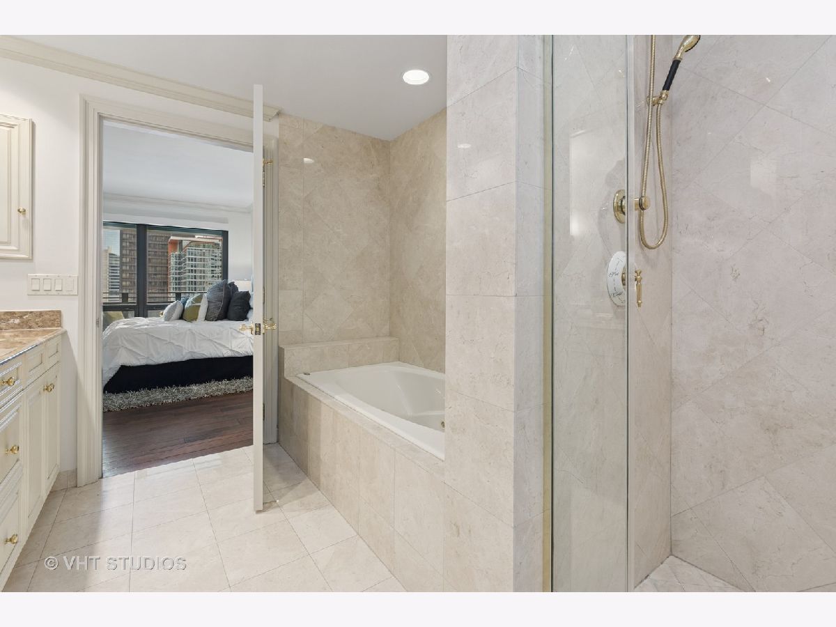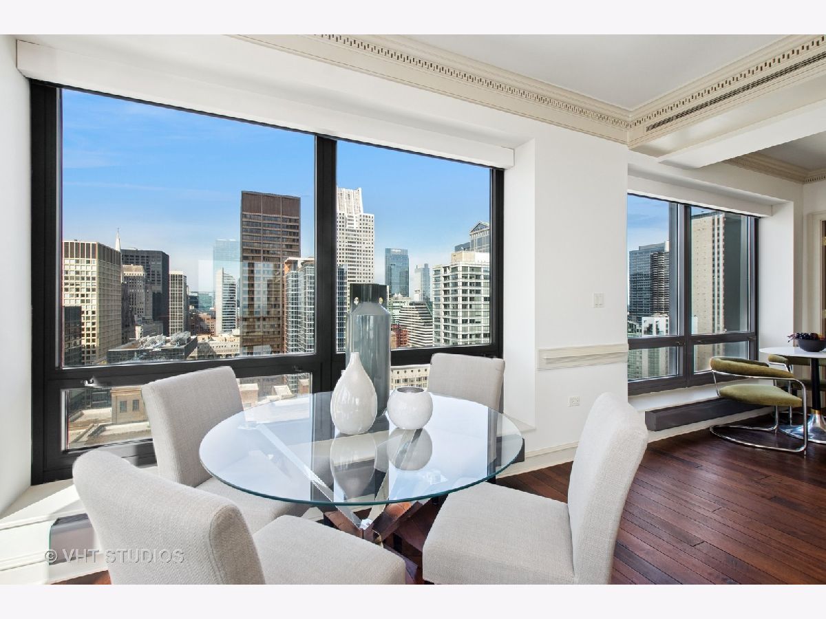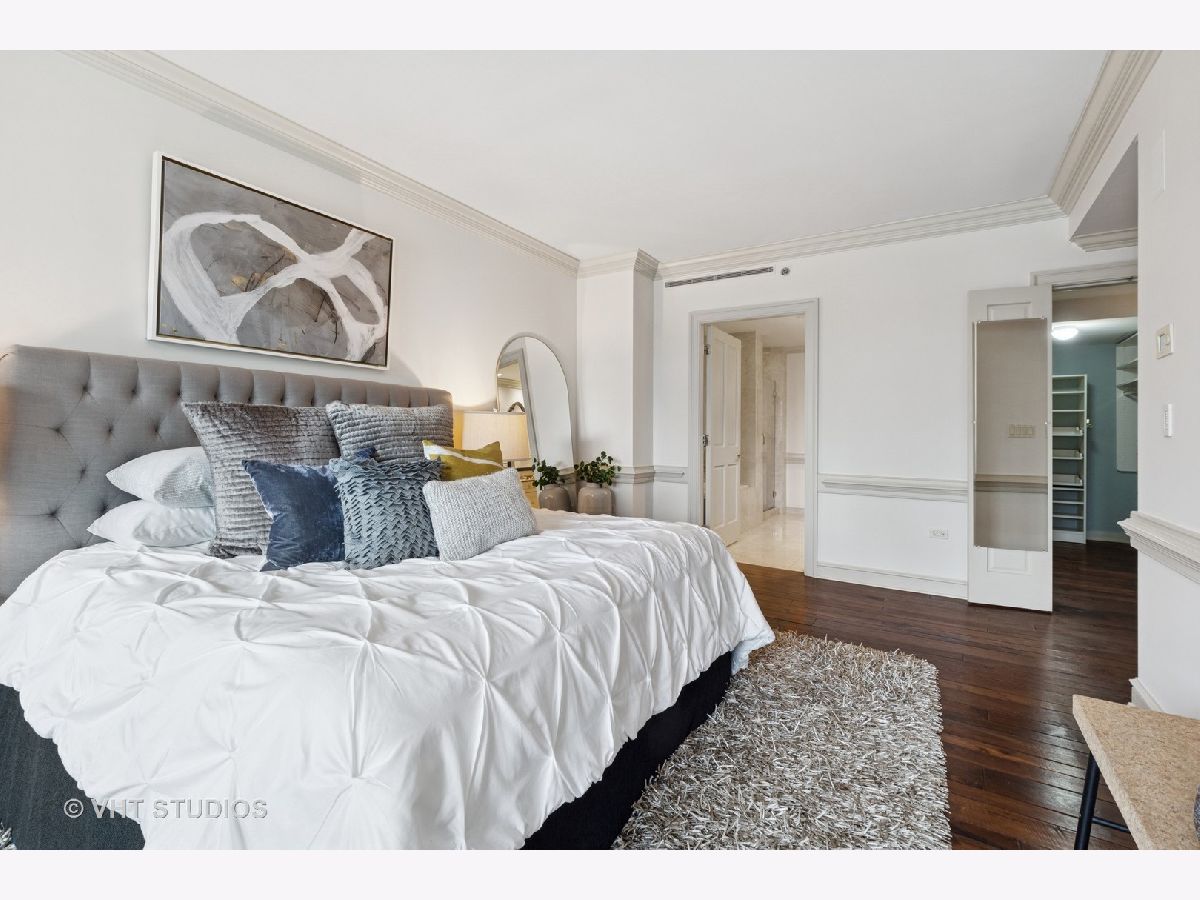 Gracious three-bedroom, 2.5 bath, corner condominium with floor-to-ceiling windows that provide breathtaking views of Lake Michigan, the city, as well as 'The Bean' and the rest of Millennium Park. This 2100 sq ft home, carefully maintained by a single owner, features beautiful built-in cabinetry, solid core doors, plus high quality, hand-scraped, wide-plank walnut floors and custom crown molding throughout. Windows on three sides of the living room / dining area fill the home with natural light, while the room's case work surrounds a gas fireplace, above which a clever sliding panel disguises a built-in television. Centrally-controlled speakers can distribute entertainment to all rooms, including the master bath. The custom kitchen features in-cabinet and under-cabinet lighting, solid brass fixtures, stone countertops, and a pantry. Elegant and practical lighting enhances every room. Electric window shades filter sunlight effectively when needed and remain out of sight otherwise. In-unit laundry facilities are a plus. The home is genuinely move-in-ready; its neutral color selections can easily accommodate a wide variety of interior design styles. The Heritage is a quiet building with courteous and professional 24-hour door staff, on-site management, party and conference rooms, sauna, indoor pool and whirlpool, fitness center, outdoor terraces, dog run, storage, and Pedway access. Located just off Michigan Avenue, the area is within walking distance of shopping, theaters, museums, and restaurants. There is easy access to public transportation (Red, Blue, Orange and Brown lines, plus the Illinois Central train) and nearby highways.