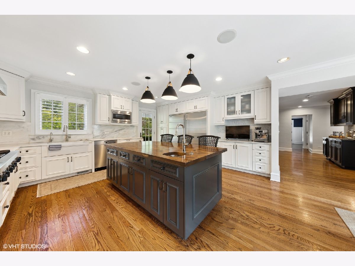 1305 Maple Street is a rare opportunity to own a beautiful turnkey 5 BR home on a spacious corner lot in the highly coveted Old Town pocket of Western Springs. This timeless home incorporates the perfect blend of character with tasteful modern updates, making this a special retreat for easy living. This 5 BR, 3.5 bathroom home sits on a corner lot, with a wraparound stone front porch and a charming white fenced yard. Inside you'll find gorgeous hardwood floors, custom millwork and a floorplan that flows effortlessly for living and entertaining. A formal dining room offers French door access to the porch, and a spacious living room also offers porch access and a wood-burning fireplace. The kitchen was designed for a professional chef, with top of the line appliances, marble countertops and a wood-topped breakfast bar, with an additional prep sink. Two dishwashers make cleanup a breeze. Just off the kitchen, enjoy casual dining in the bay-windowed breakfast nook or relax in the expansive family room with vaulted beamed ceilings, a wood burning fireplace and French doors to the private backyard retreat. The back patio features an outdoor kitchen grill and a bonfire pit, and plenty of space to play. The first floor also offers a large mudroom with large storage cabinets, a laundry room with a sink and a chute, a study area with built-in-desk and a powder room. Upstairs you'll find 4 bedrooms with hardwood floors and custom shutters, including a primary suite with a fireplace, dual closets, and a spa-like bathroom with a freestanding tub, marble shower, and dual sinks. 3 other bedrooms and a spacious hall bath await just down the hall. An attic with stairway entry is also accessible here, offering great storage. In the basement, you'll find a large finished space that includes a rec room, well-appointed kitchenette, full bedroom and bath and an impressive wine cellar. A detached 2.5 car garage offers plenty of additional storage space. Live just blocks to school, parks, town and the train in this charming neighborhood in this one-of-a-kind home.