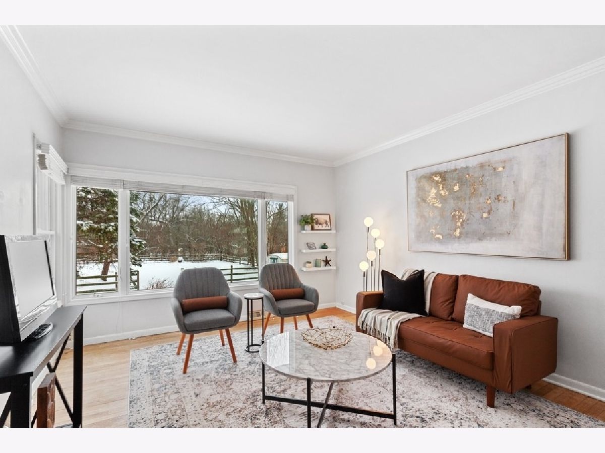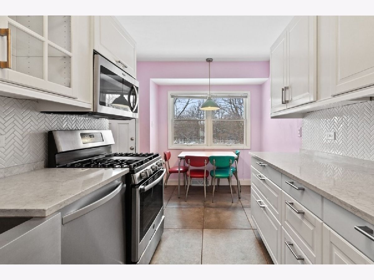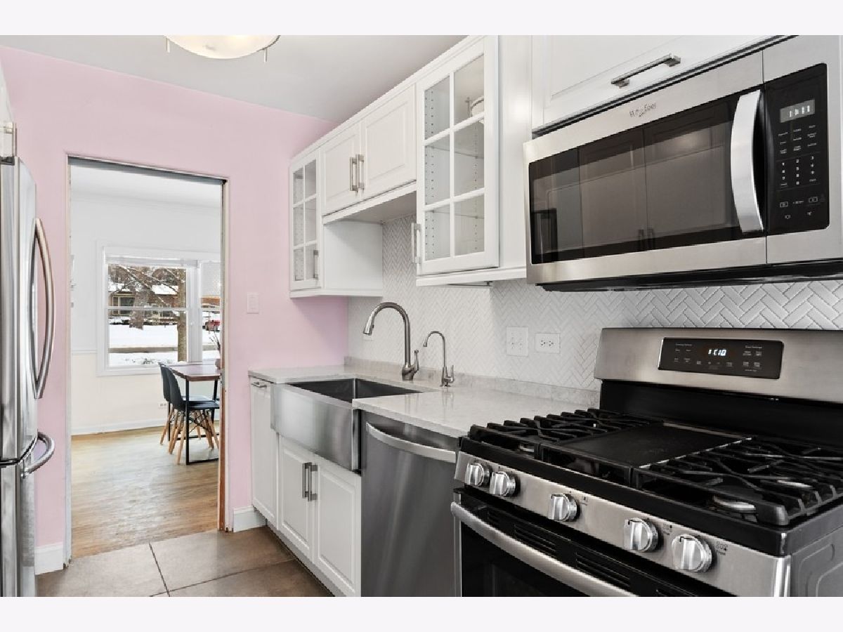Beautifully renovated 2 bed/2 bath modern farmhouse with a serene, fenced backyard bordering wooded Walter B. Carroll Park. Lots of recent updates! Renovated kitchen with white cabinets, gray and white quartz countertops, stainless steel appliances, and farmhouse sink. Renovated first floor bathroom with white subway tile, white vanity, and white quartz countertop. Hardwood and modern gray tile flooring throughout first floor. Cozy gas fireplace in living room. Exterior of the home was painted in October of 2021. Finished basement with a full bath. Newer hot water heater (2018). Newer fence and patio in backyard (2018). Walk/bike to all three schools (Hillcrest Elementary, O'Neill Middle School, and Downers Grove South).
