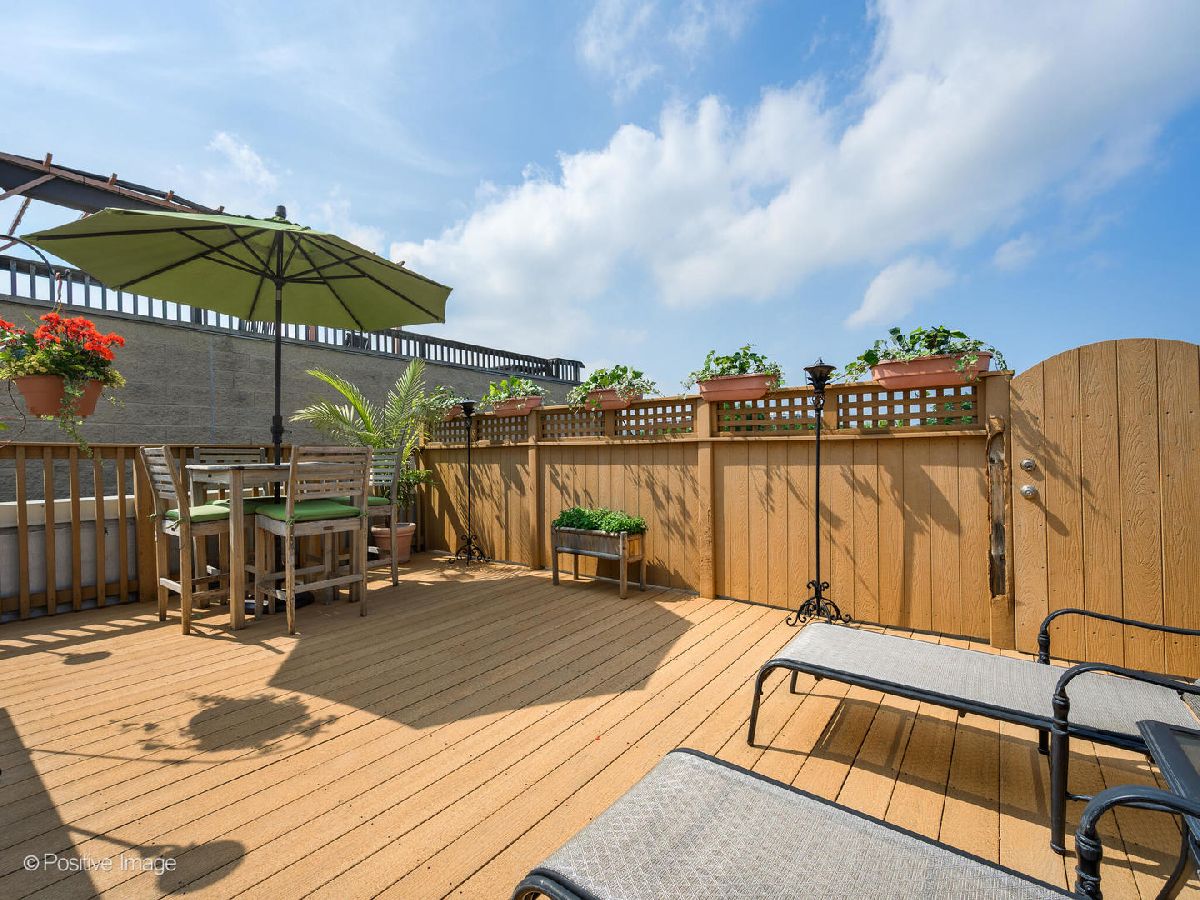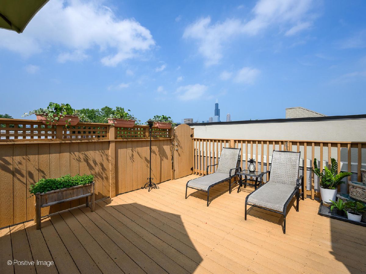 Stunning top floor 3 bedroom 2.5 bath duplex-up with a private roof top deck in a fantastic University Village-Little Italy location. Property is situated on a beautiful quiet tree-lined street. Sunny South facing large open living area with wood burning/ gas starter fireplace and hardwood floors throughout. Spacious open kitchen features granite counter tops, neutral wood cabinets and matte black appliances conveniently located next to the dining area/family room that can accommodate generous size dining table or a sitting area. Huge private deck off the kitchen is perfect for family gatherings and entertainment. 3 bedrooms and 2 bathrooms located on the 2nd floor. Main floor has a powder room. Washer and dryer in the unit. Gorgeous private roof top deck with beautiful skyline views. Beautiful landscaped shared back yard in the back and the front of the home. 1 garage parking space included in price. Self-managed 2 unit building. Pet friendly. Prime location near West Loop, Greektown, Pilsen and South Loop. Easy access to Downtown. Steps from trendy restaurants on Little Italy's Taylor Street, University of Illinois Chicago, Rush hospital, Roosevelt mall, grocery stores, movie theater and many parks. Easy access to Racine Blue Line Stop, Pink line, busses, I-90 and I-290 express ways.
