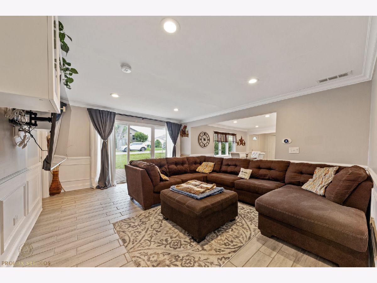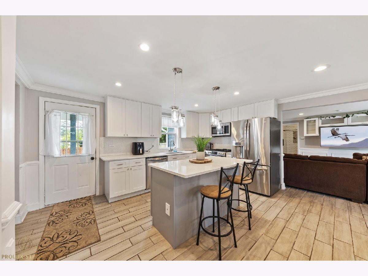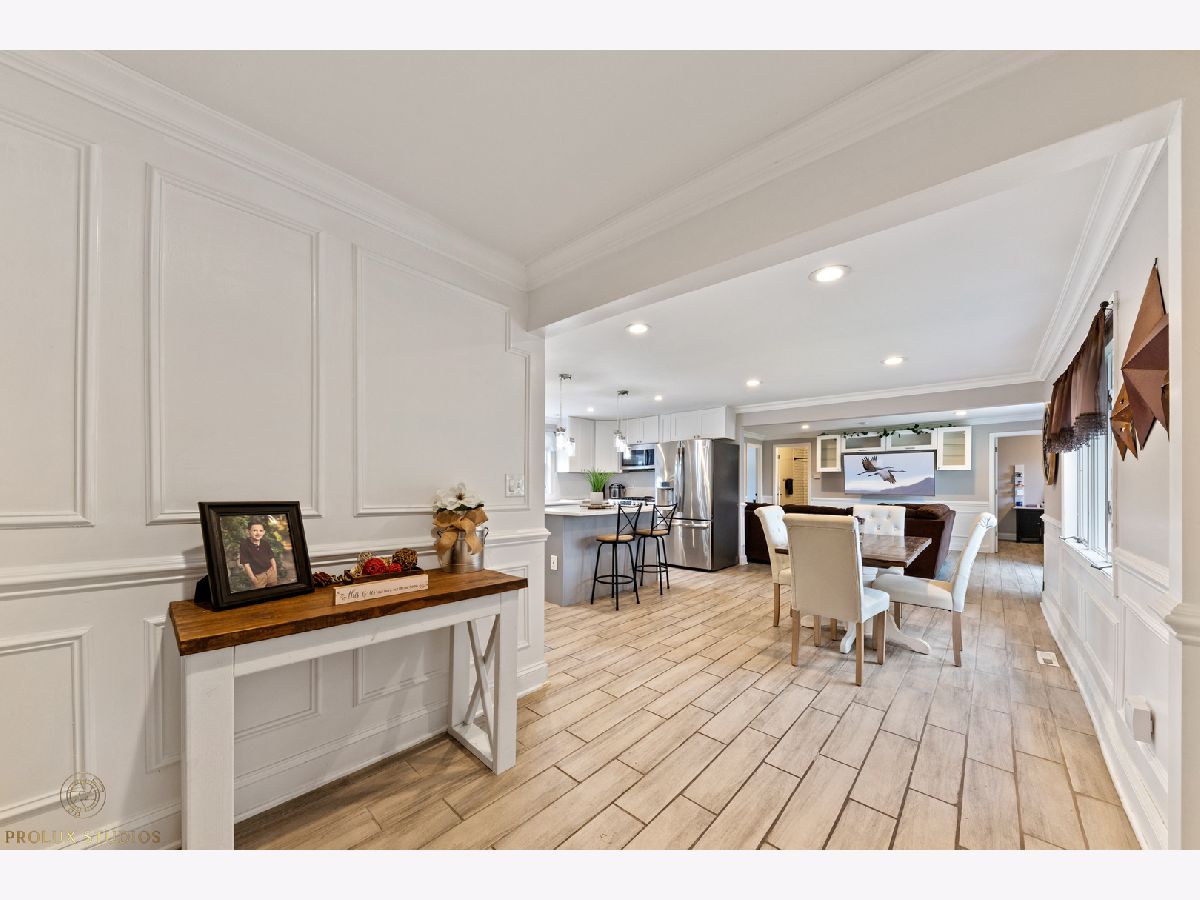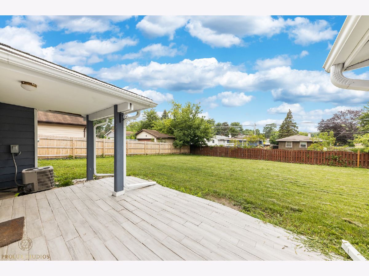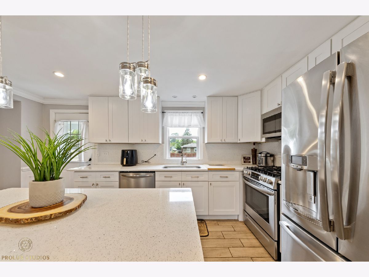 Home completely remodeled in 2020. Open concept kitchen, dining, & living room featuring porcelain tile floors. Upscale crown moldings & wainscoting throughout. Upgraded light fixtures, new doors & handles. Kitchen has white shaker cabinets w/crown molding, back-splash, quartz counter-tops, stainless steel appliances. 3 Bed, primary bedroom with new porcelain tile and full bath with vanity, custom shower walls & floors. Shared bath features custom wall and premium vanity. Great patio and large fenced yard. Double lot close to schools, park, & Metra. New Furnace & fence. Water heater, roof, plumbing and remodel done 2020